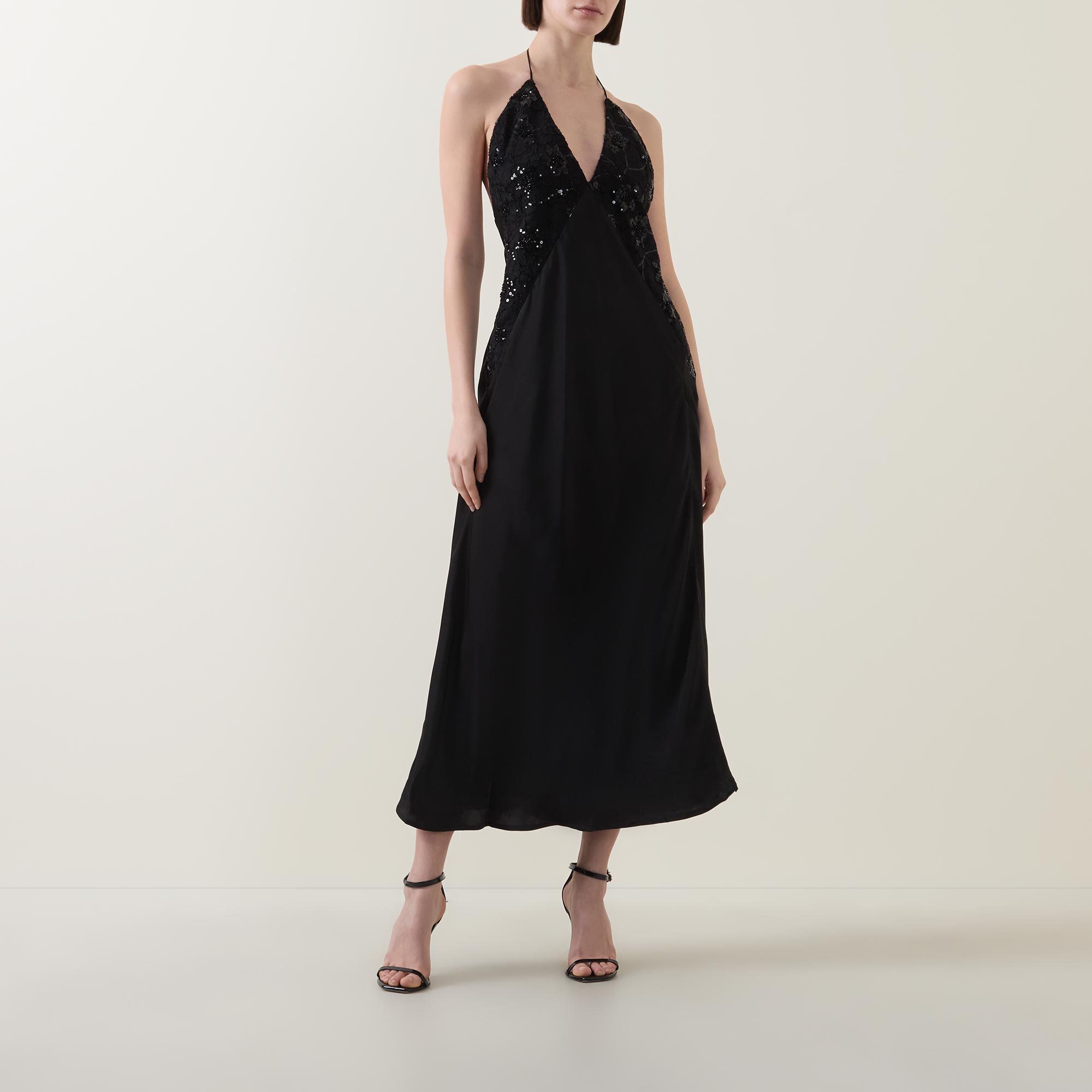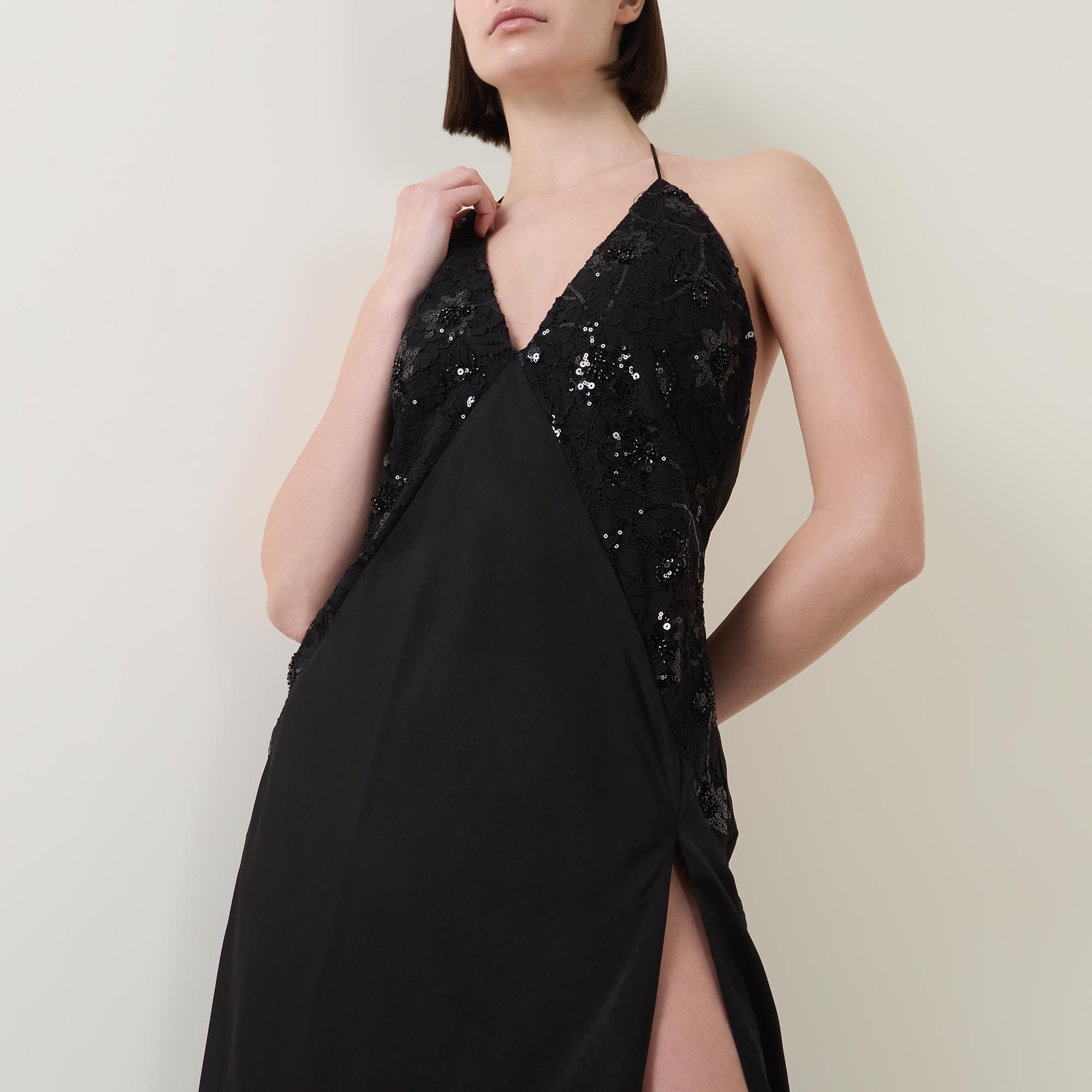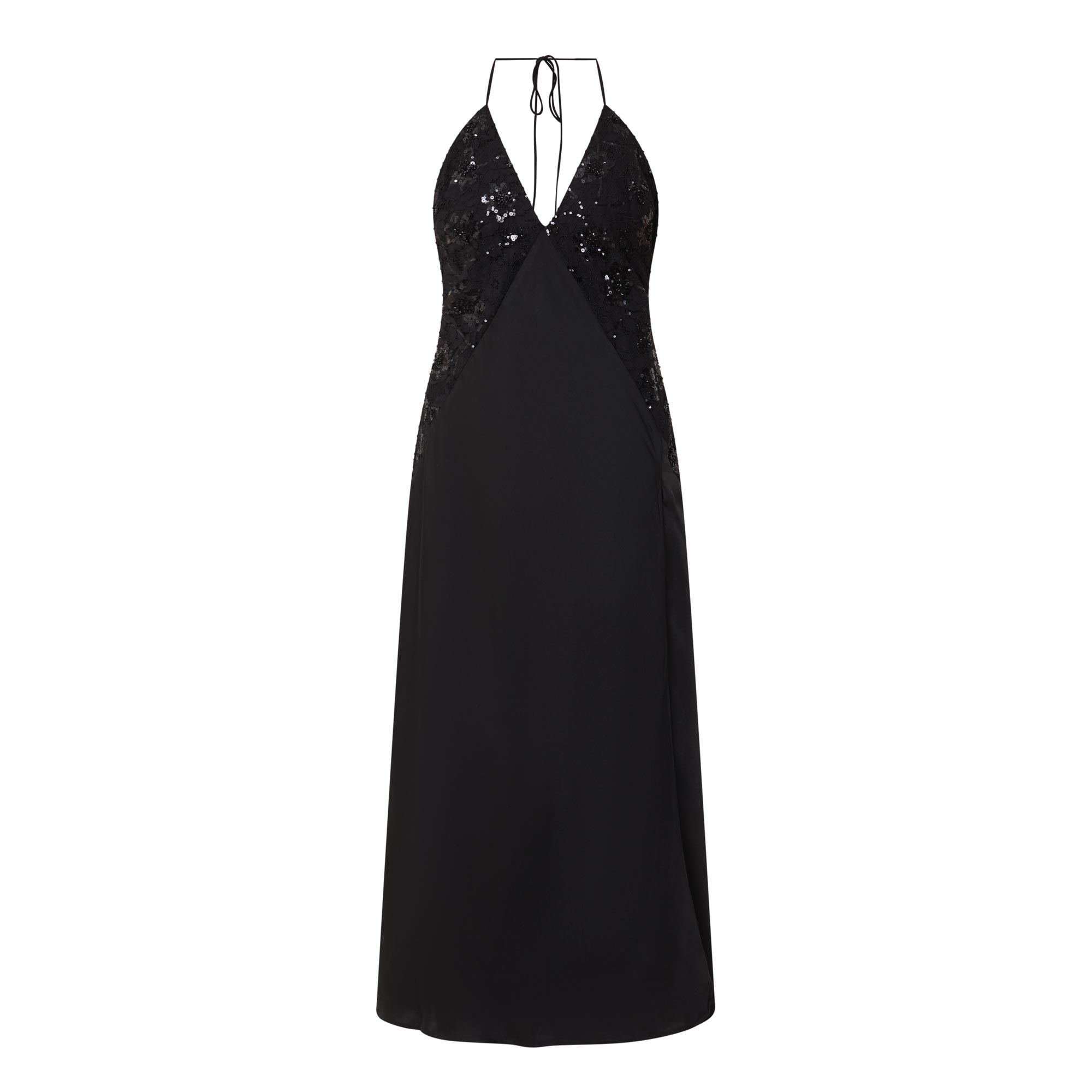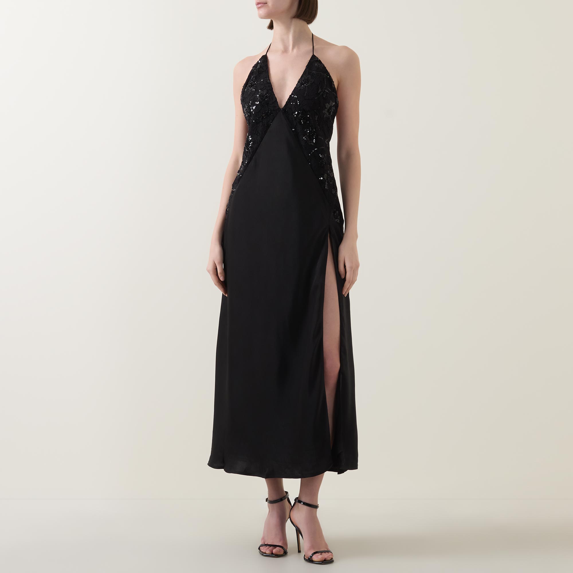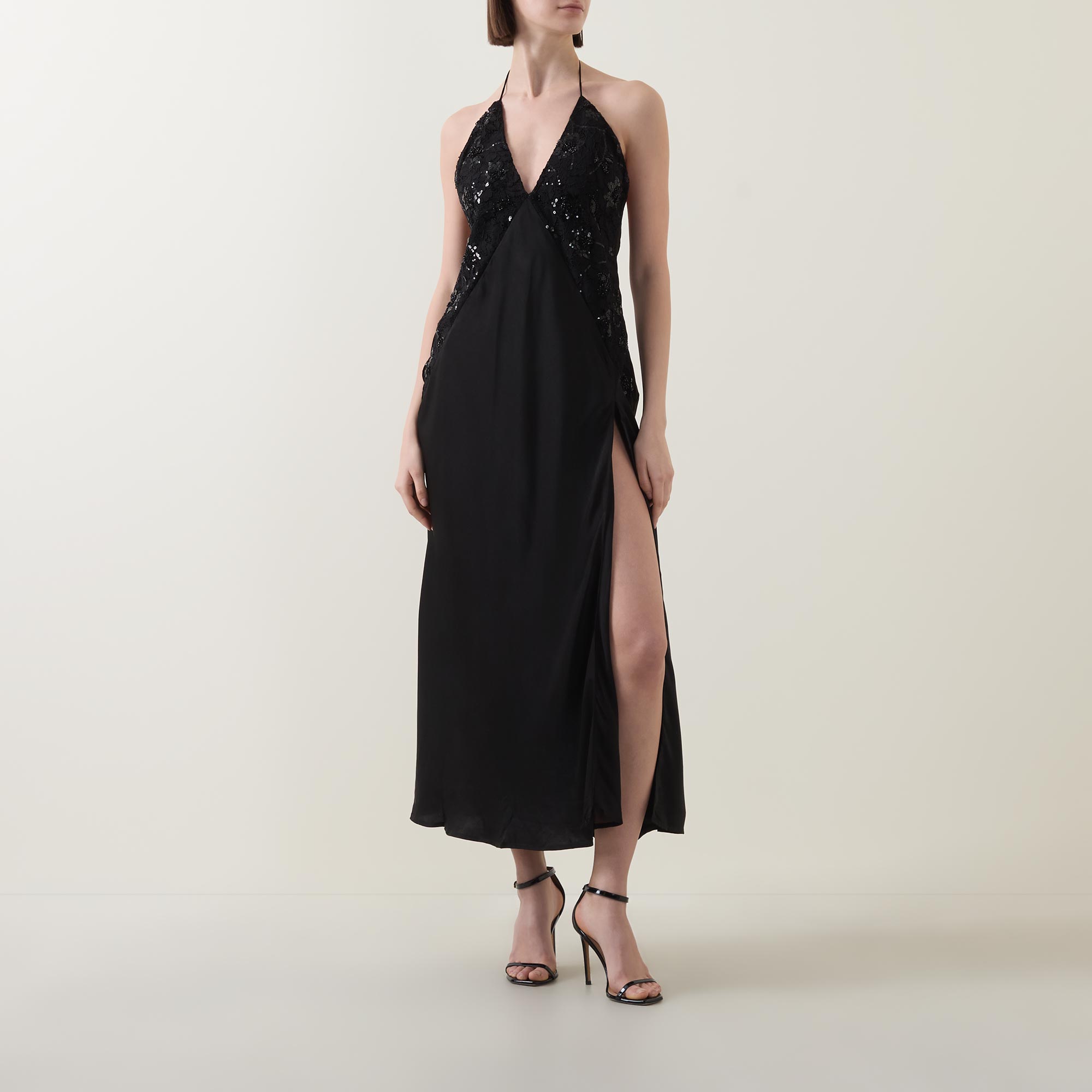 • Plunging V-neck, halter tie fastening, sleeveless design, delicate beaded lace panels, low back, bias-cut, thigh-high split, flared hem, smooth finish, midi length