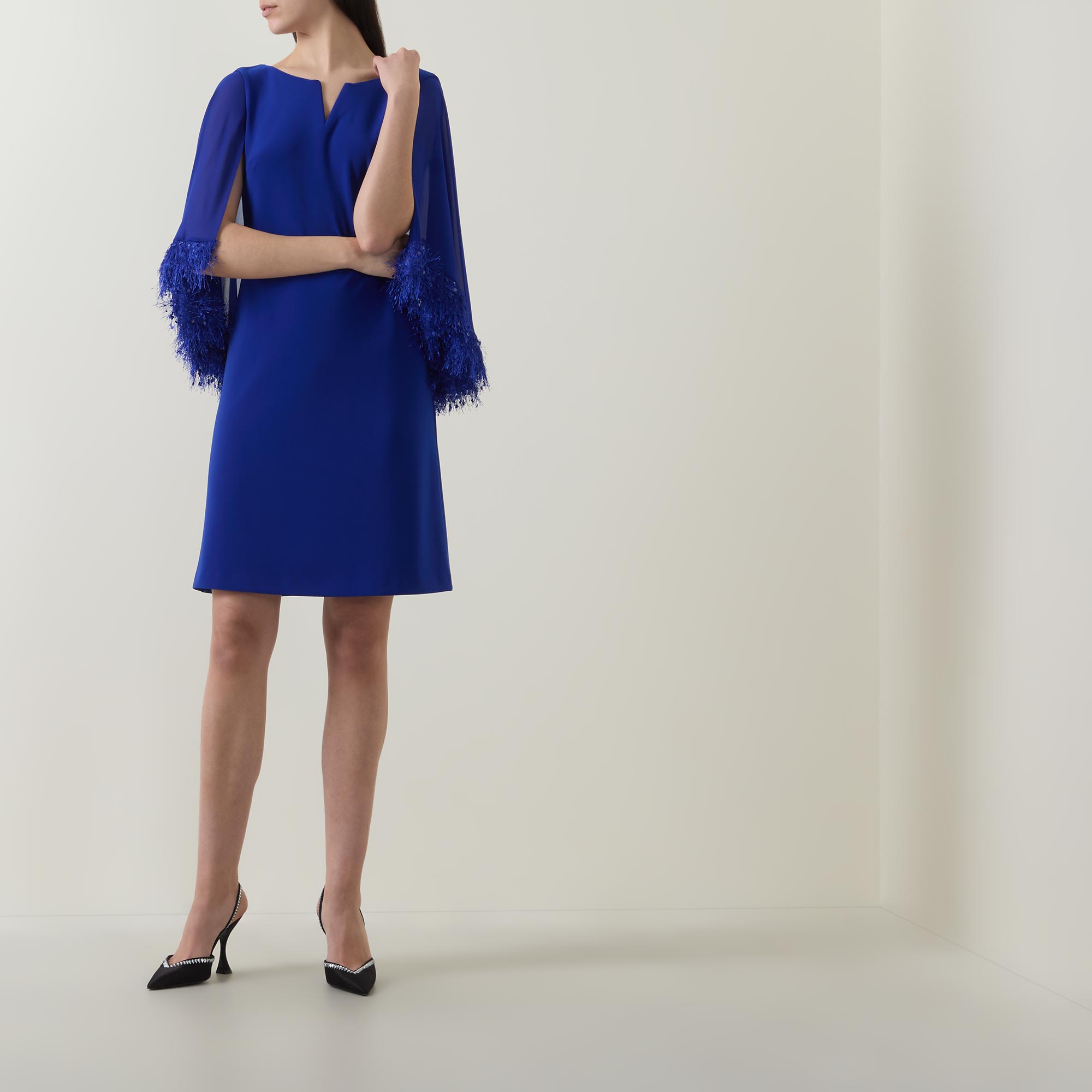 - Feather trim, round neck, split collar, cap detail, midi length