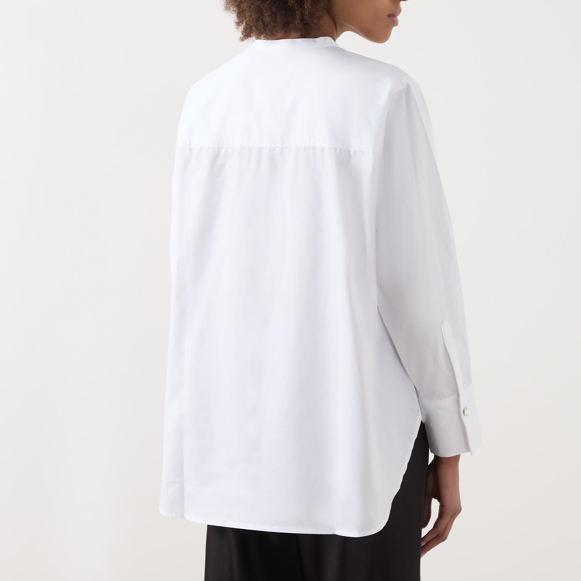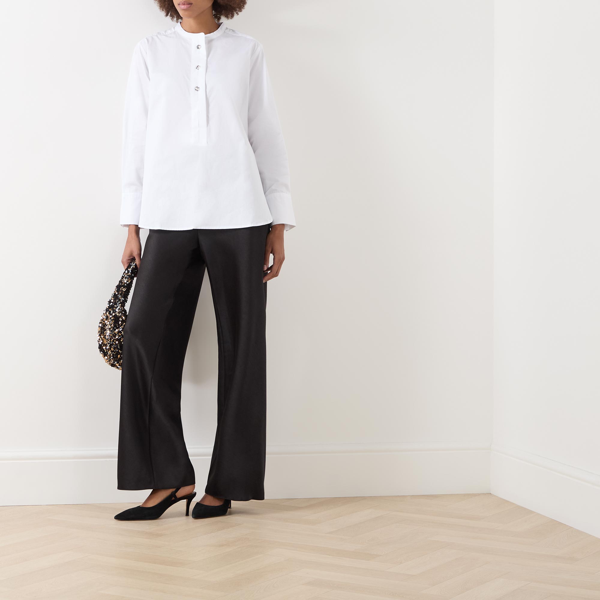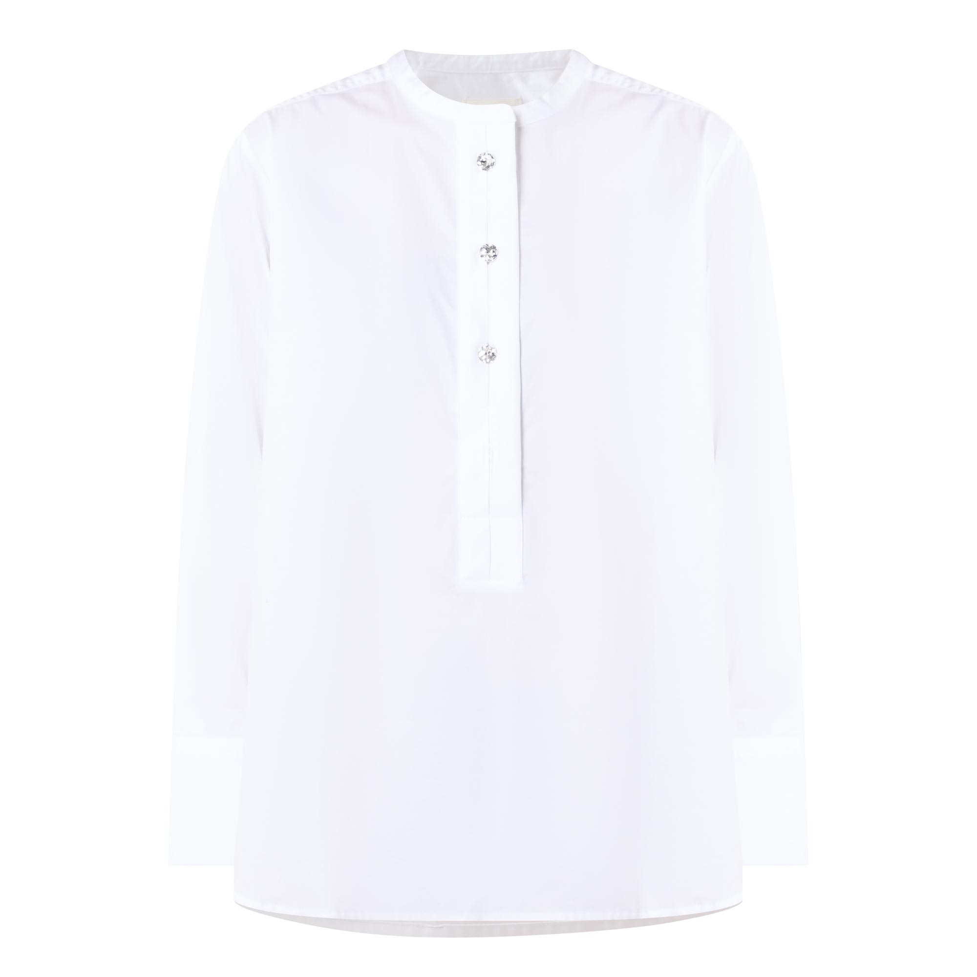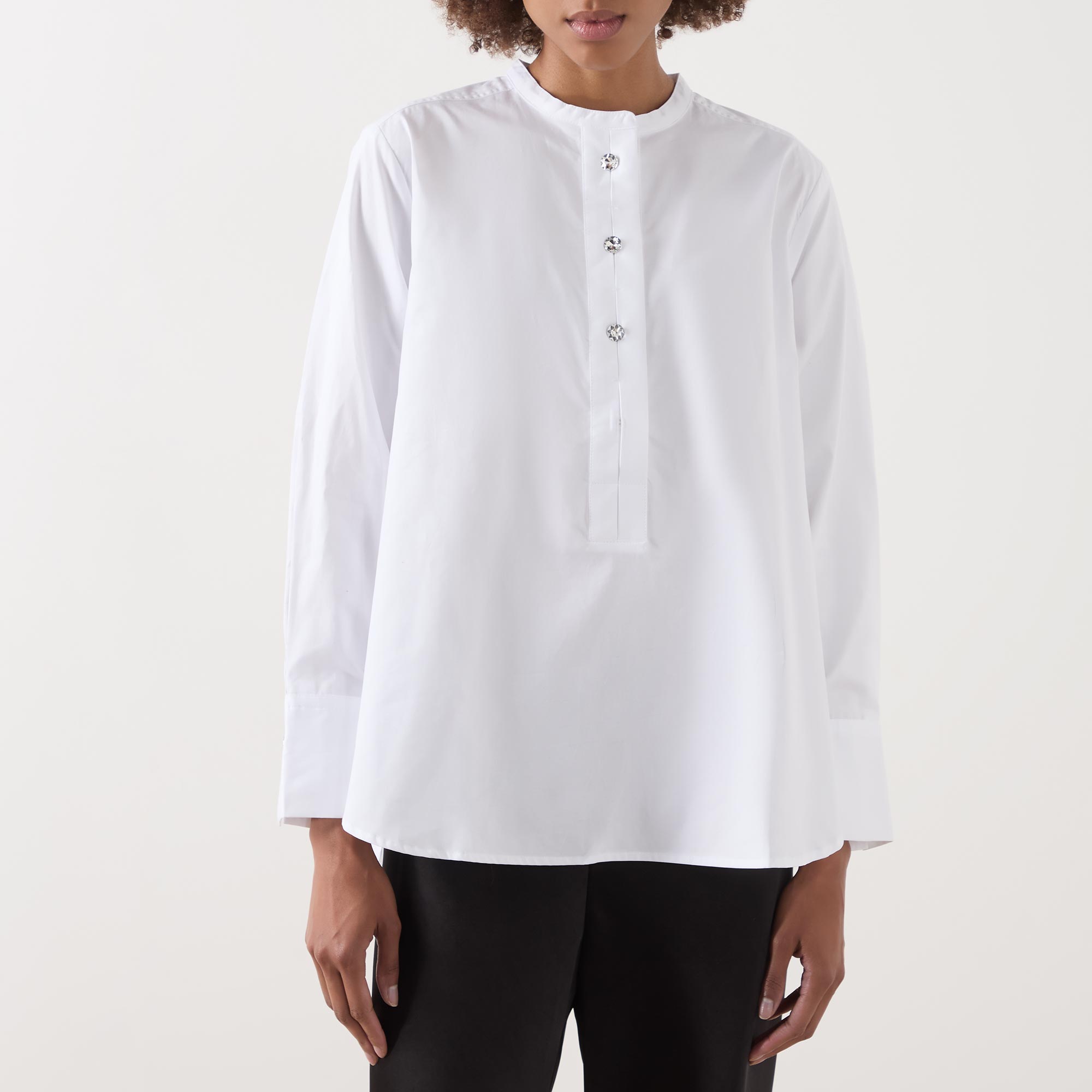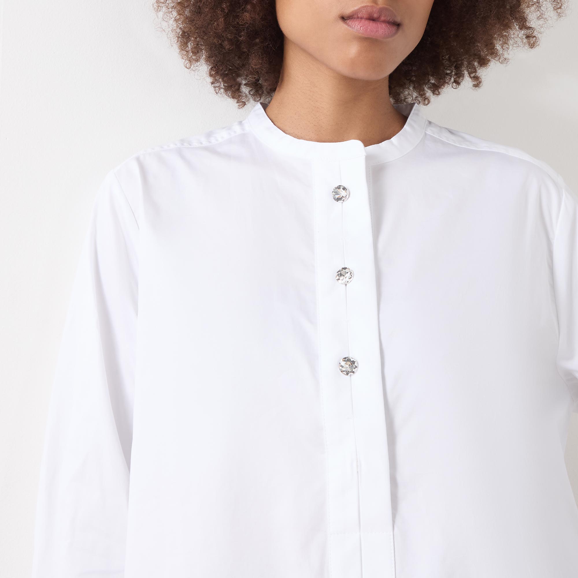 - Embellished buttons, long sleeves, concealed button placket, stand collar, buttoned cuffs