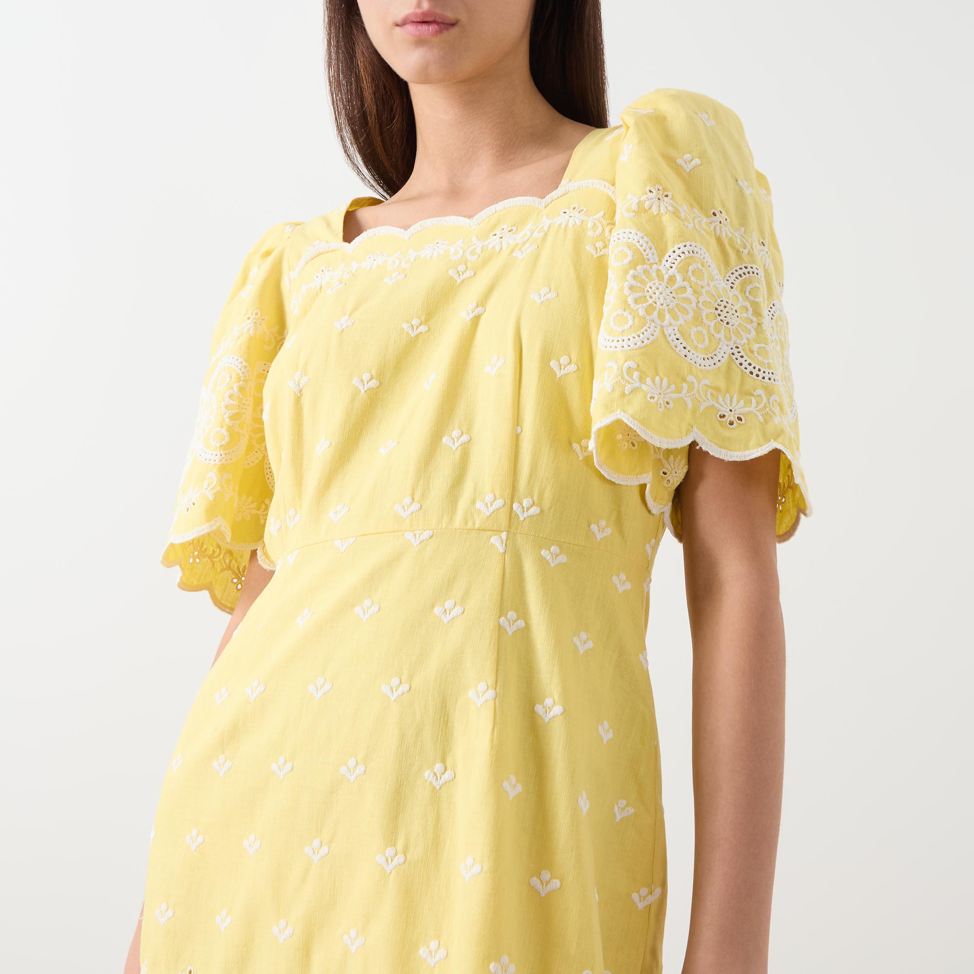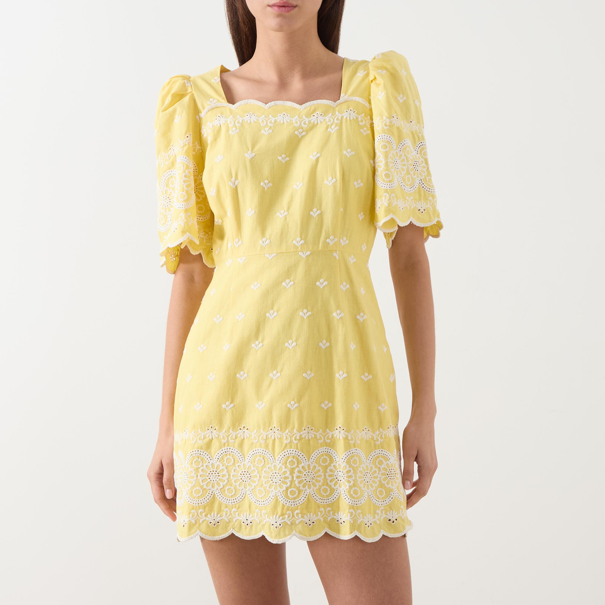 - Scalloped square neckline, puff shoulders, short sleeves, fitted through the waist, rear zip fastening, scalloped hem, embroidered detailing throughout, mini length