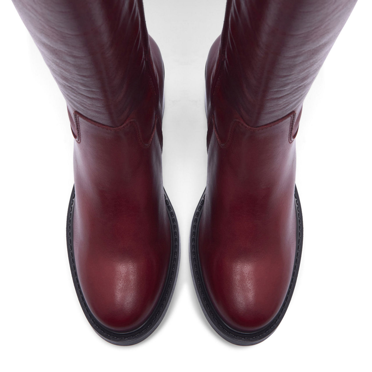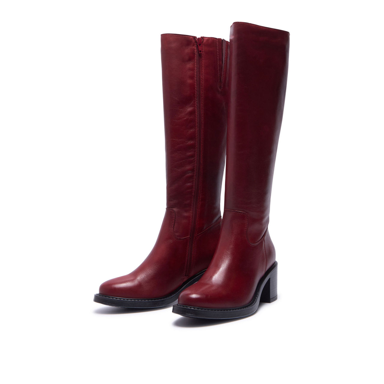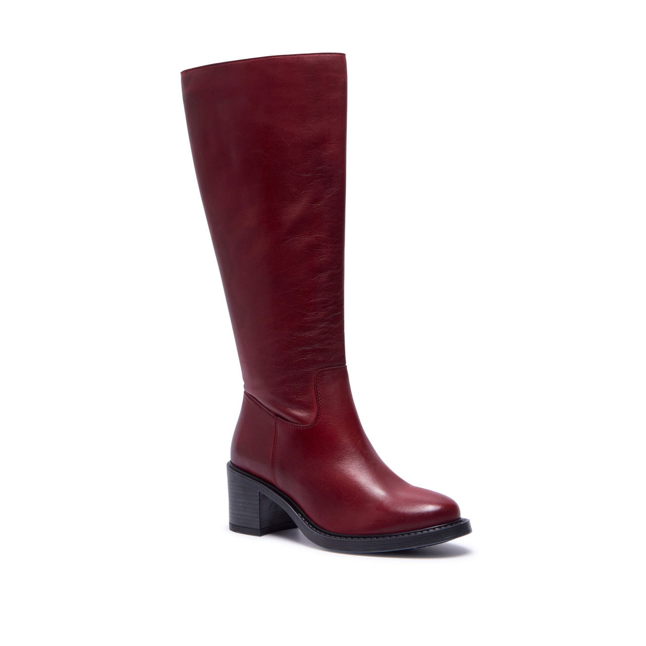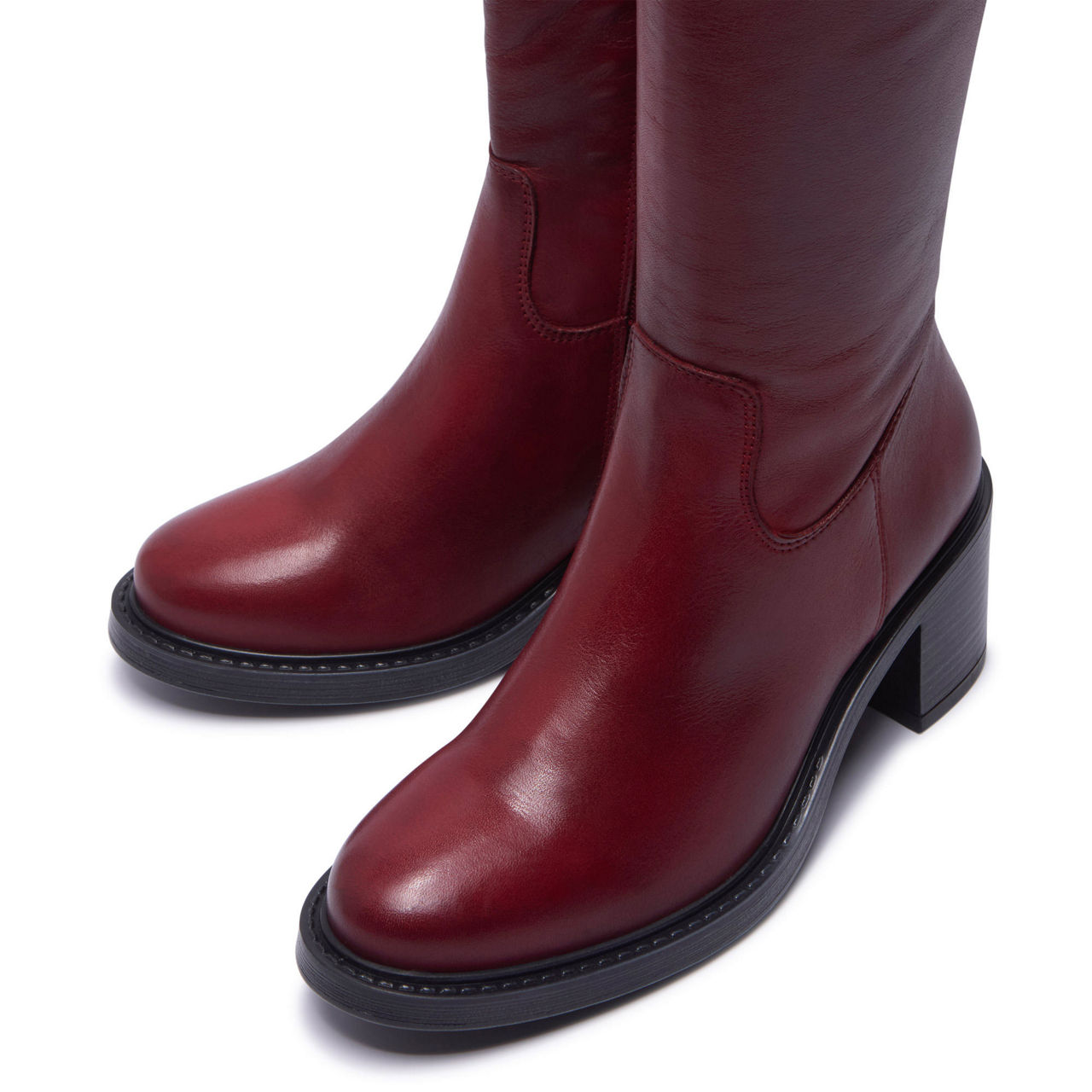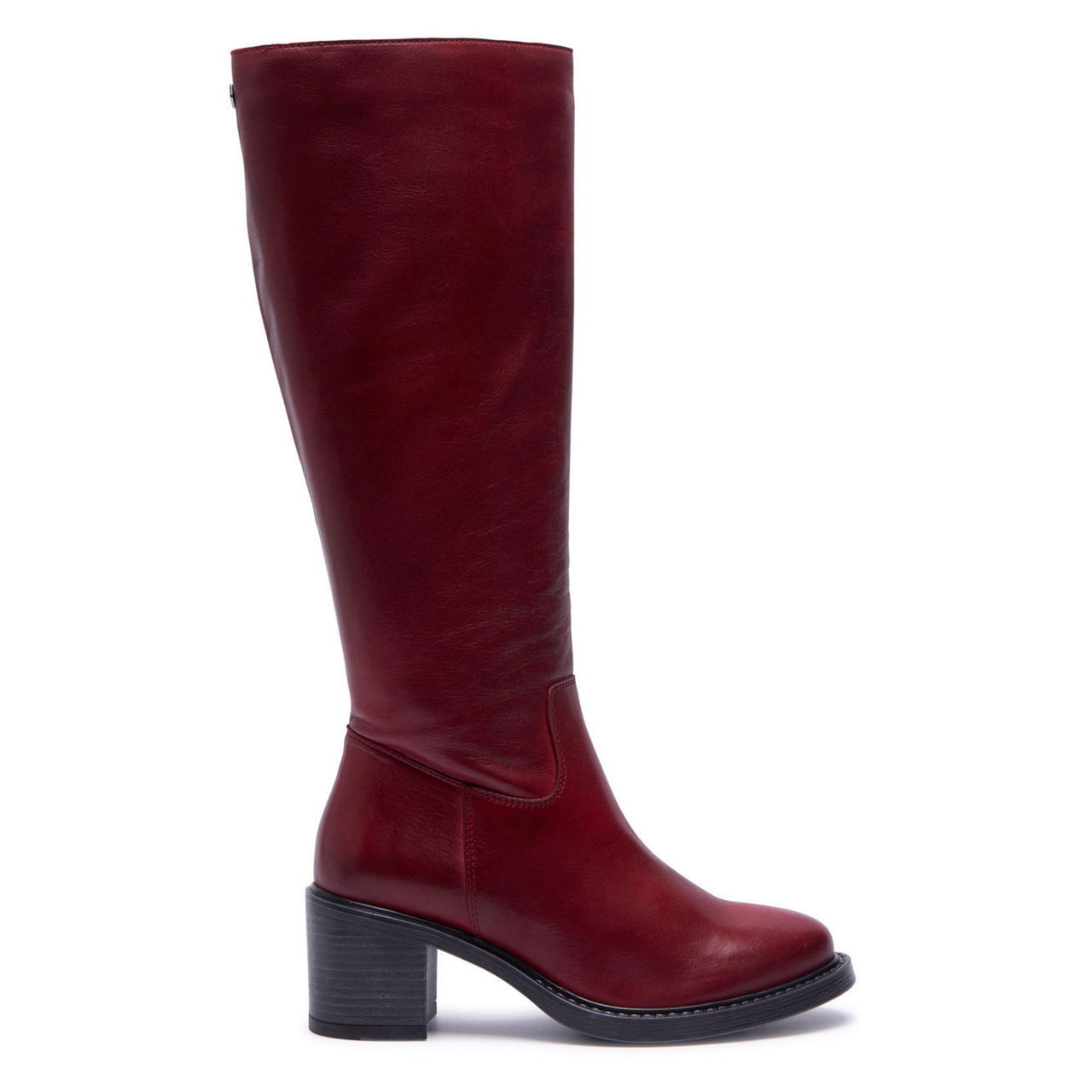 - Knee-high style, smooth leather finish, inside zip fastening, discreet elasticated panel detail, block heel, round toe