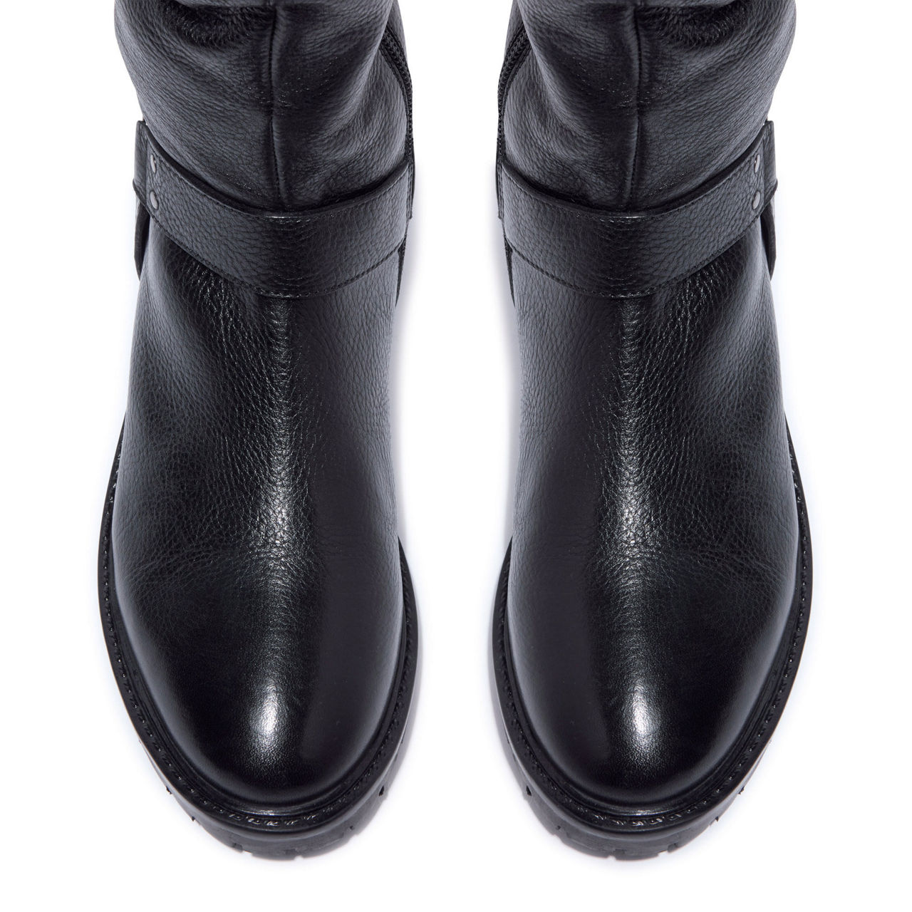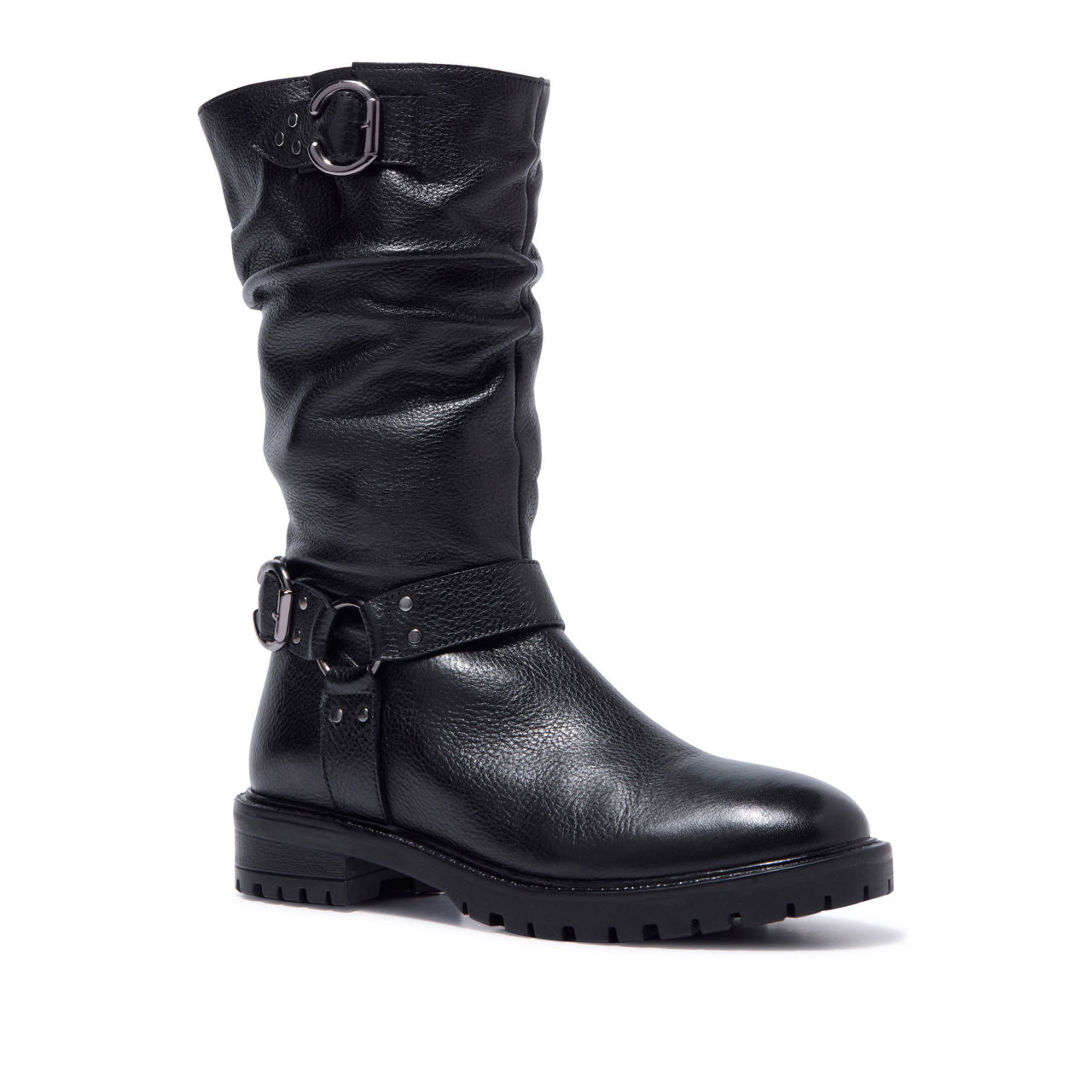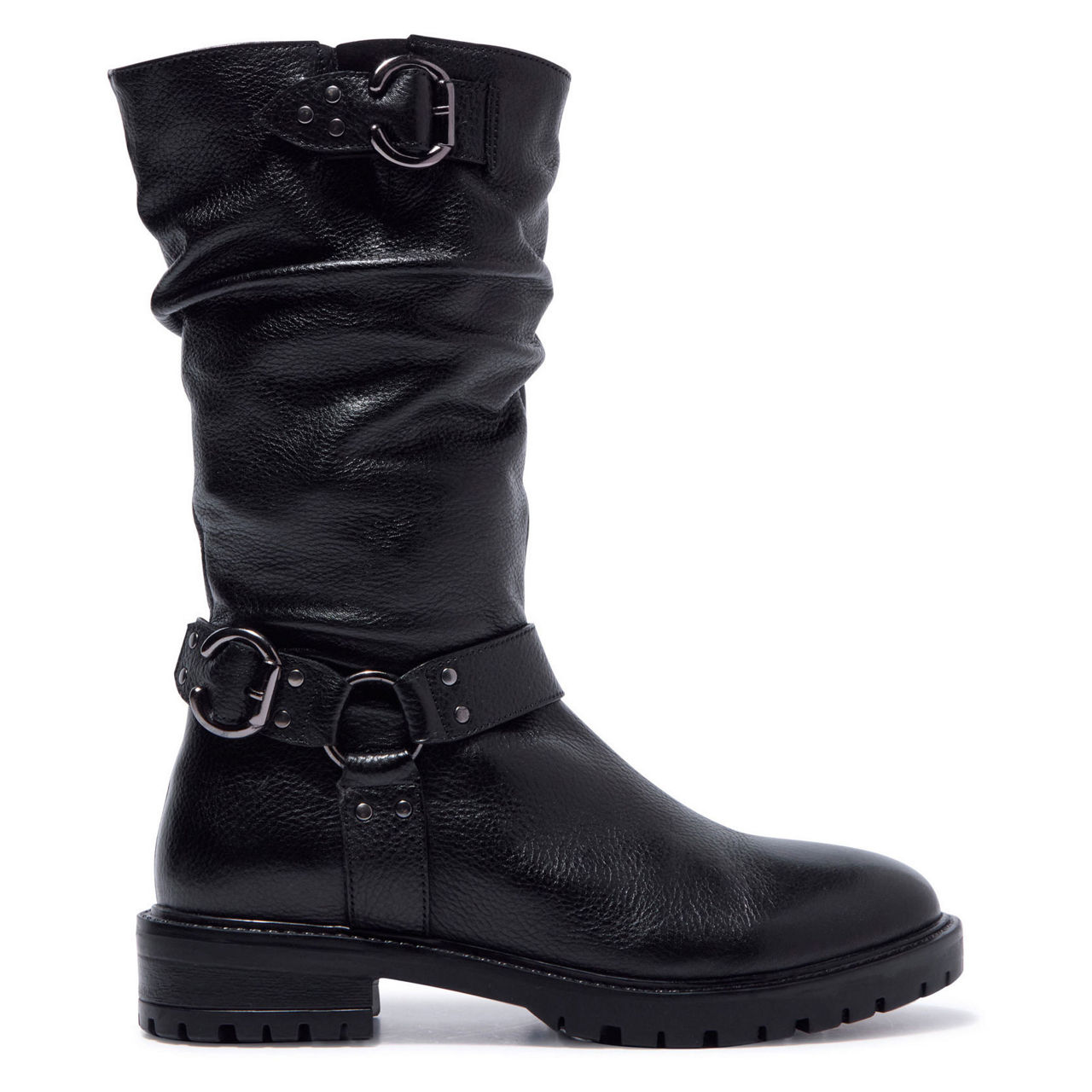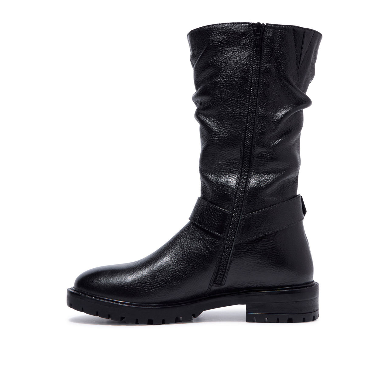 - Leather upper, low heel, gentle ruching, buckle hardware and stud details, inside zip, elastic gusset, leather lined