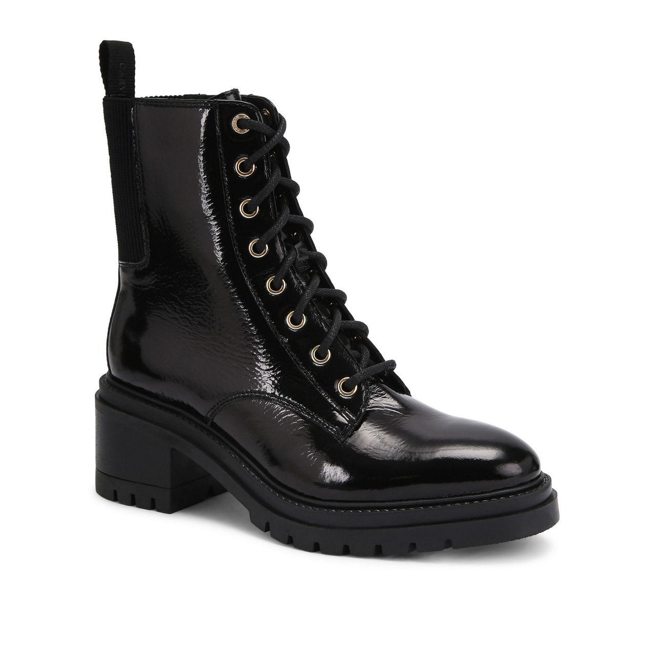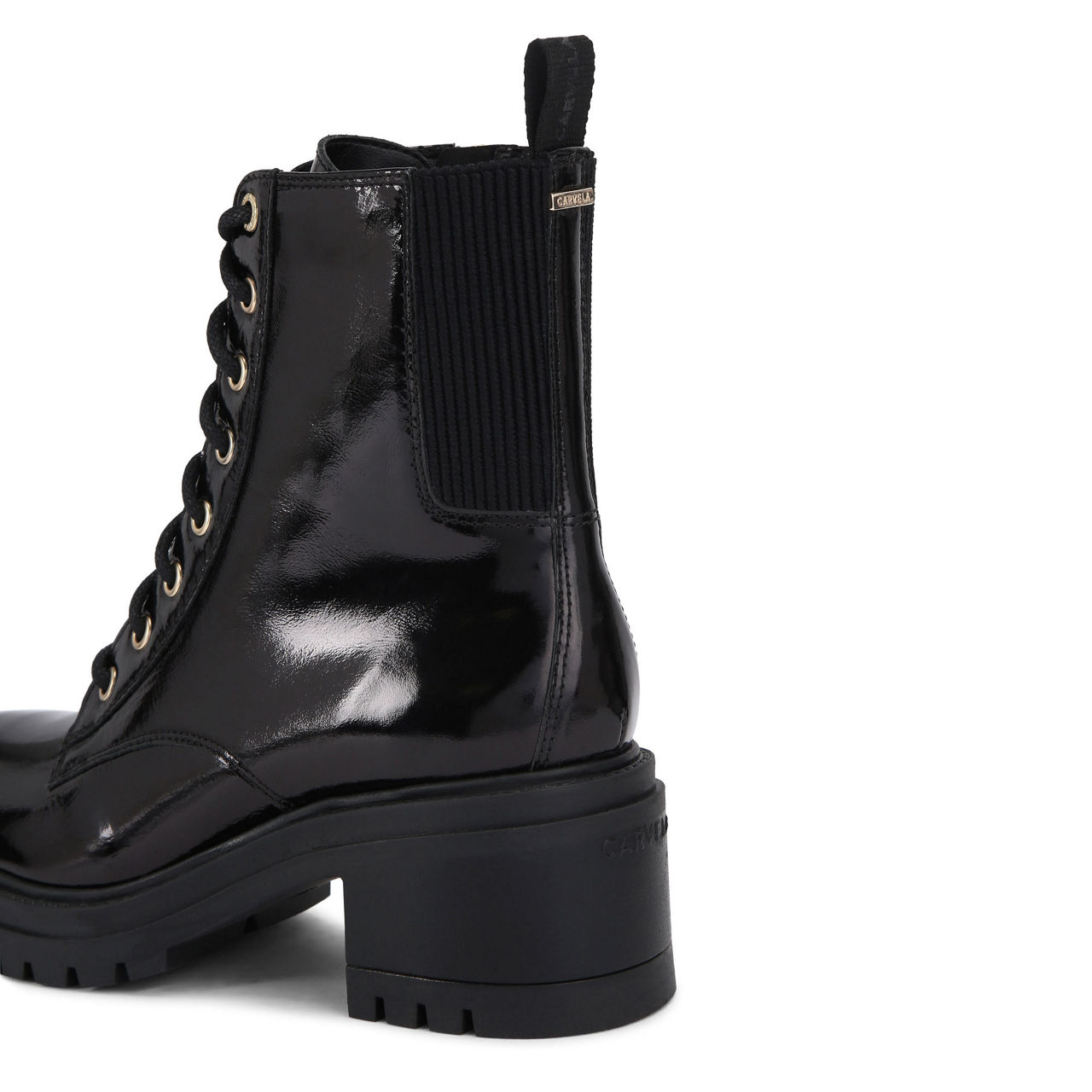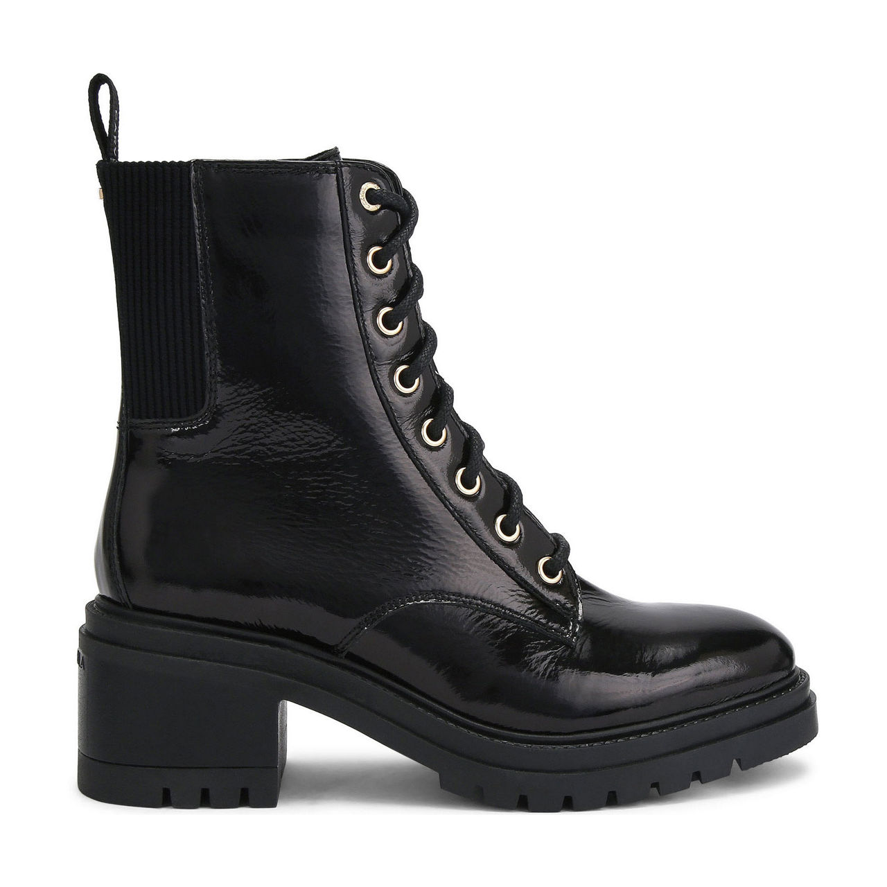 - Round toe, block heel, pull tab at back, lace-up fastening, elasticated panel at back, logo hardware, glossy finish