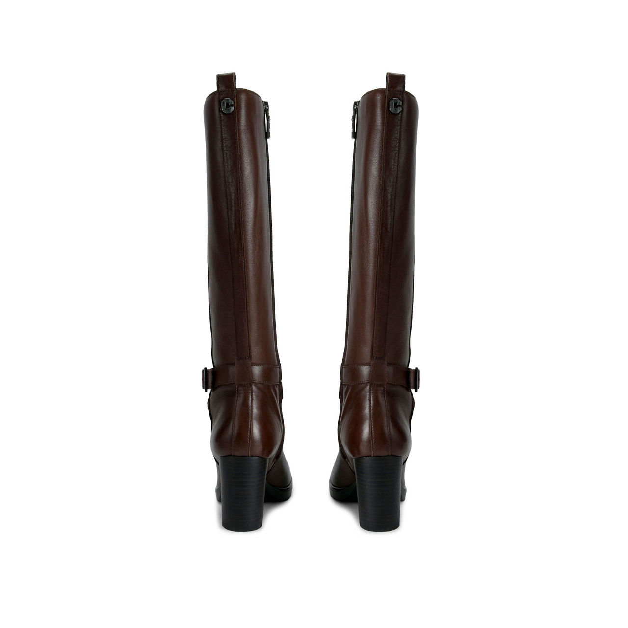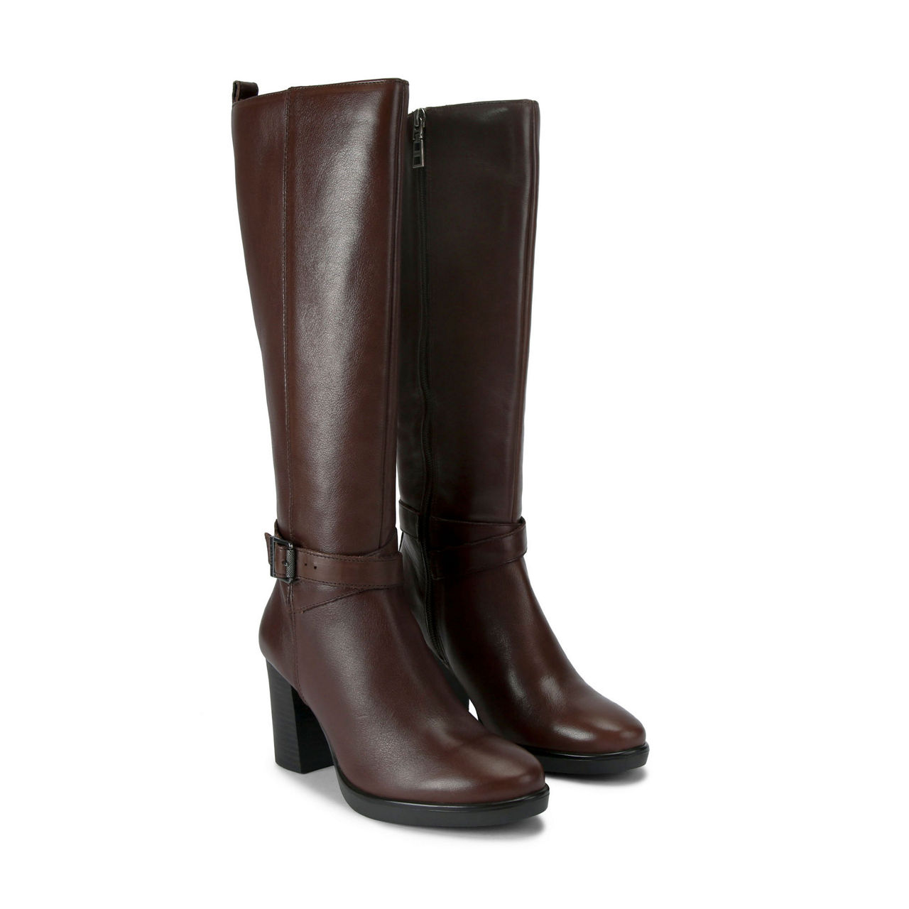 - Leather upper, gunmetal buckle, zip fastening, block heel, round toe, knee-high style, heel pull tab