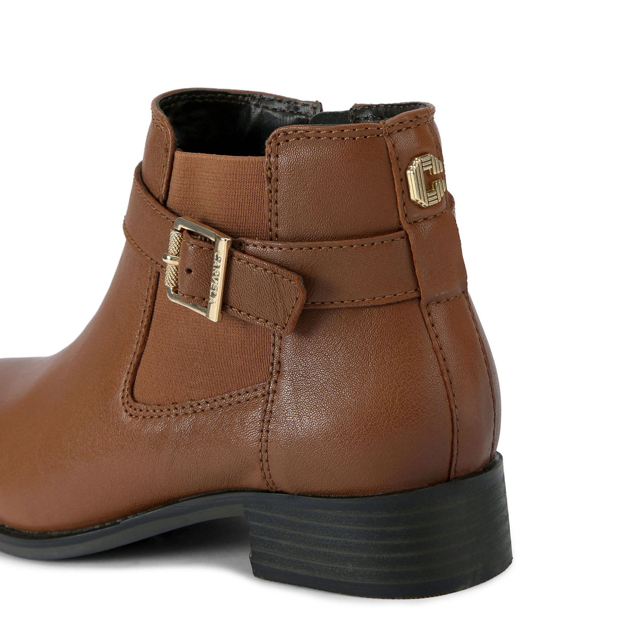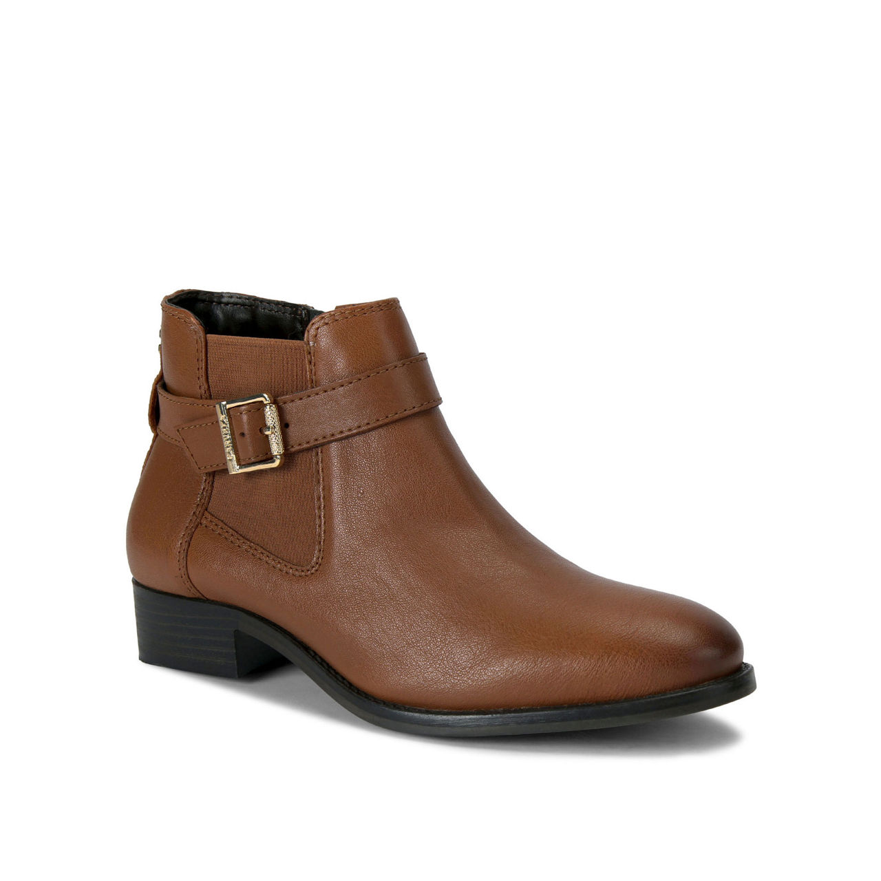 - Leather upper, gold-tone buckle, brand stud, ankle height, block heel