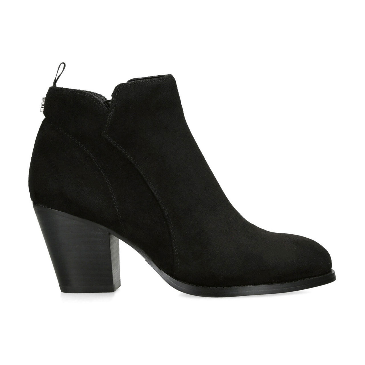 - Almond-shape toe, block heel, pull tab at heel, side-zip fastening, suede finish, logo hardware embellishment
