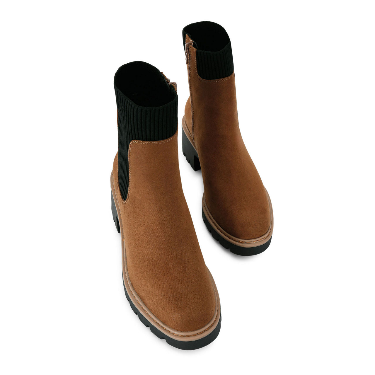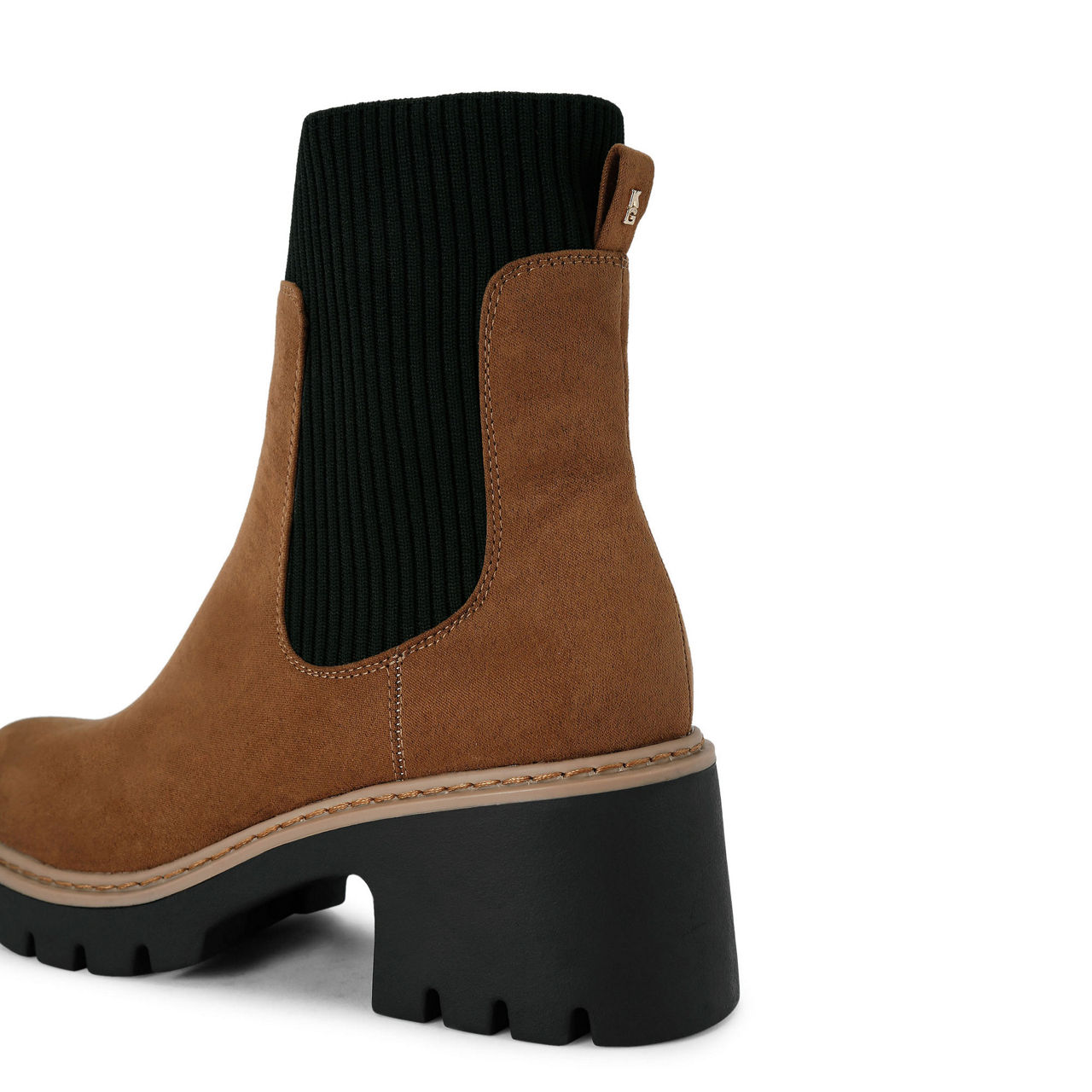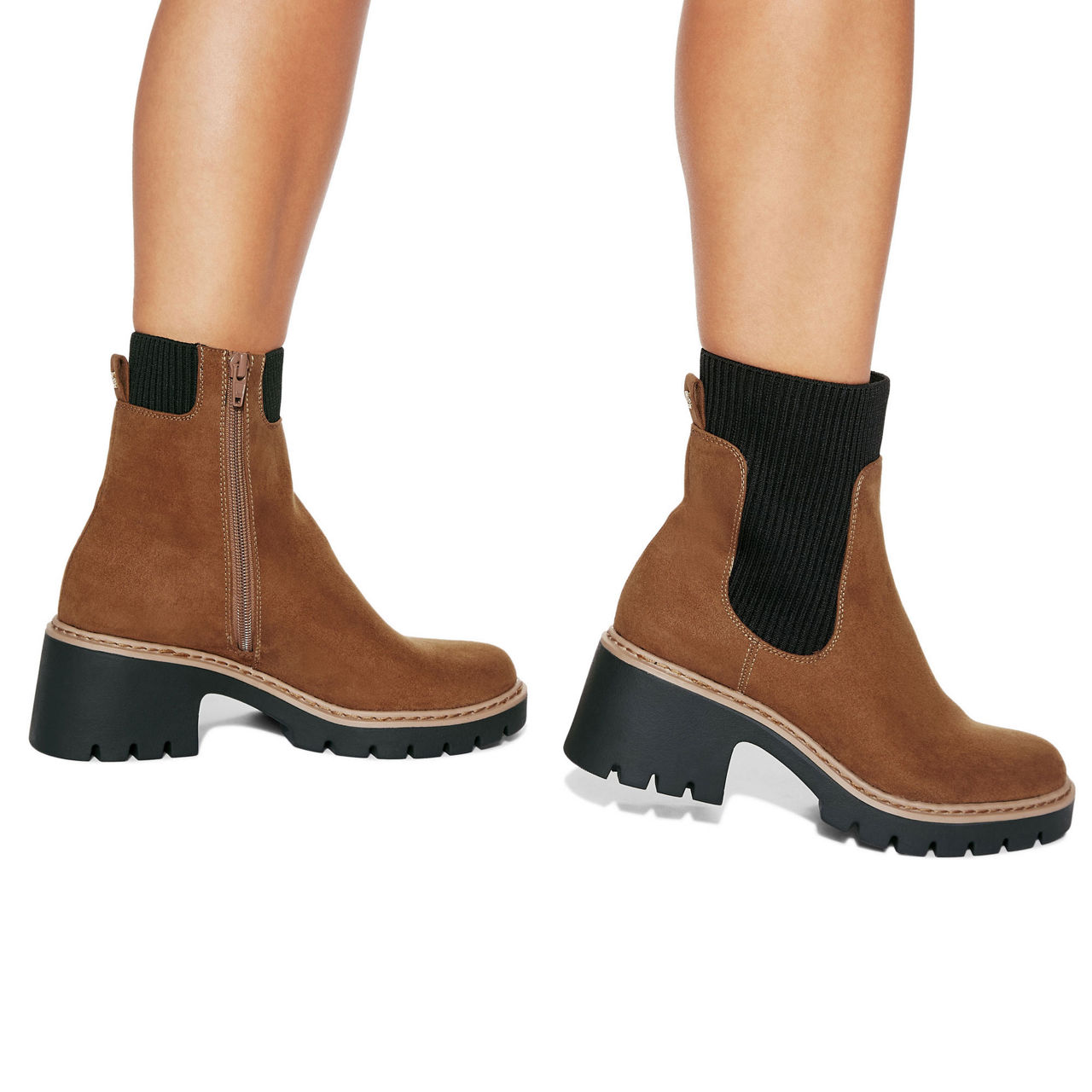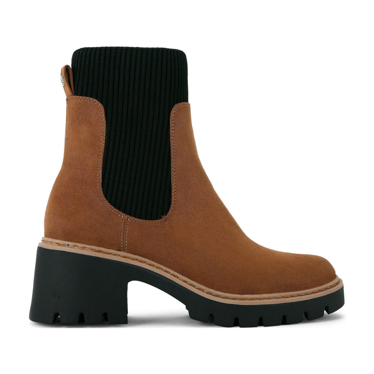 - Microsuede finish, round toe, side zip fastening, ribbed elasticated panel, block heel, branded heel pull tab