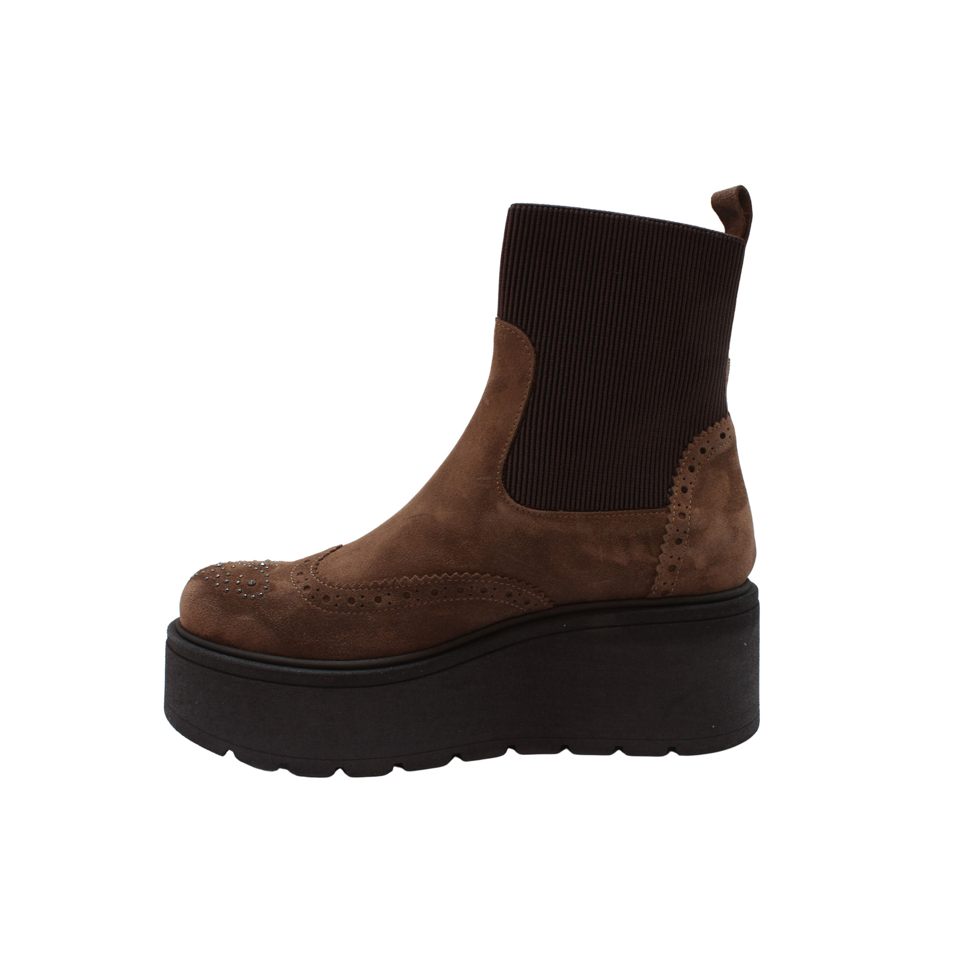 The velour suede upper in warm taupe is framed by brogue-style perforations, while the ribbed stretch shaft hugs the ankle for a glove-like fit and effortless slip-on wear.