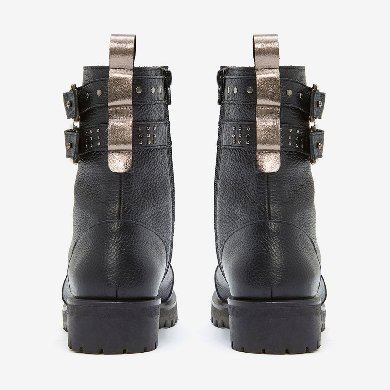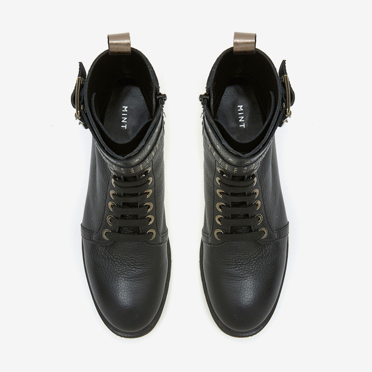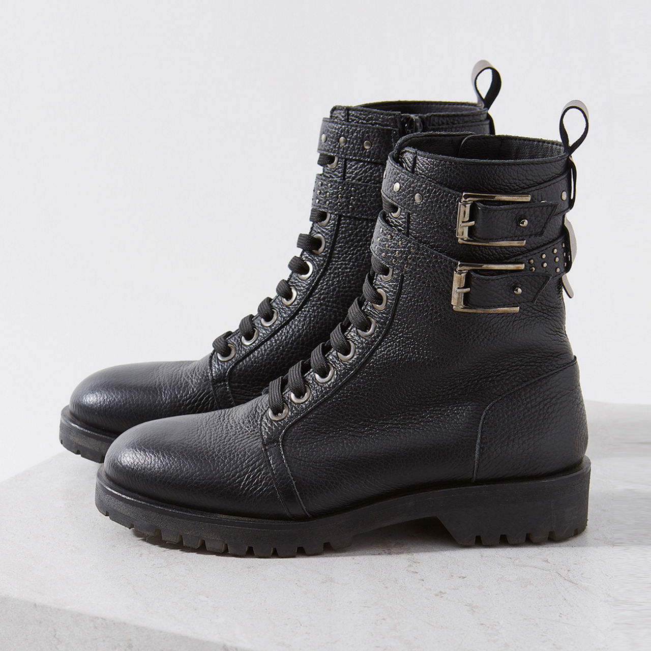 These black flat boots are crafted from textured leather in a cool round-toe shape. They feature all the biker details you'll love, from a lace-up front and buckled straps to a back pull tab.