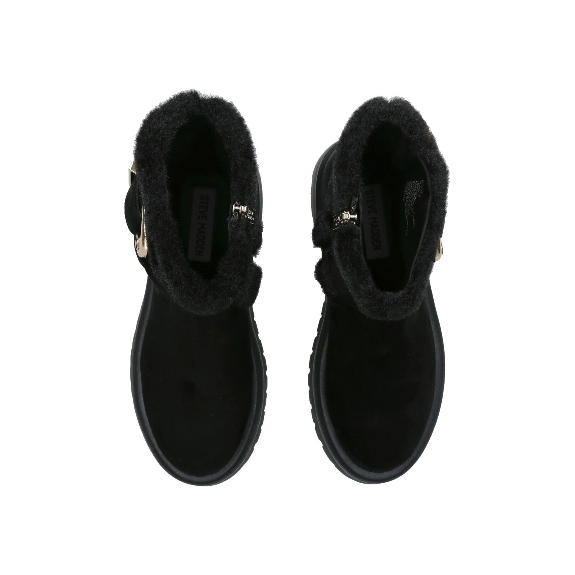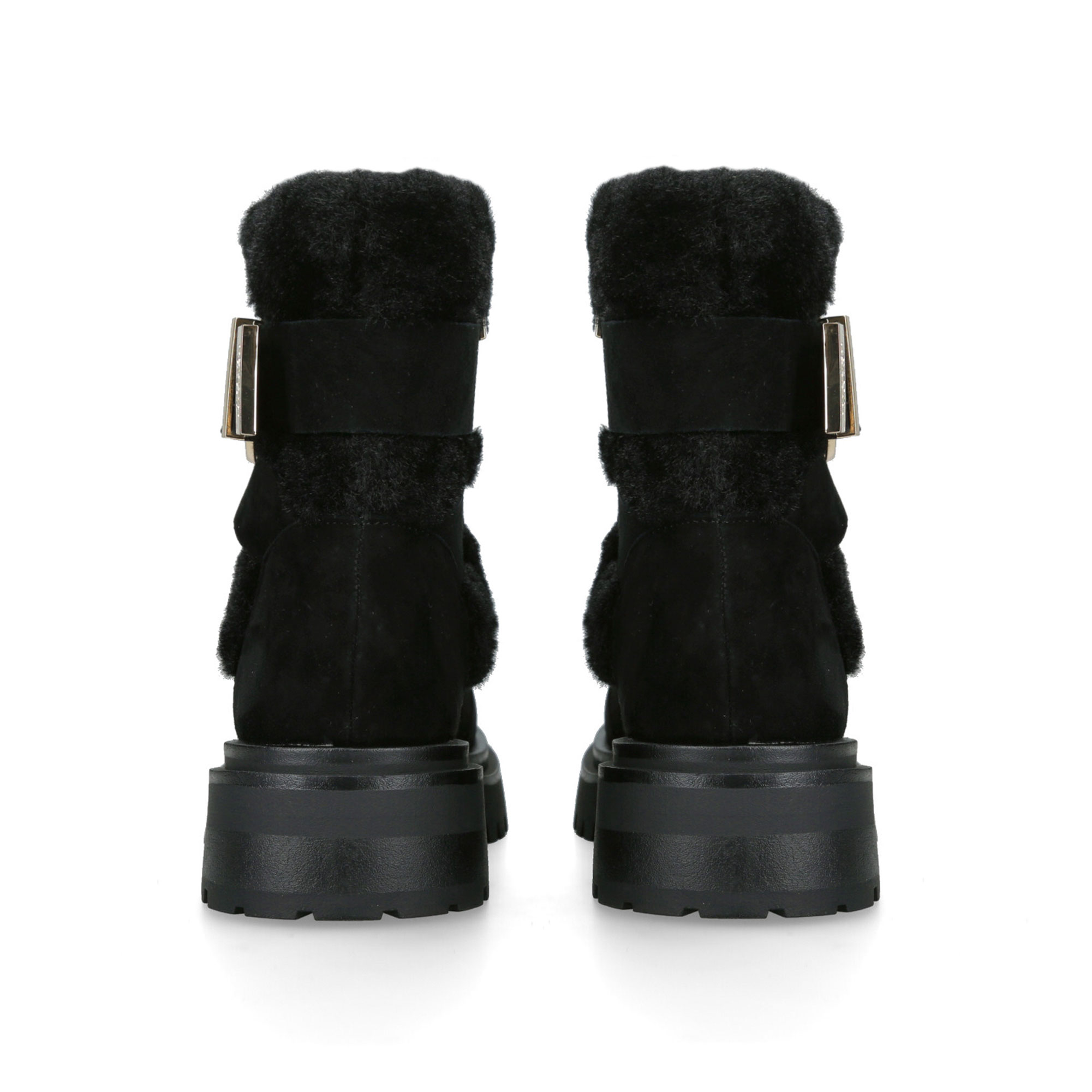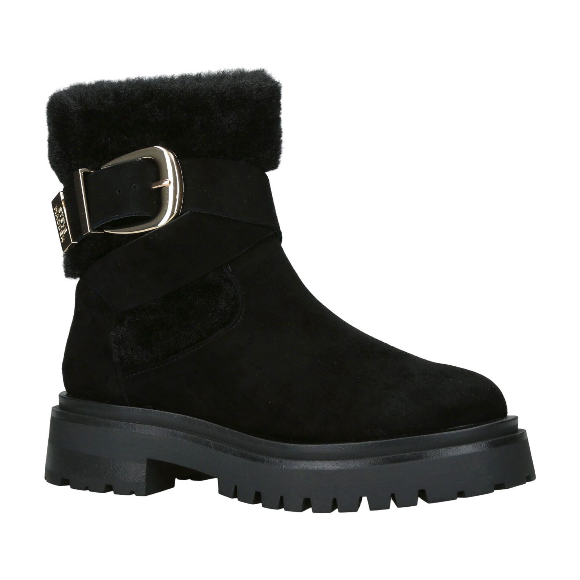 - Plush fur-lined collar, bold buckle strap detail