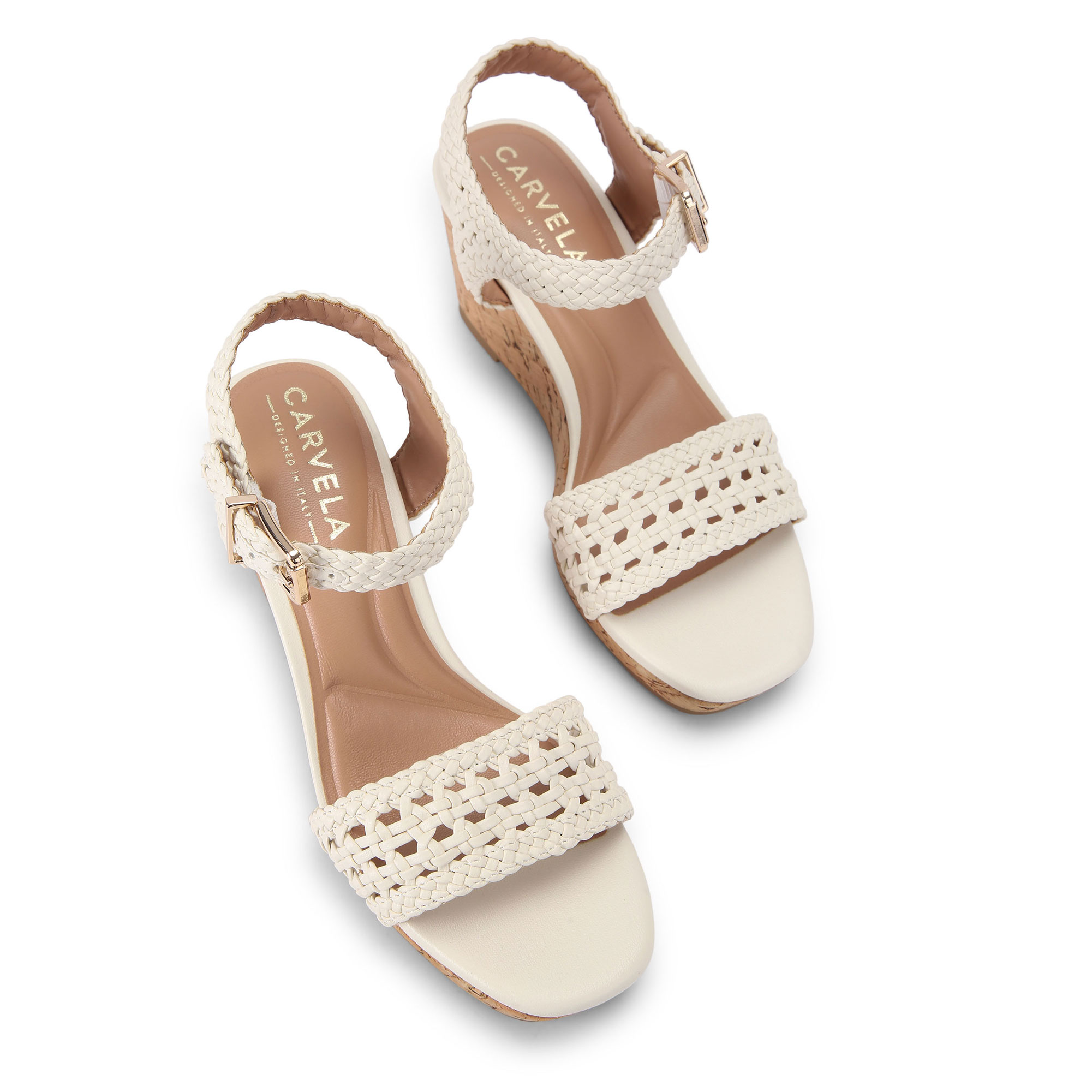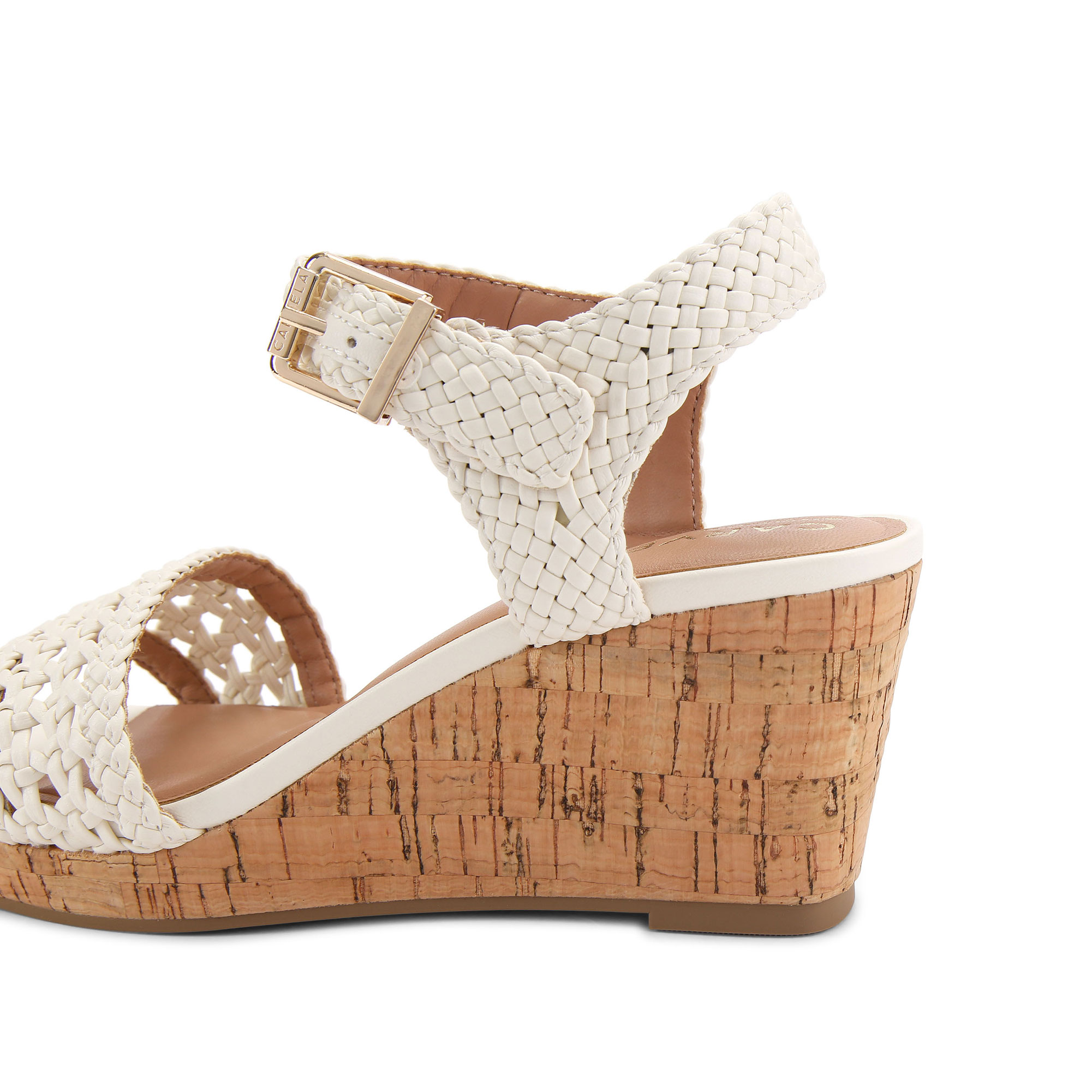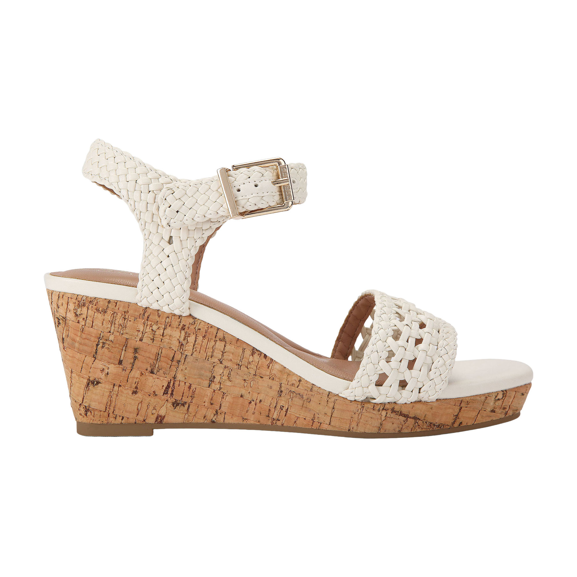 - Cork wedge heels, braided design, buckle fastening