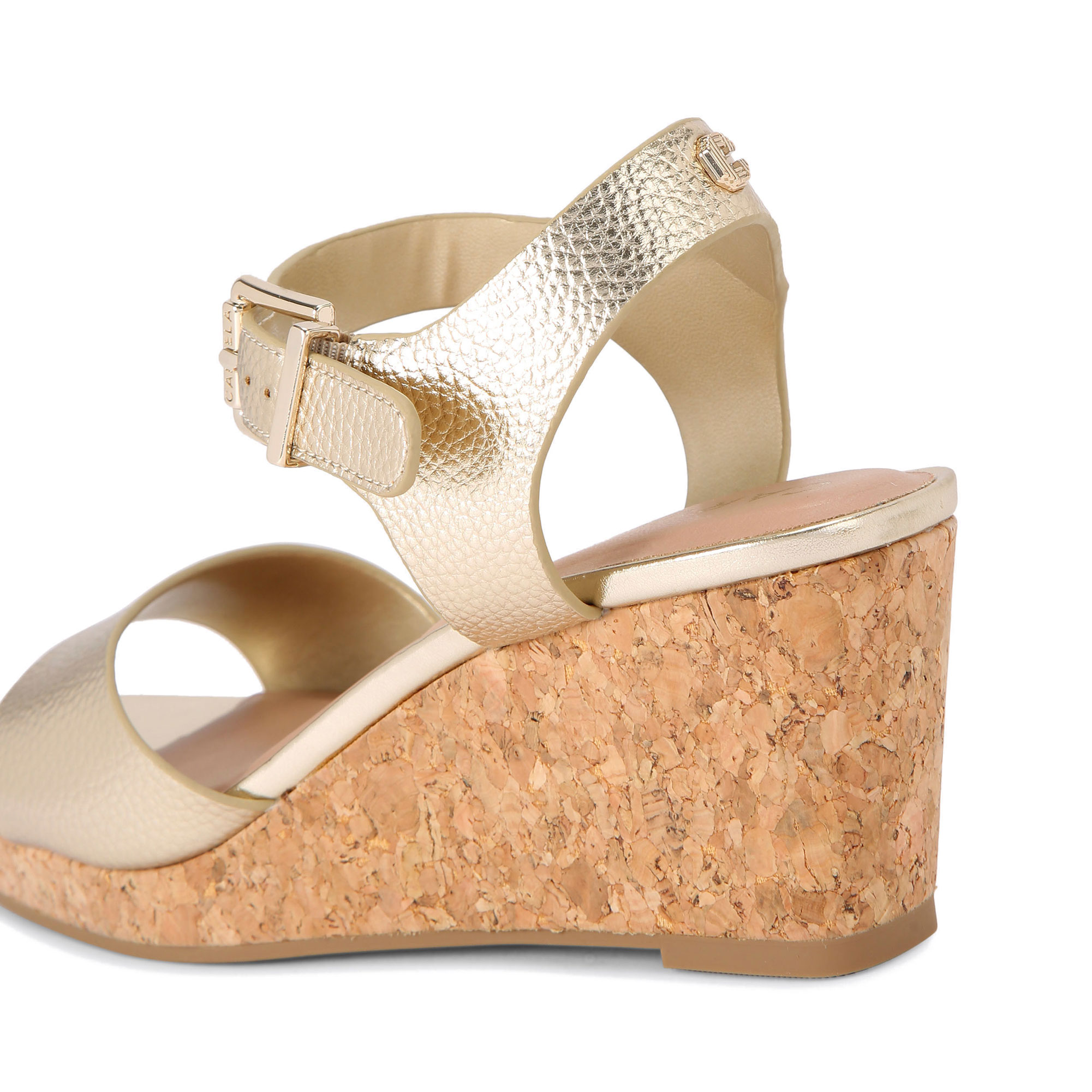 - Cork wedge heel, metallic finish, gold-tone buckle fastening ankle strap