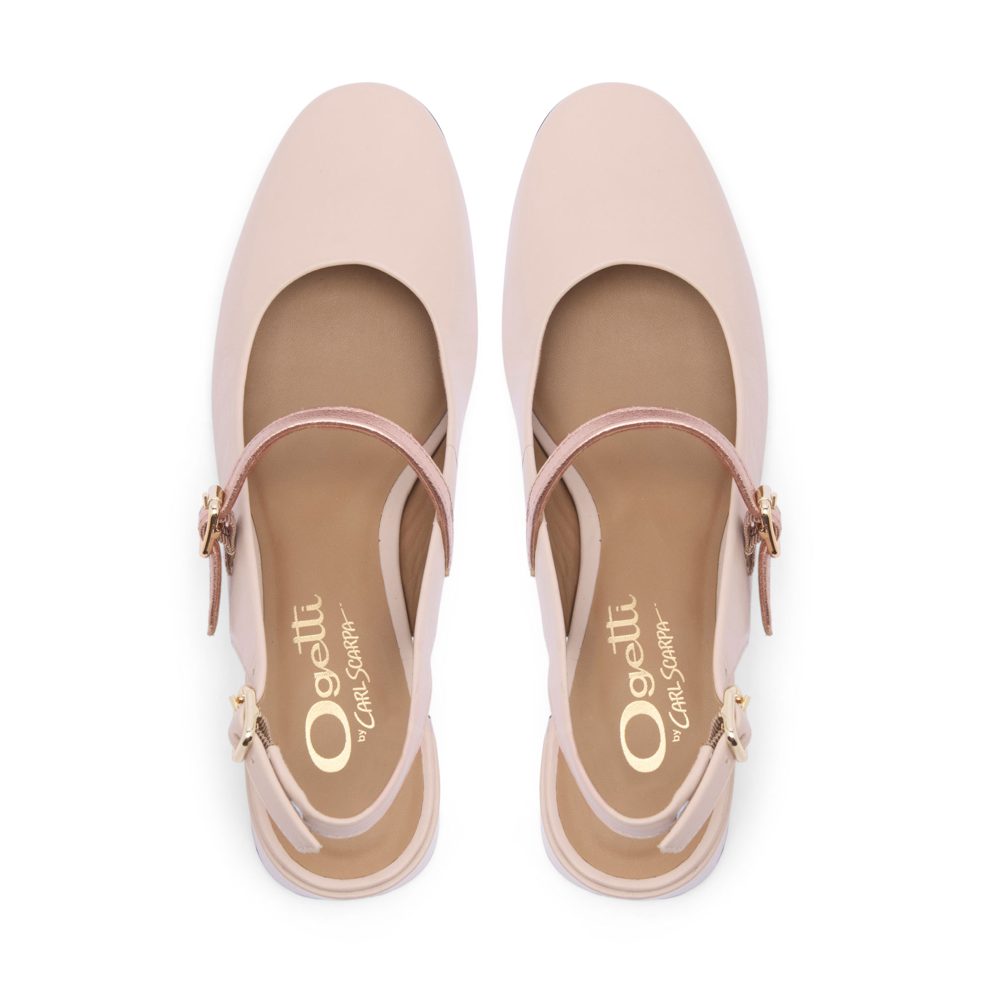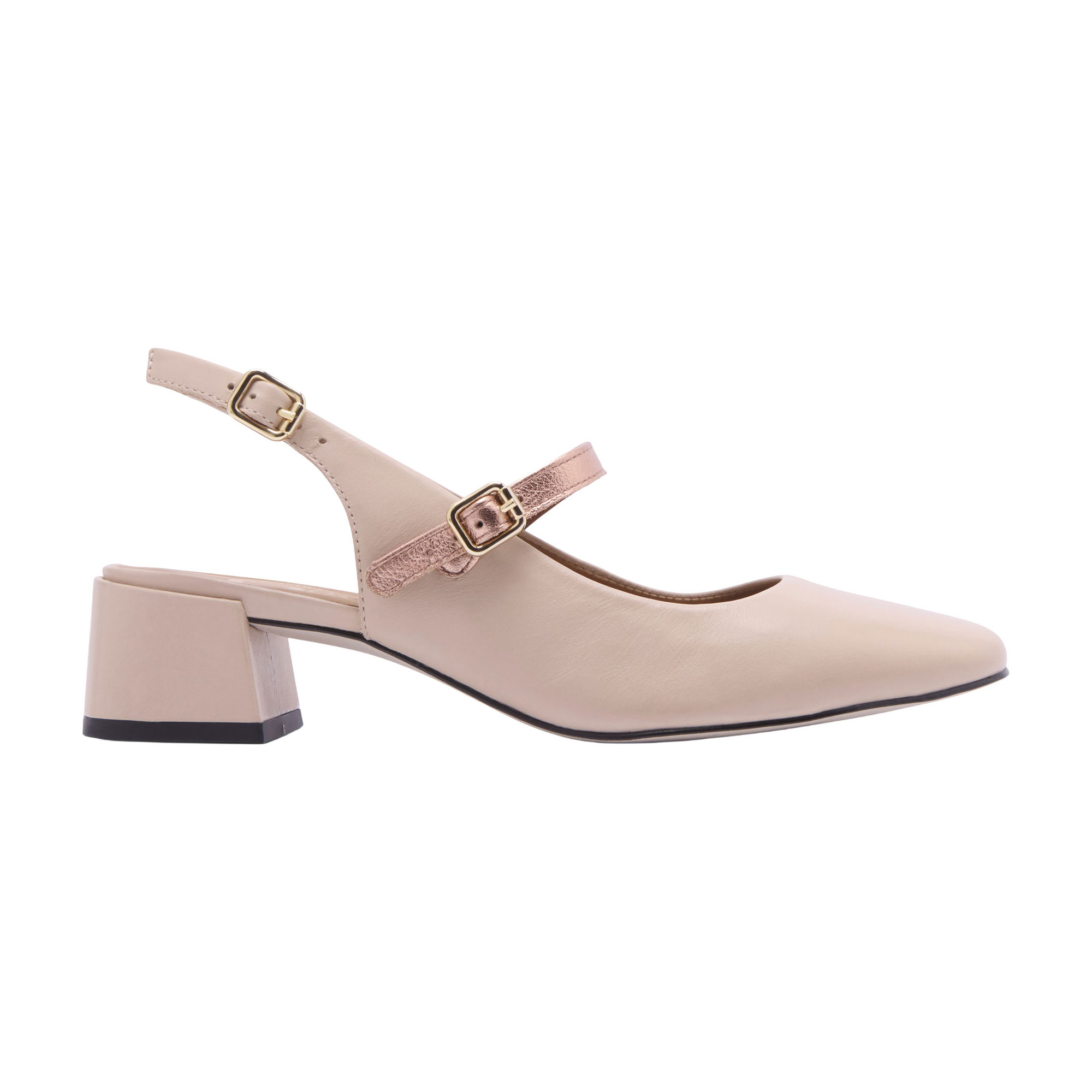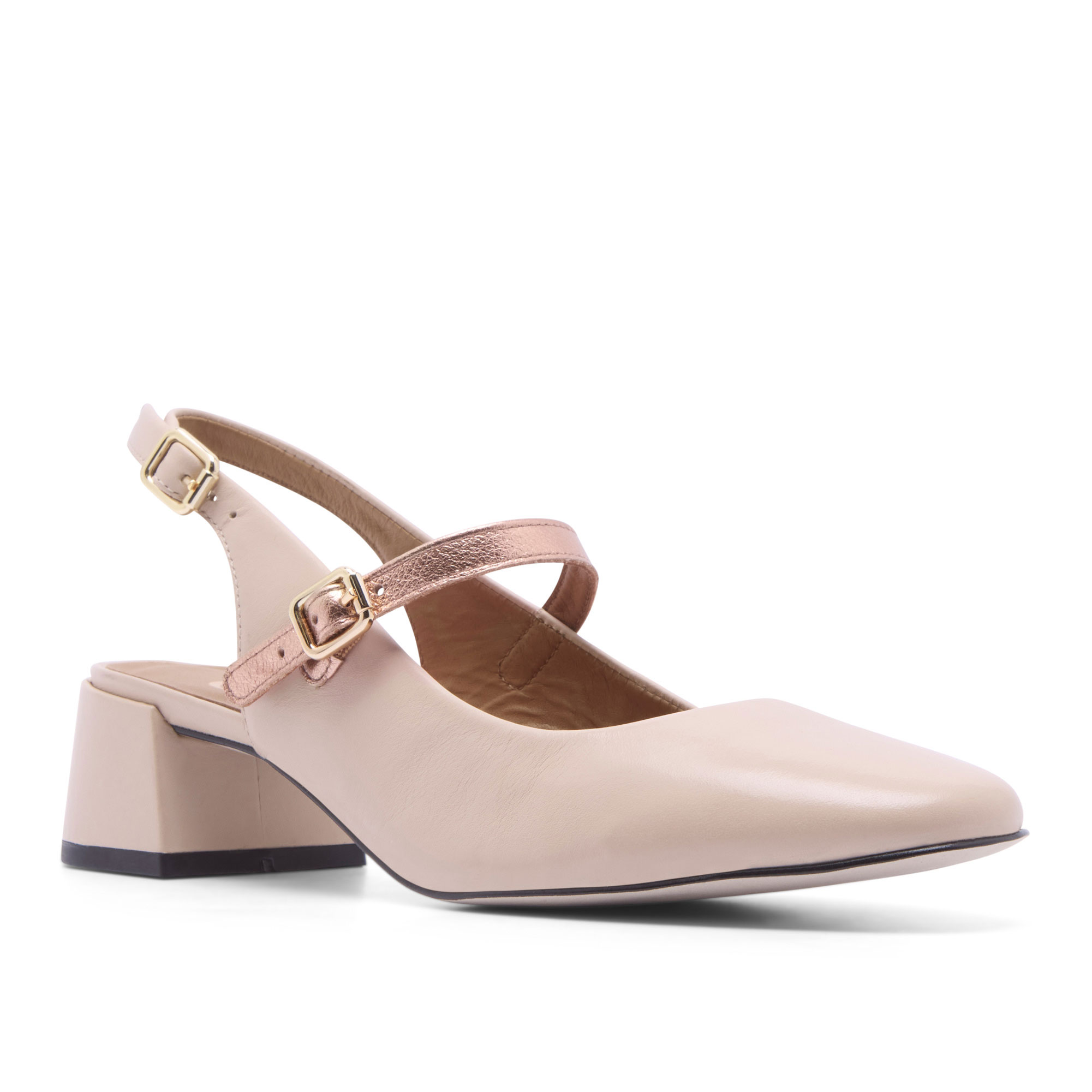 - Leather upper, mid block heel, almond toe, open back, two adjustable buckle straps, leather lining, cushioned insole, slingback silhouette