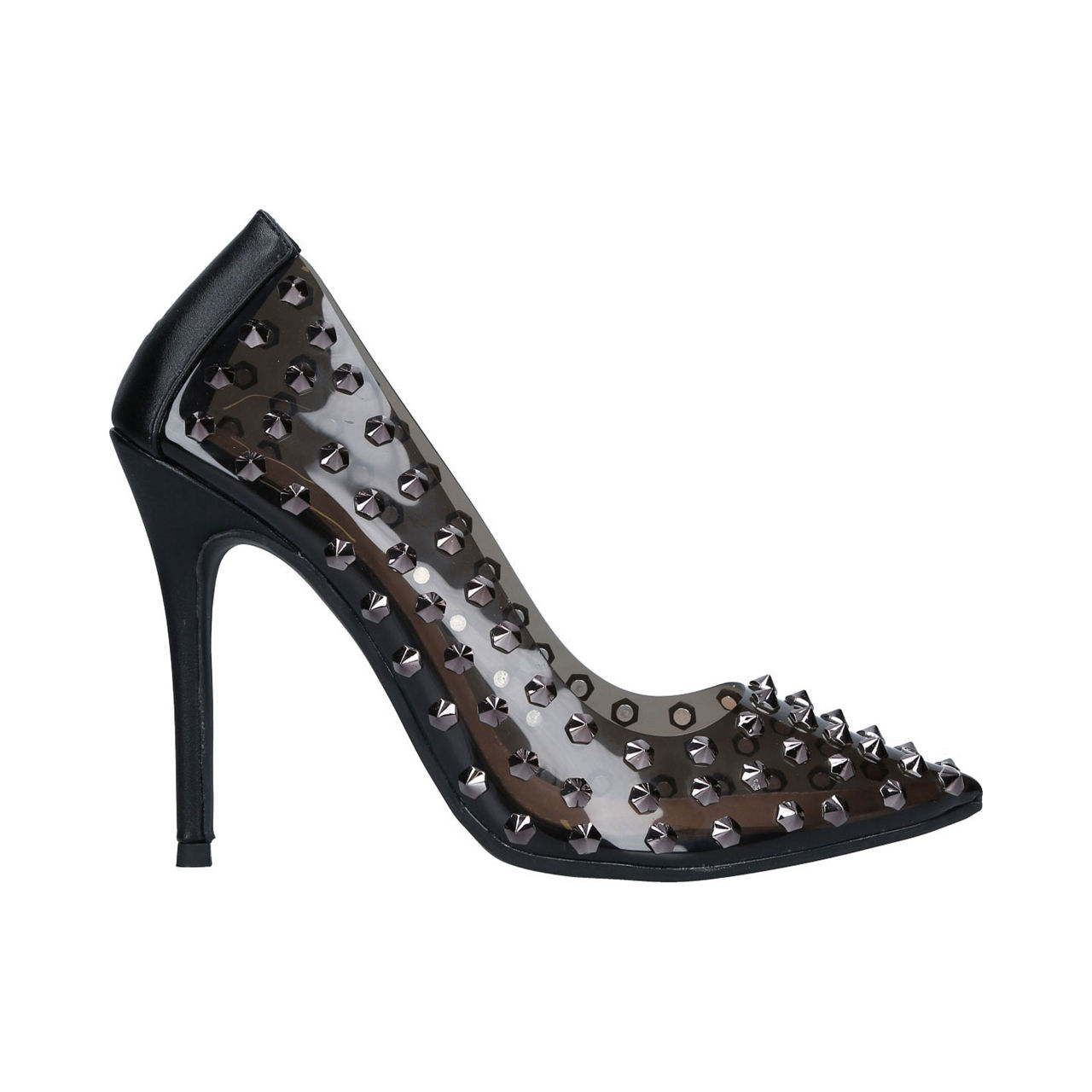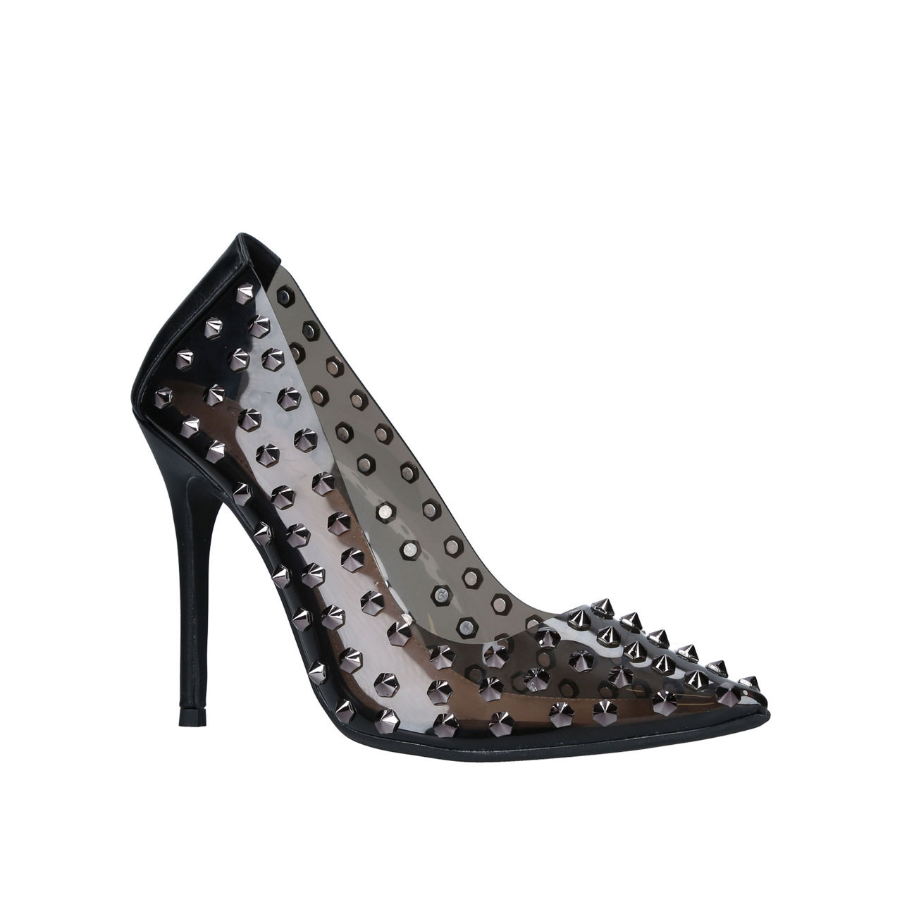 - Pointed toe, silver-tone hardware, stiletto heel, studded.