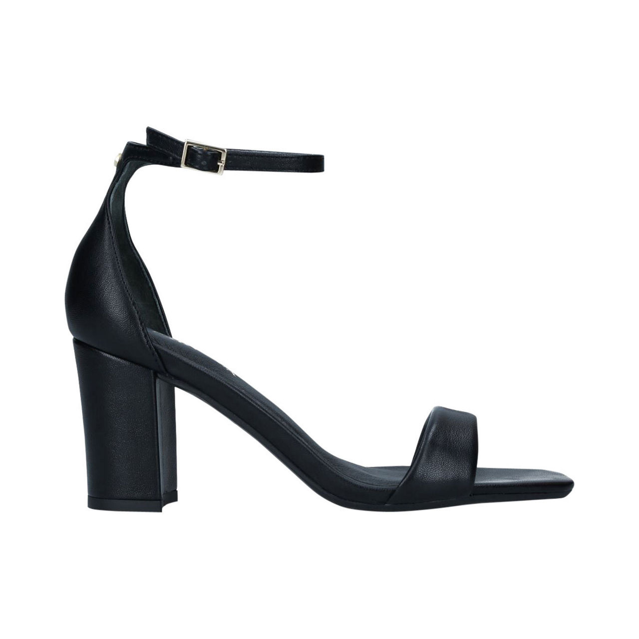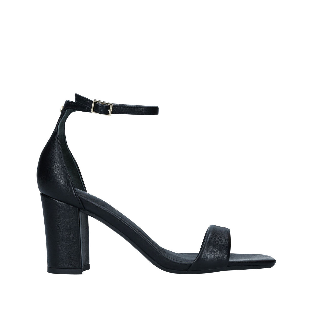 - Block heel, open toe, buckle fastening, square toe, padded toe strap.