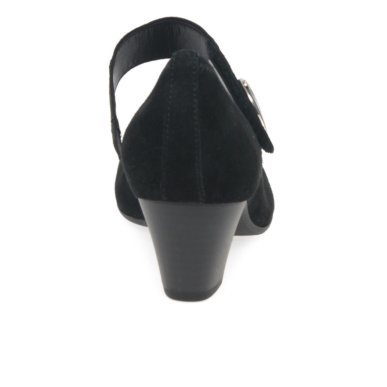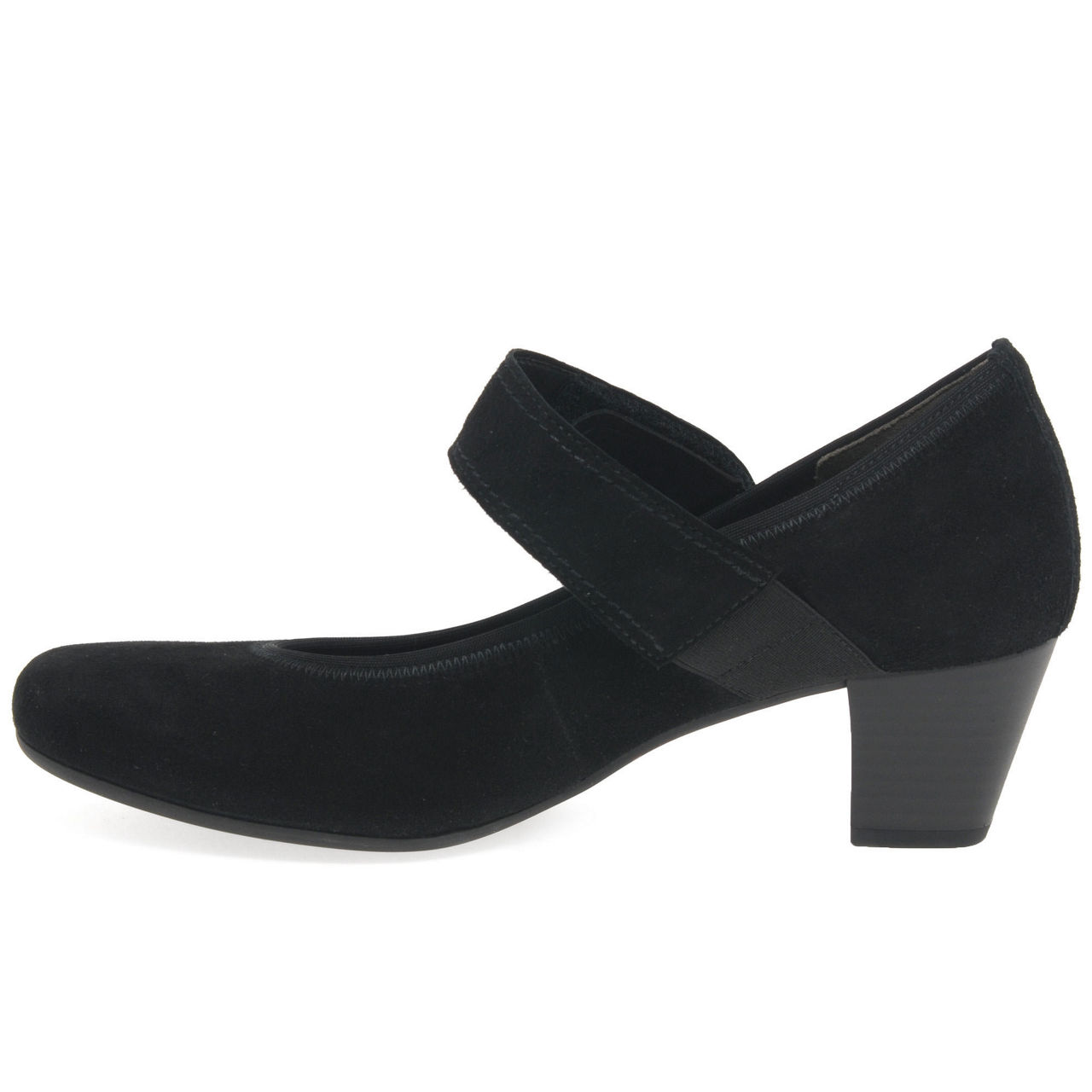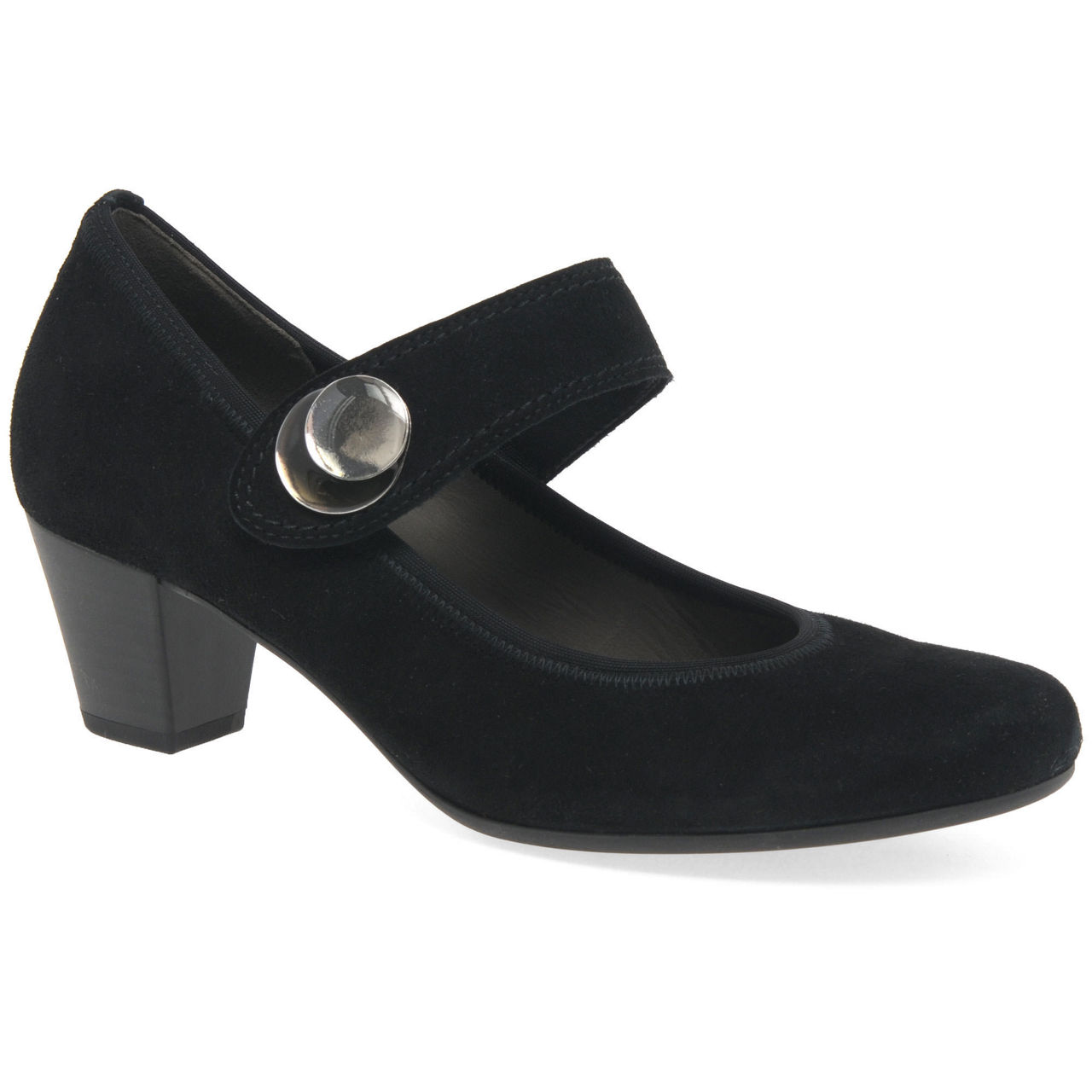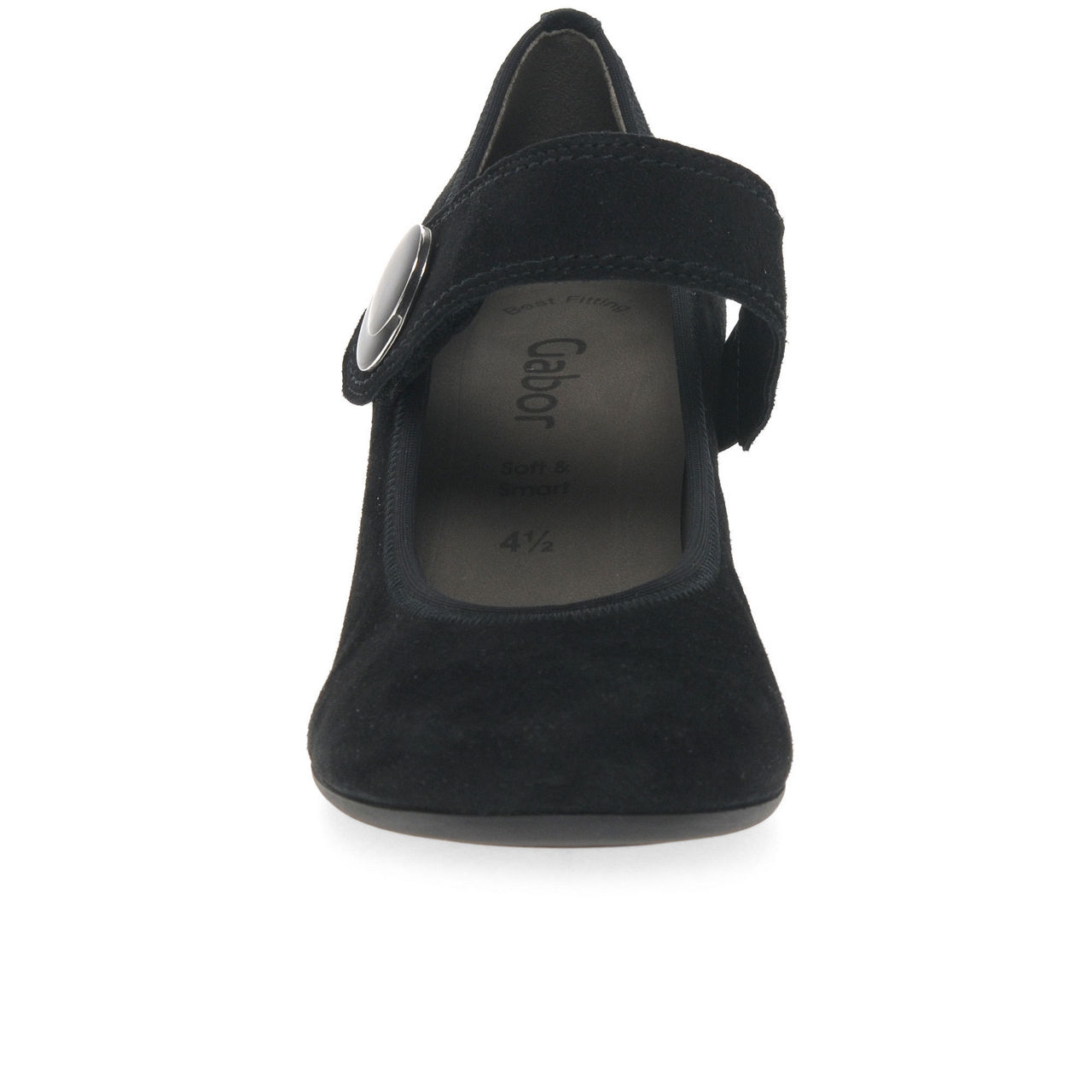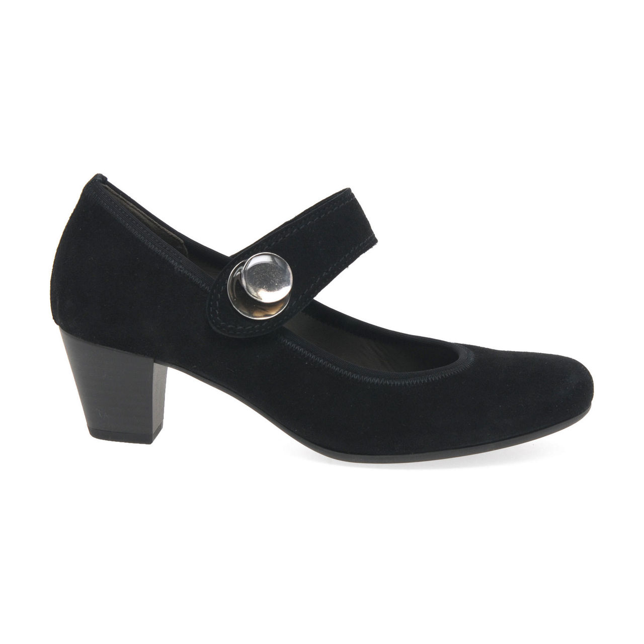 Twin metallic disks punctuate the bold Mary Jane straps fastening Gabor's Nola women's courts. Rich black suede is lined with smooth leather, wrapping feet in luxury. Block heels create that practical height boost.
