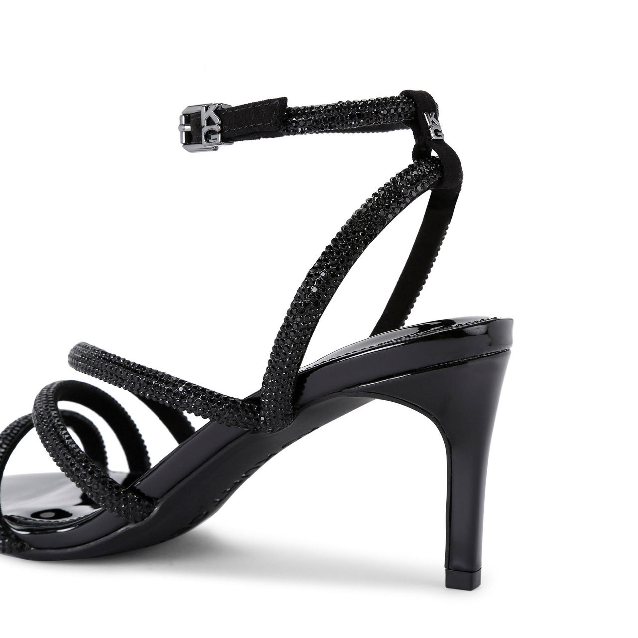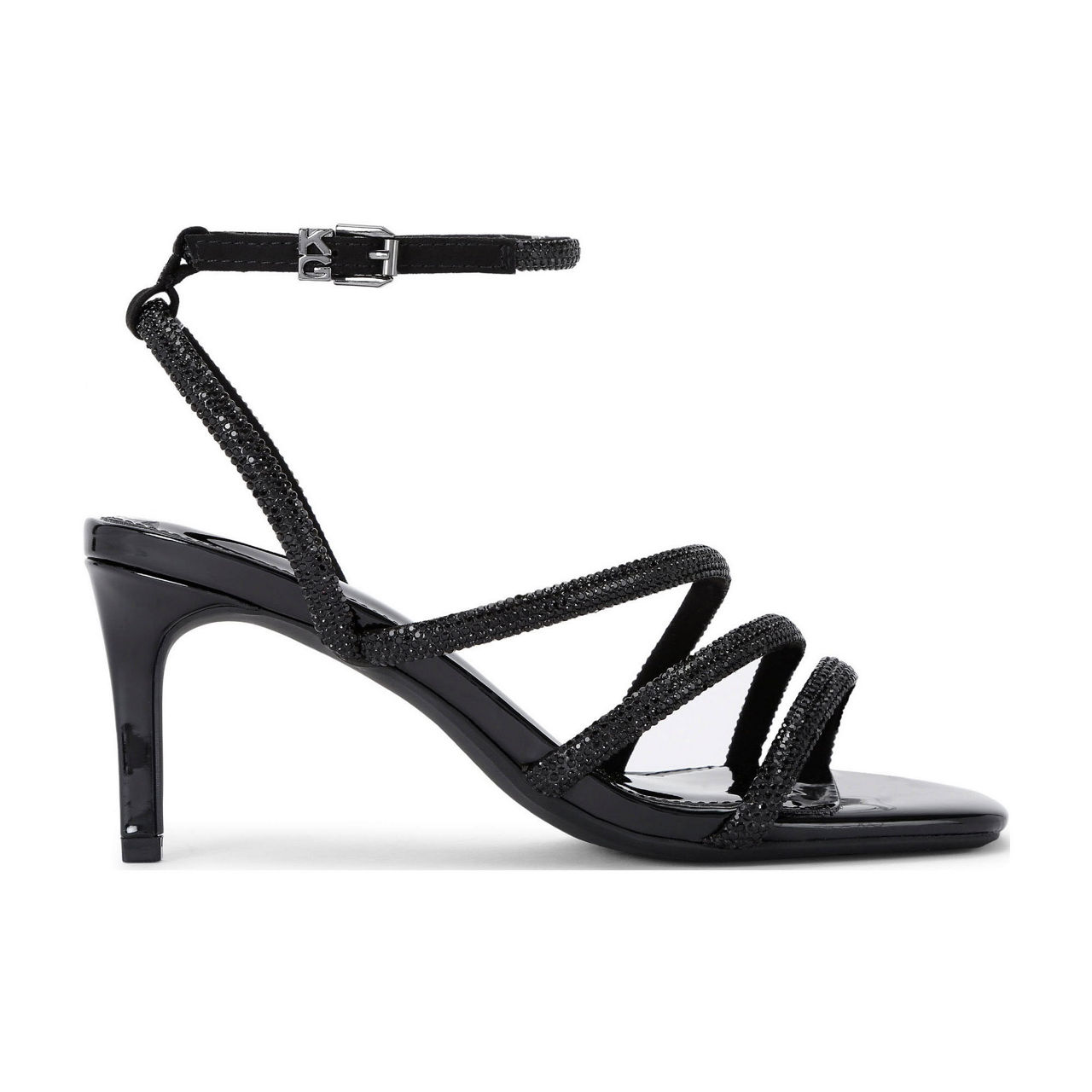 - Crystal-embellished strappy upper, ankle strap with branded buckle, open toe, slim heel