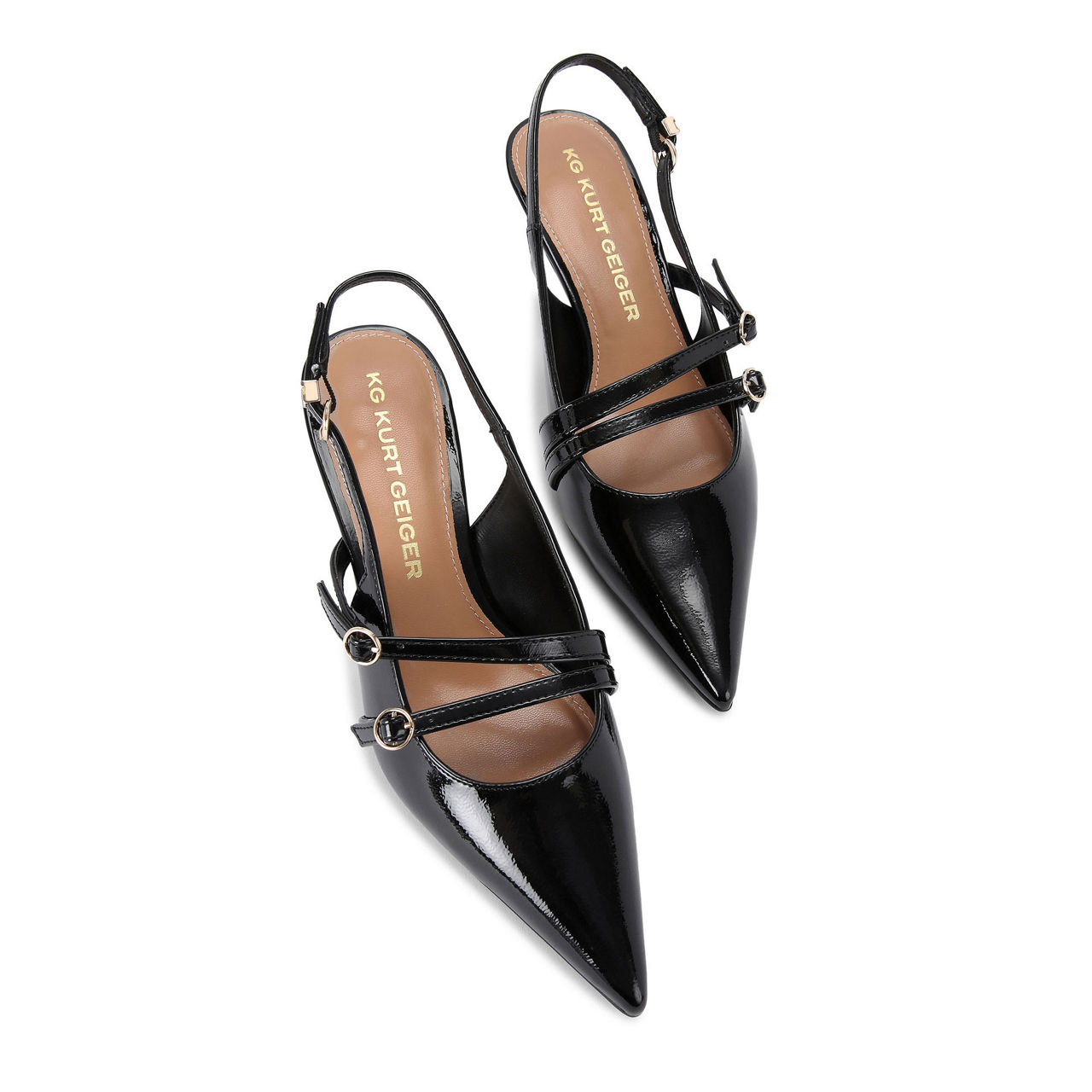 - Patent upper, pointed toe, two foot straps with buckle fastenings, slingback strap with buckle fastening, gold-tone branded hardware, flared heel