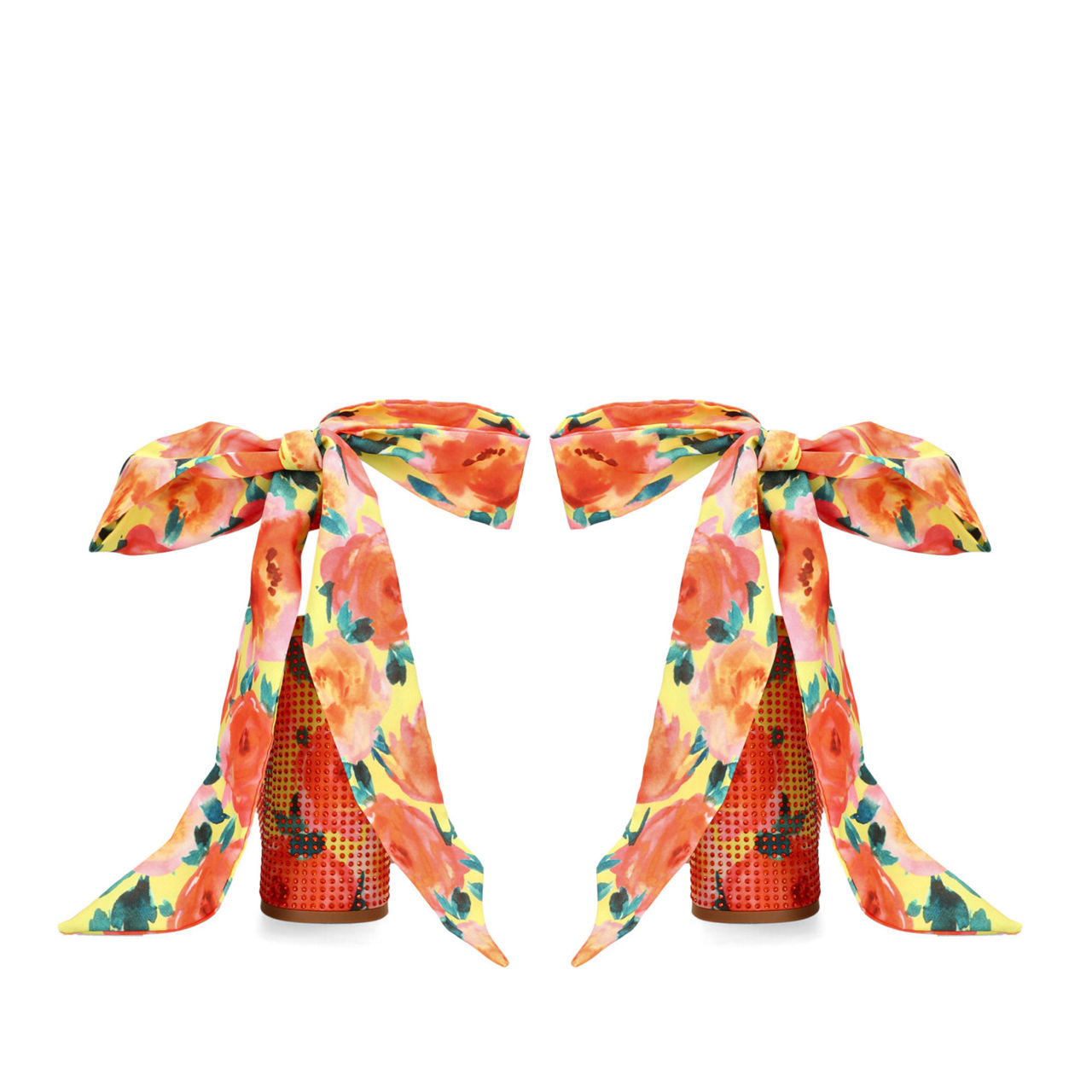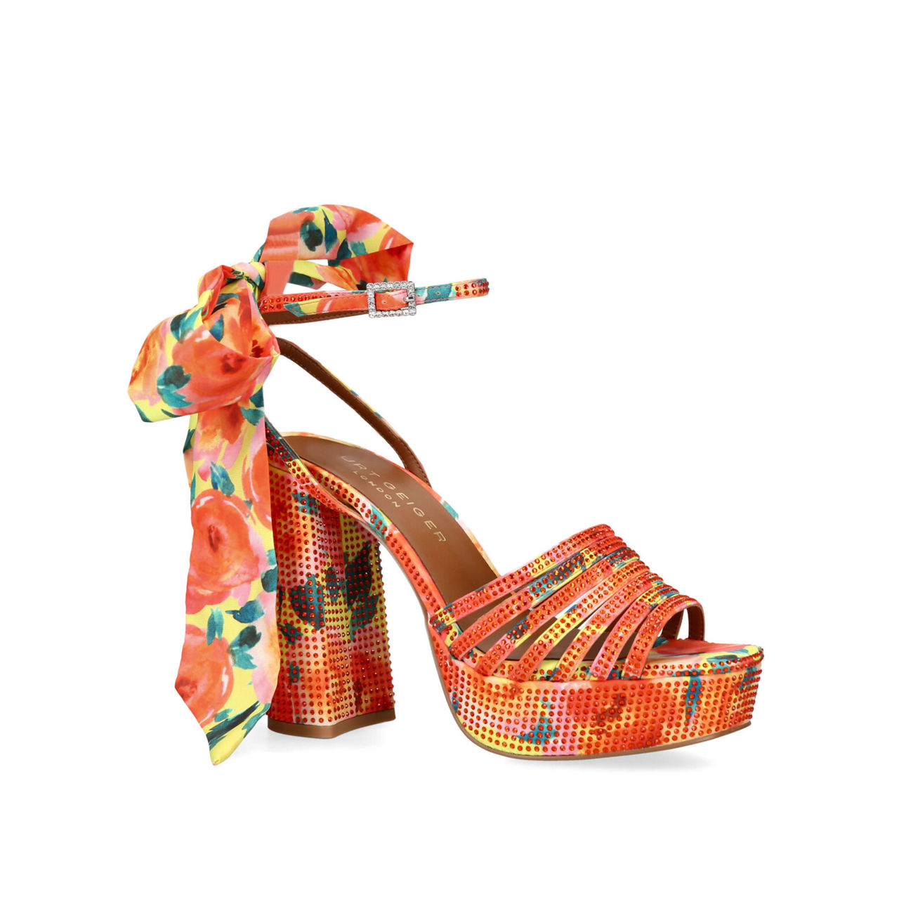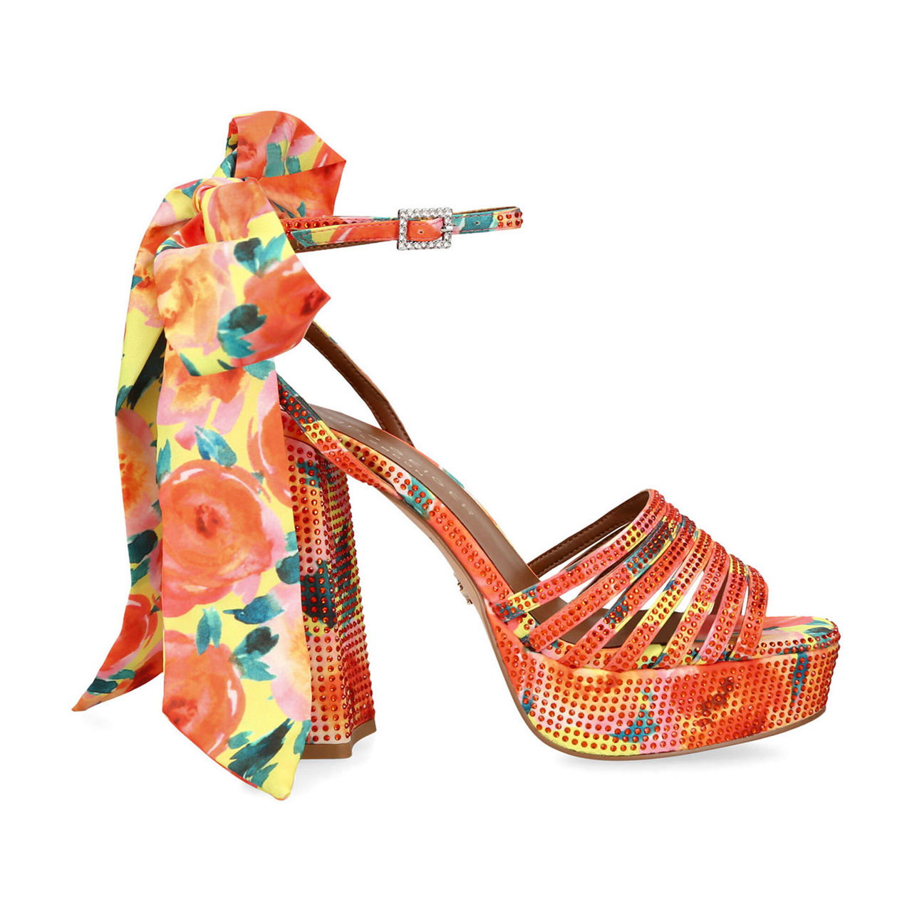 - Platform block heel, ankle strap with buckle and tie, strappy construction, open toe, orange crystals
