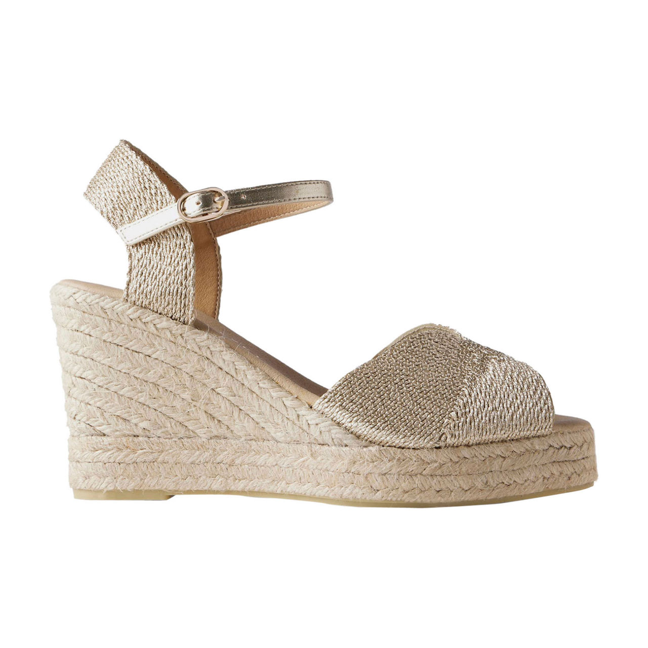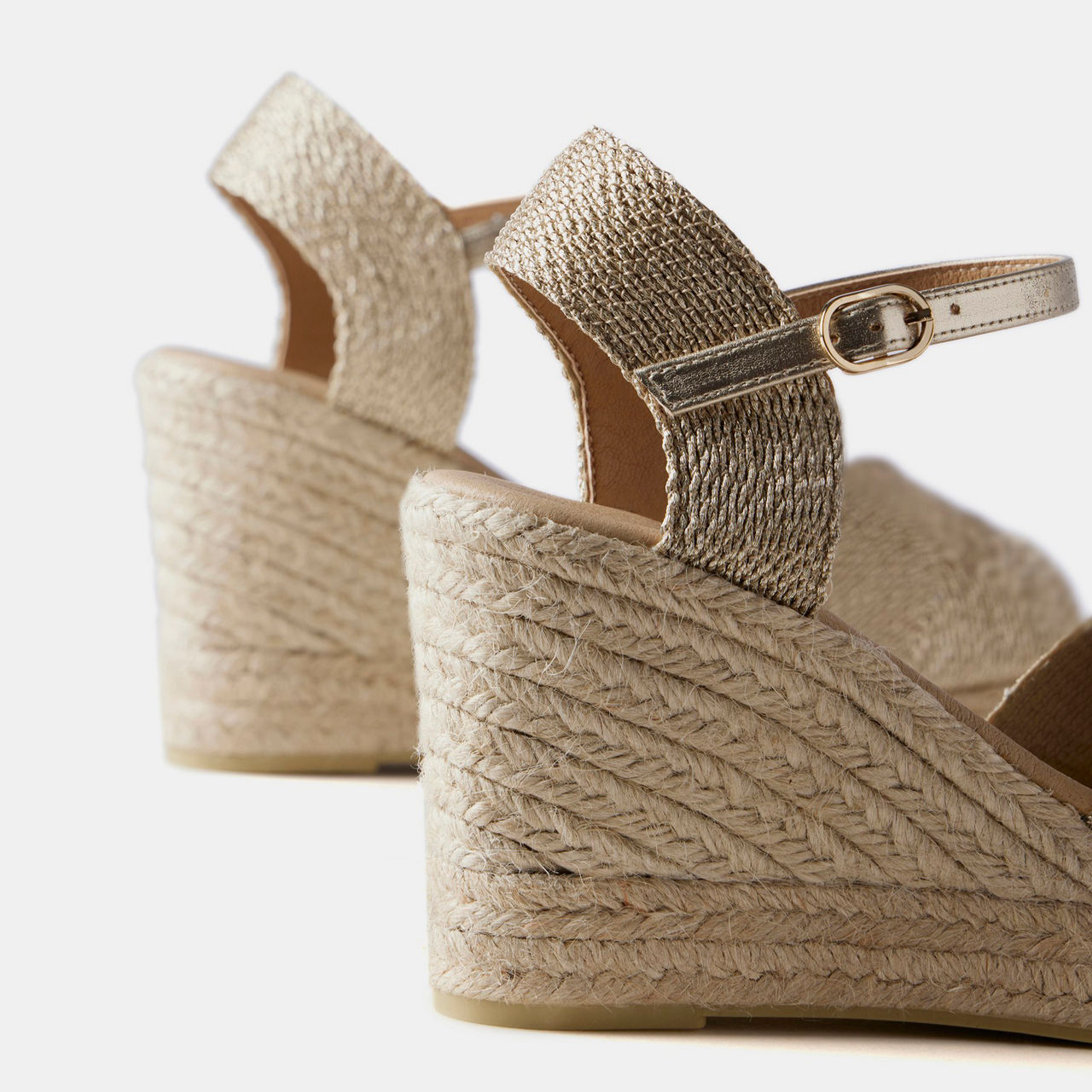- Woven upper, foot strap with peep toe detail, round toe, raffia-style wedge heel, rubber sole, adjustable ankle strap, gold-tone buckle fastening