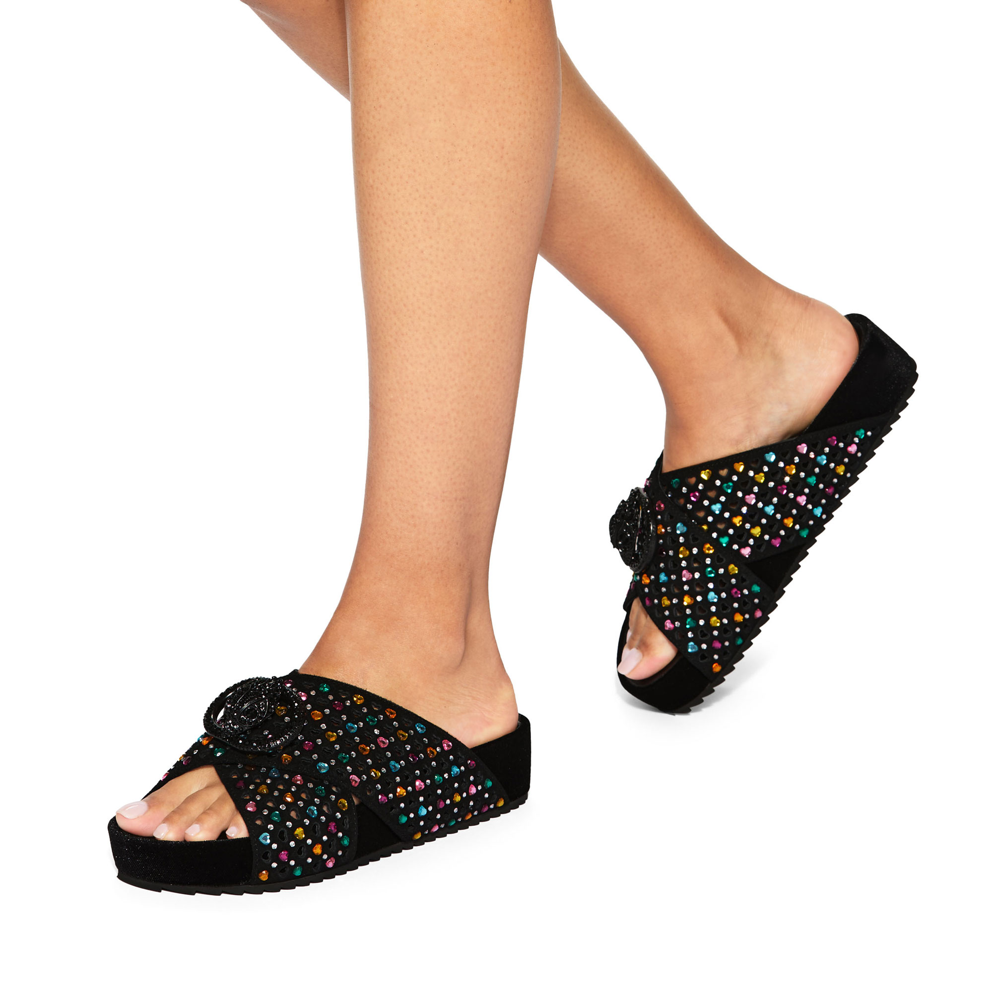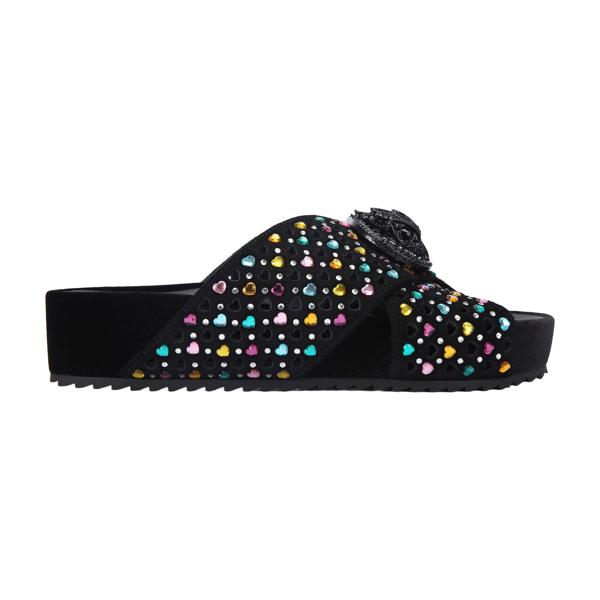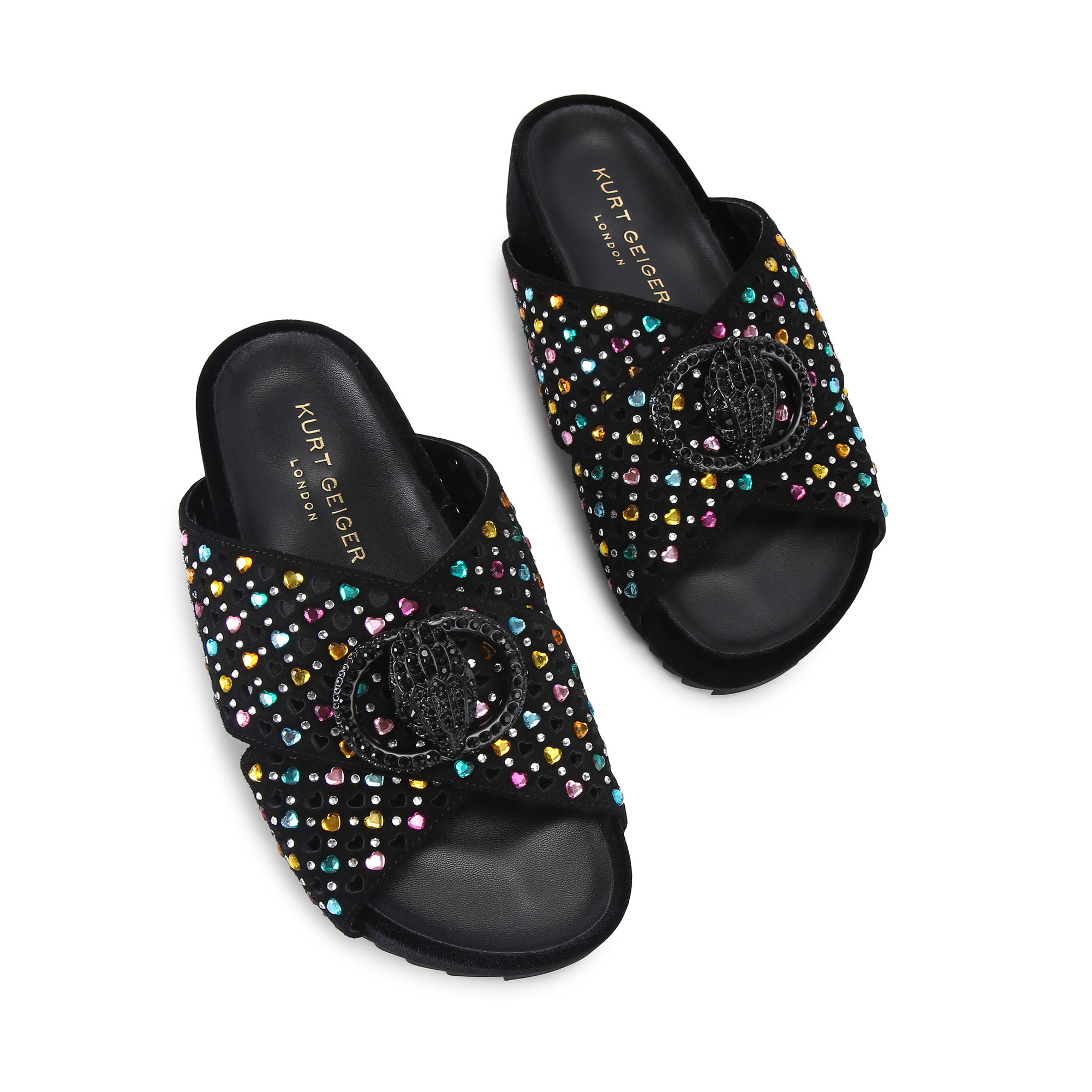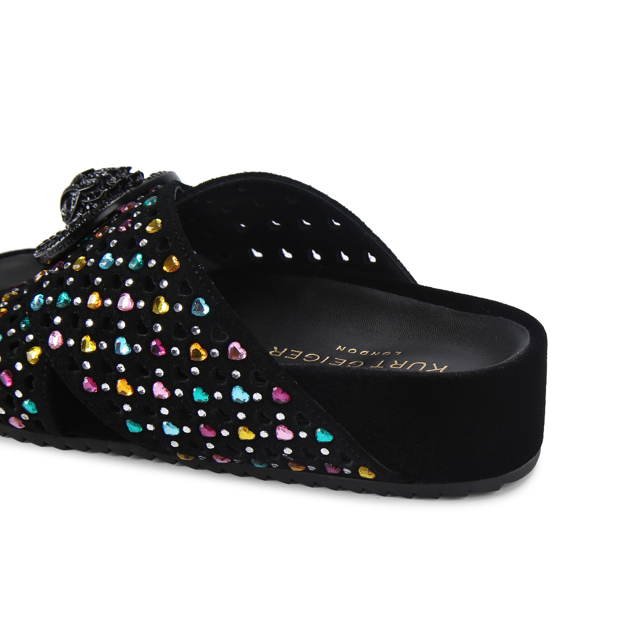 - Black suede straps, multi-colour heart crystals, black oval trim, eagle head detail
