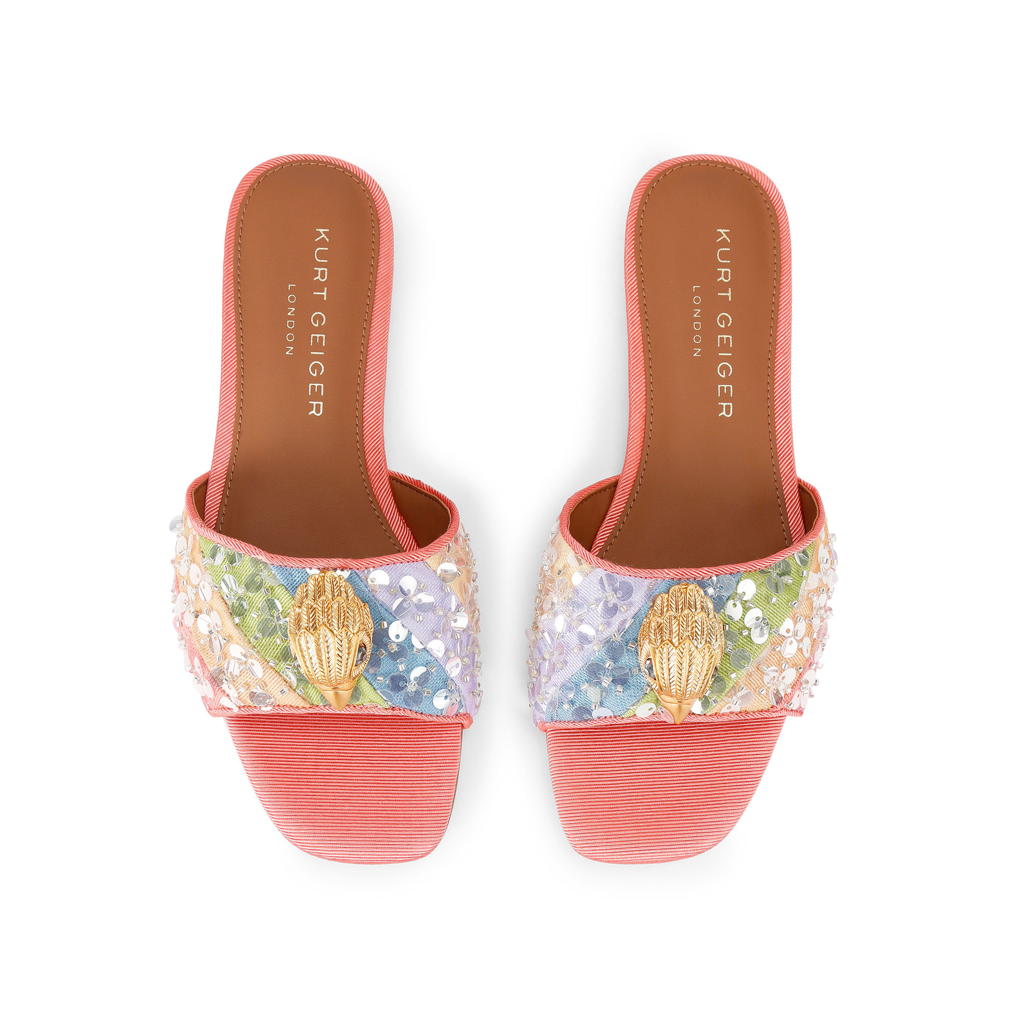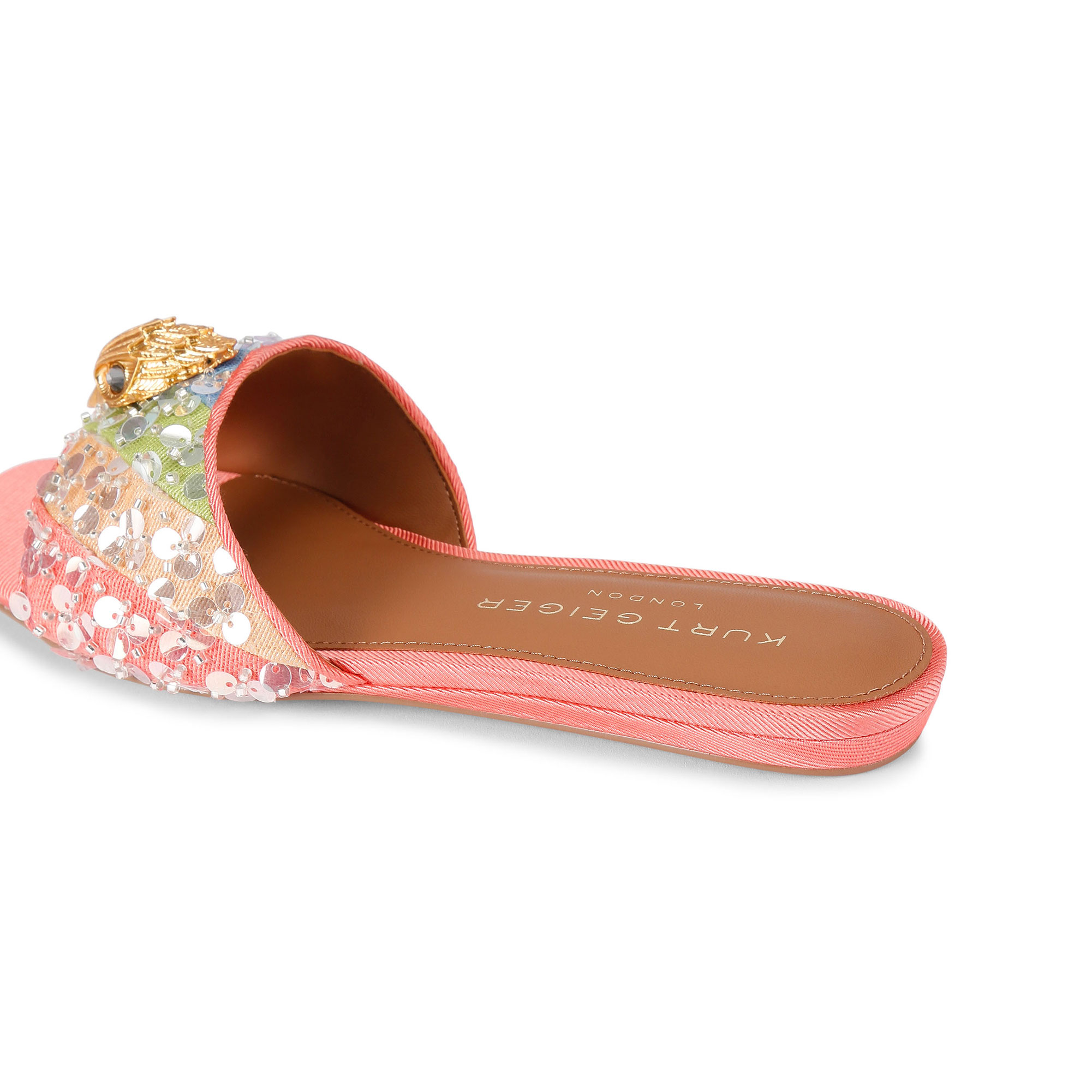 - Flat sandal, pastel striped sequin embellishment, logo detail