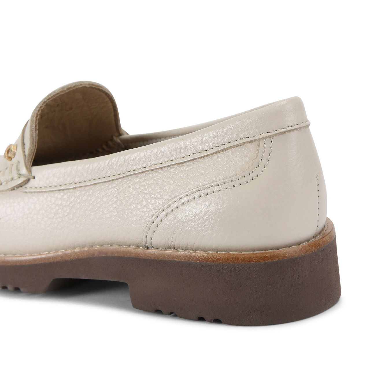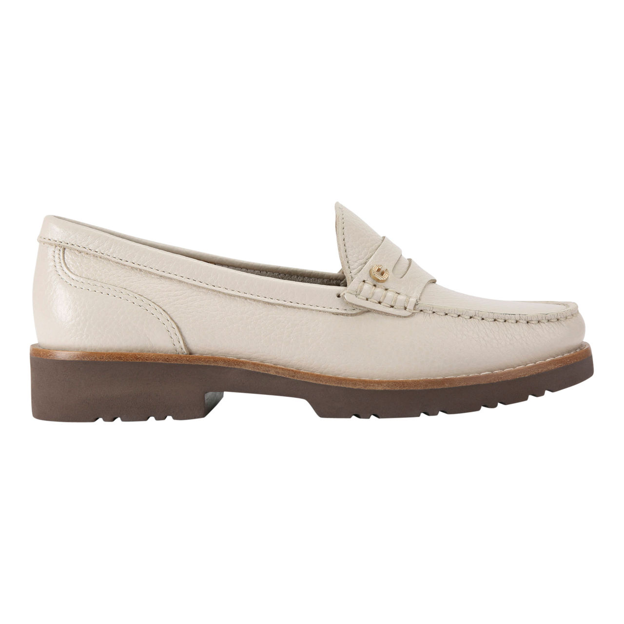 - Slip-on style, tapered toe, textured bone leather, cut out strap across the foot, gold Icon C stud to one side, sole is slightly lifted at the heel, features All Day Long technology