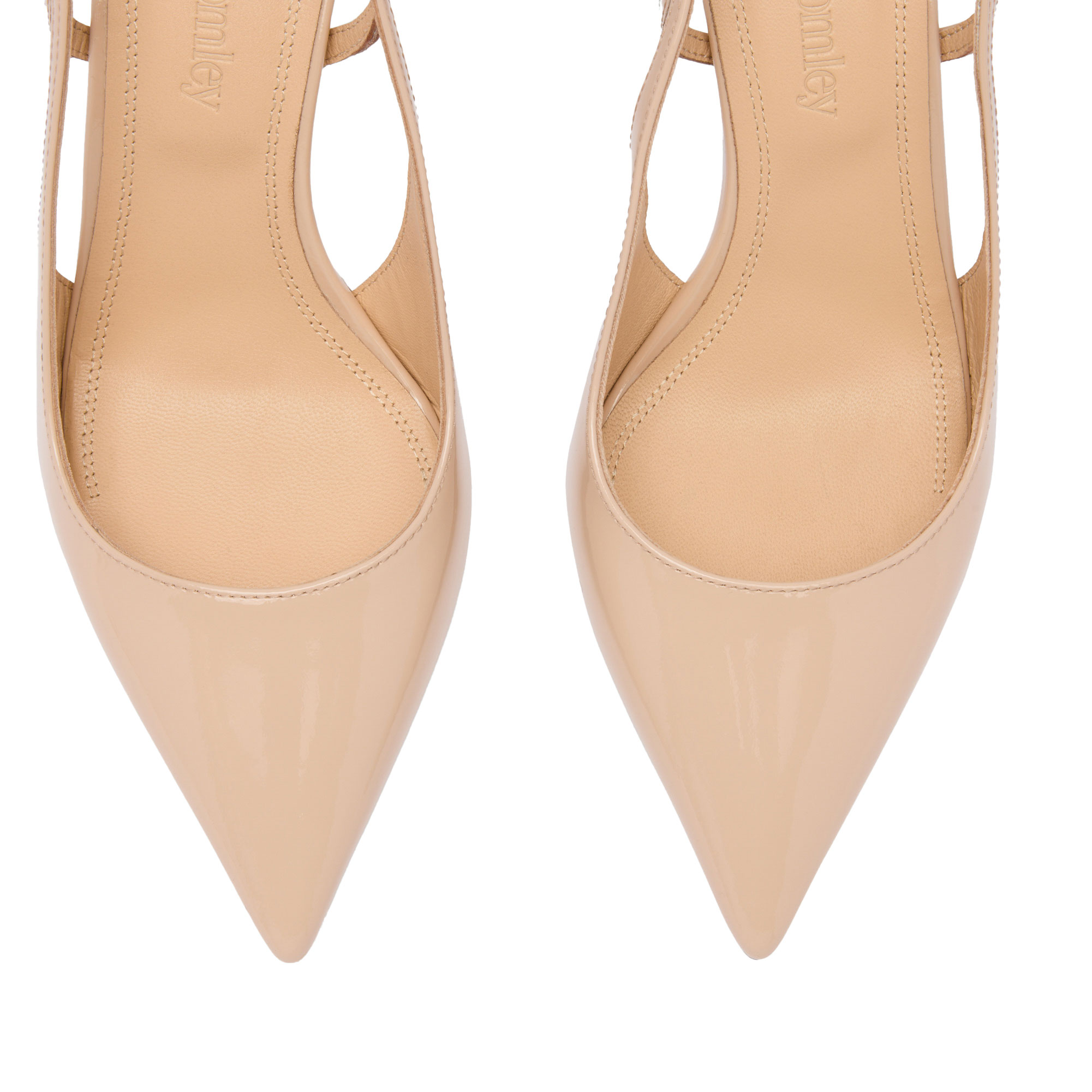- Sharp cutout detailing, glossy patent leather, sculpted slingback silhouette, adjustable gold-tone buckle