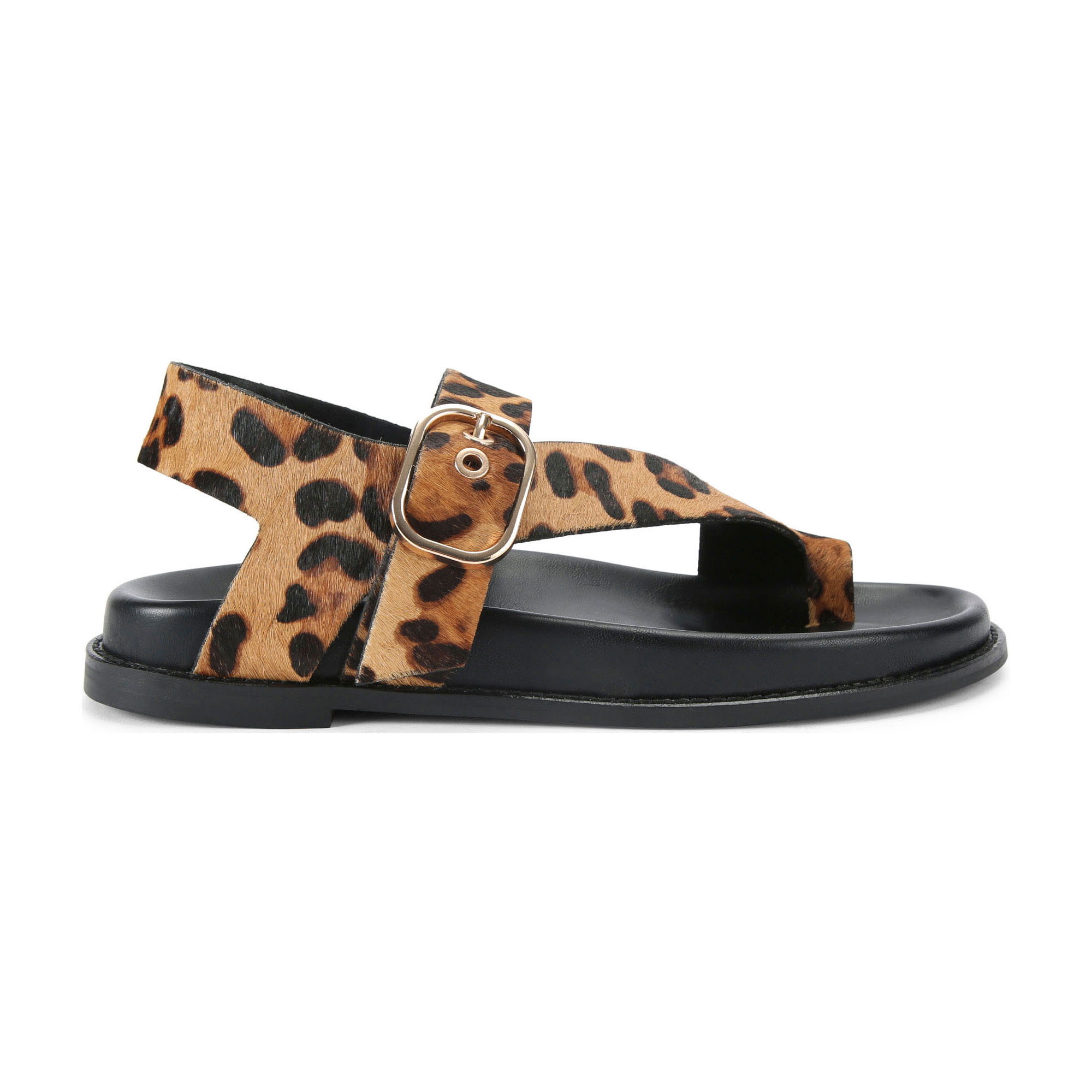 - Calf hair-leather, leopard print, gold-tone buckle fastening, toe strap, flat