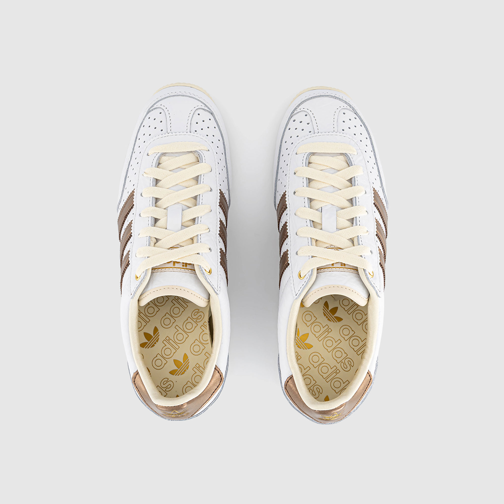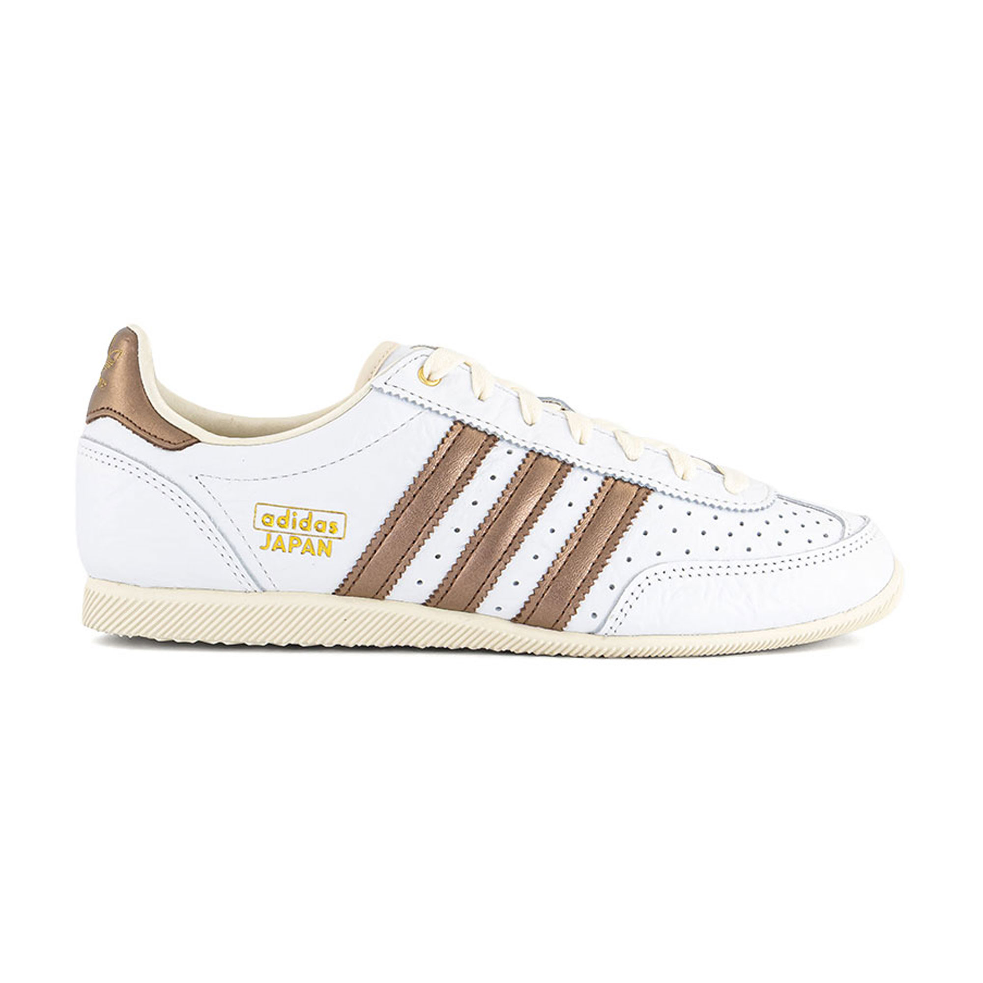 - Round toe, low top, lace up fastening, leather upper, metallic stripes, gold-tone 'Adidas Japan' branding, textured sole, perforated detailing