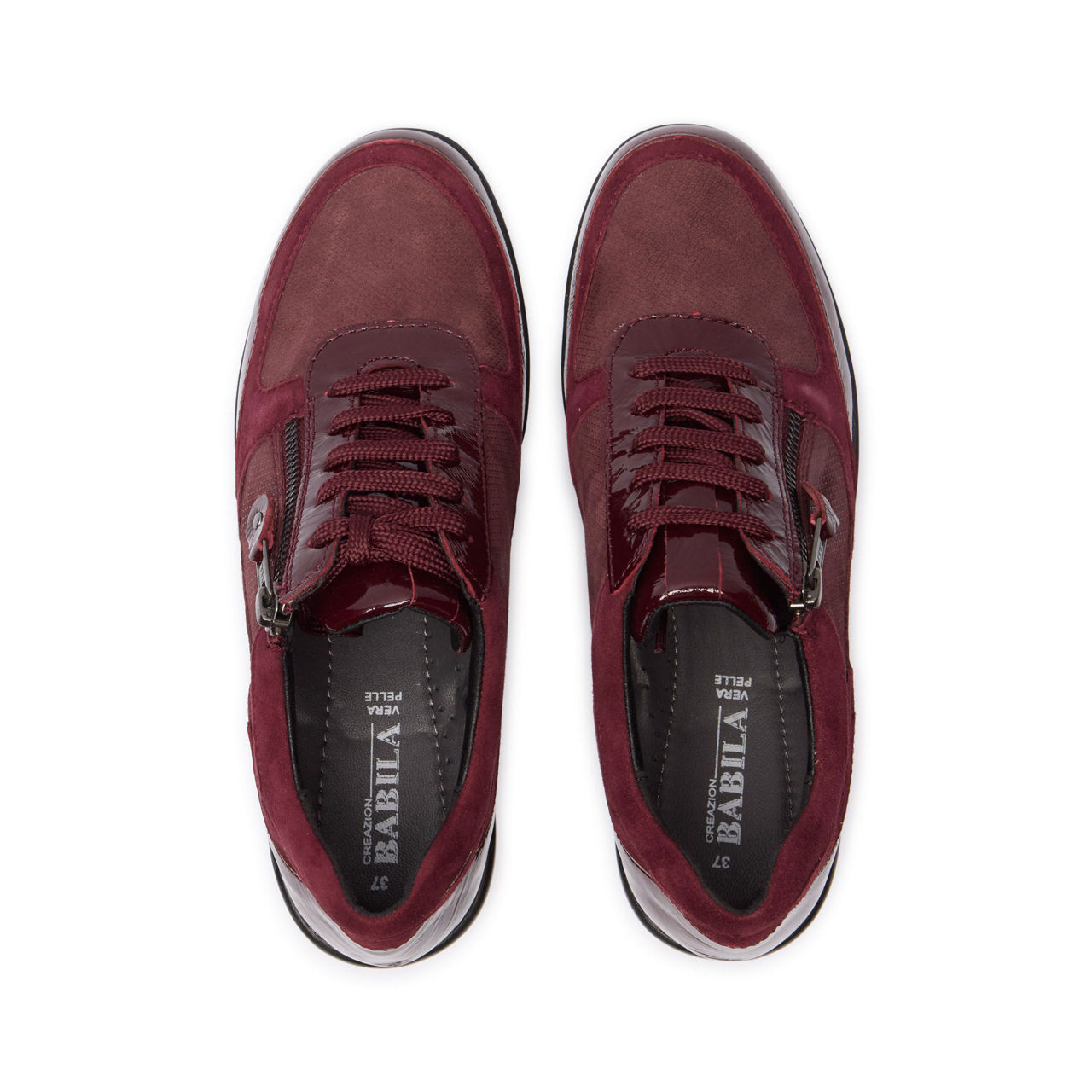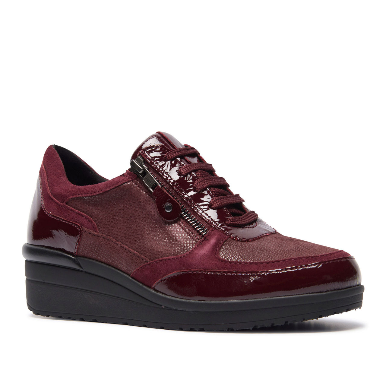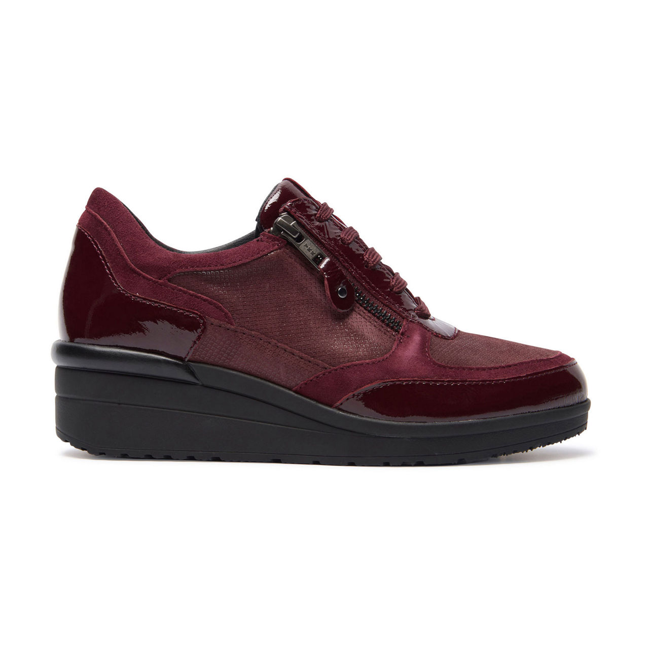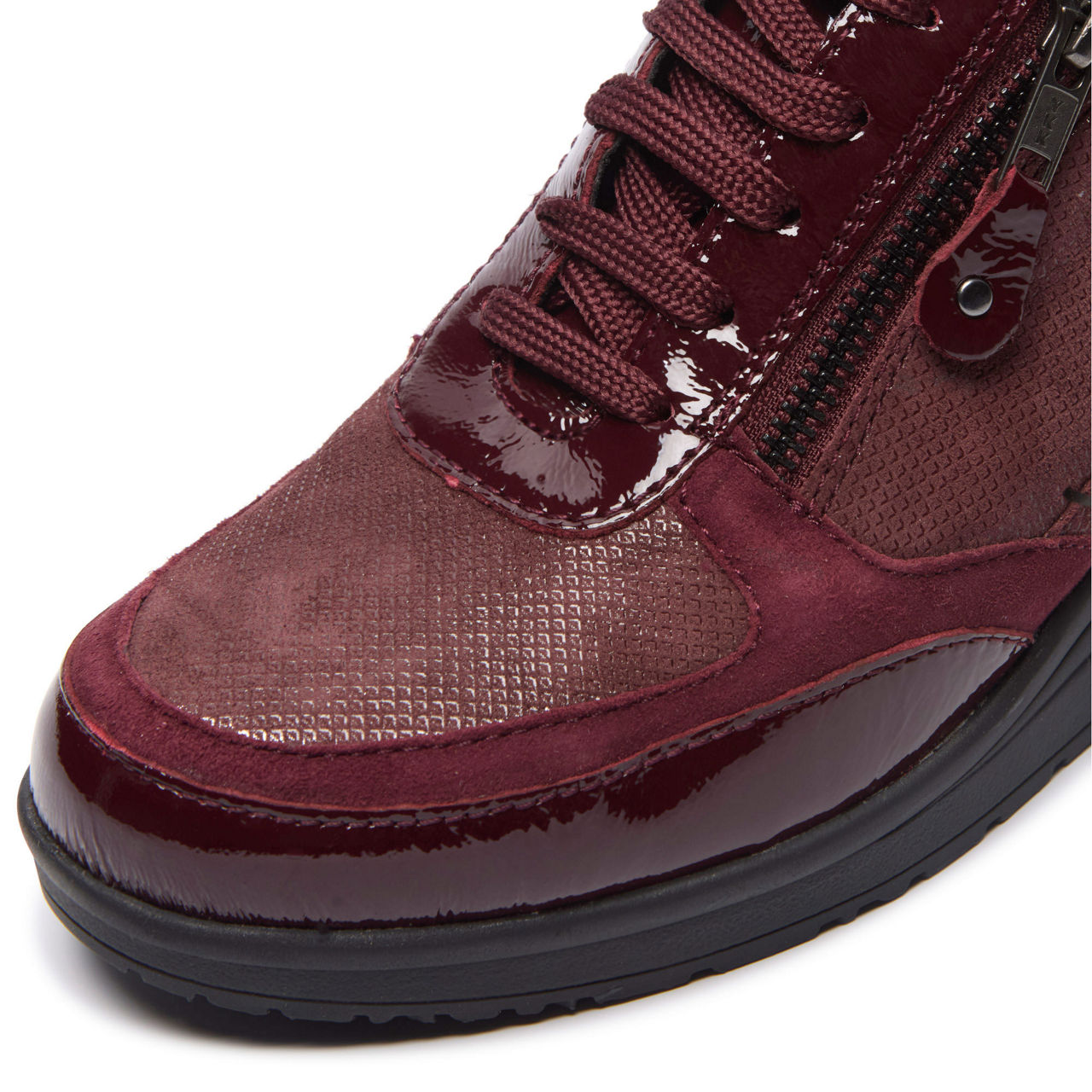 - Suede upper, classic trainer silhouette, rounded toe, patent leather accents, lace-up and zip combination, wedge platform sole, patent leather zip pull