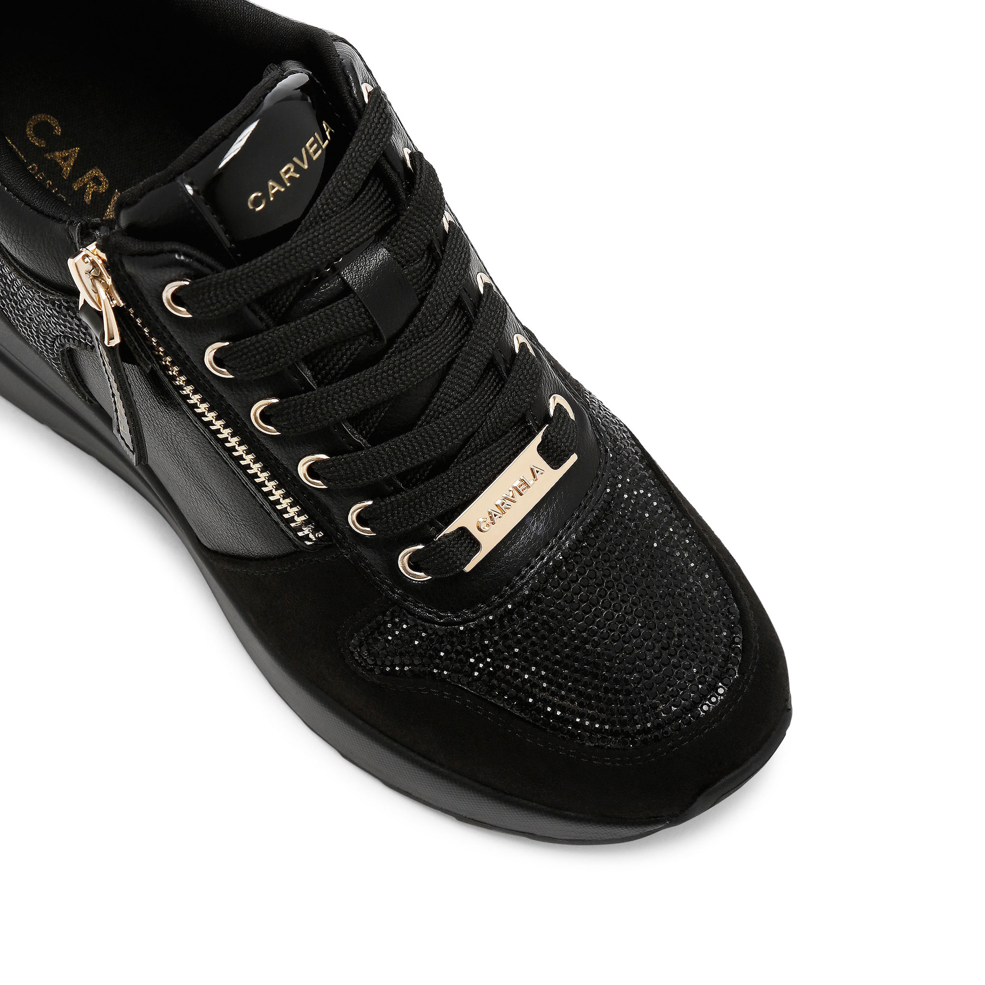- Textured fabric, crystal-embellished panels, front lace-up fastening, gold-tone details, lifted sole