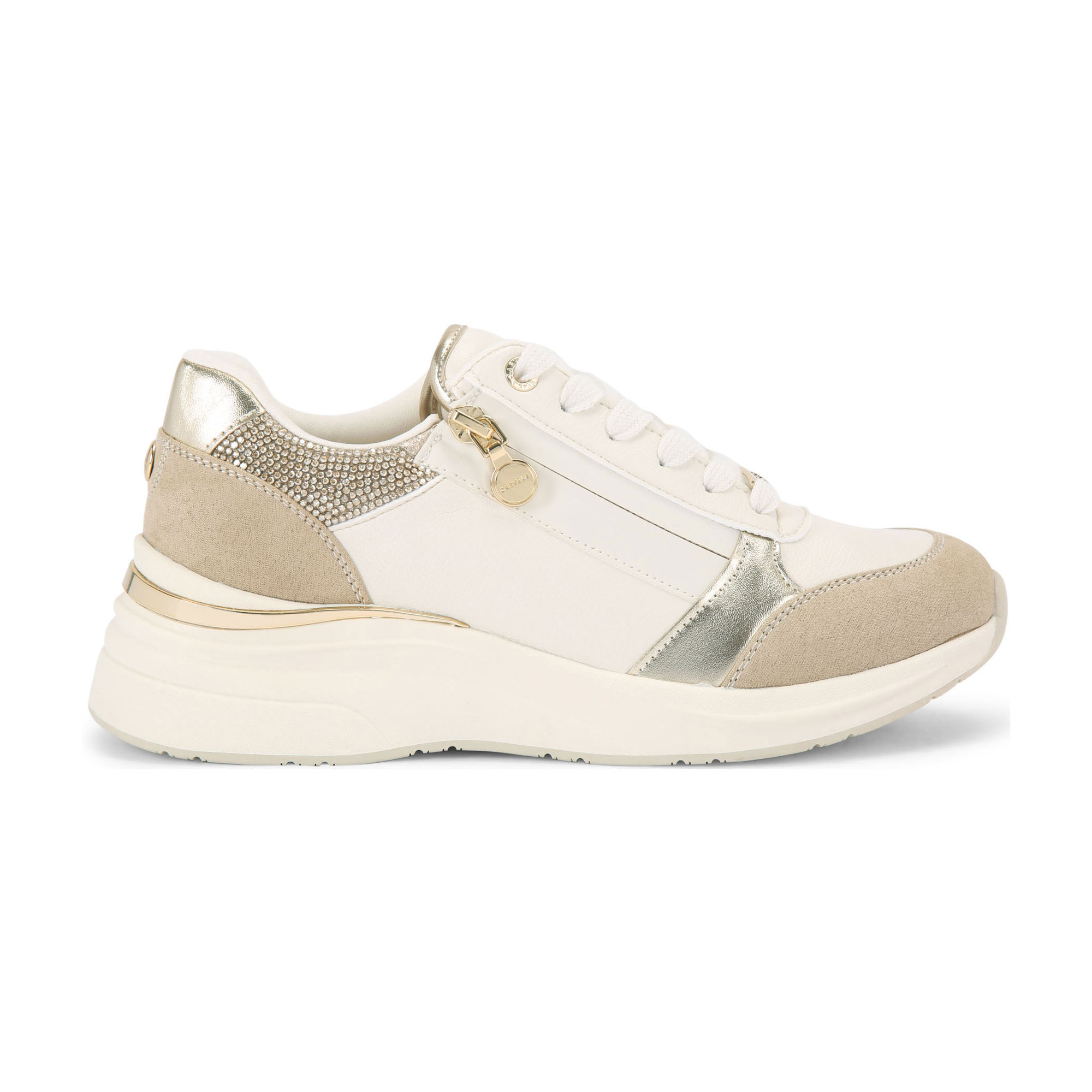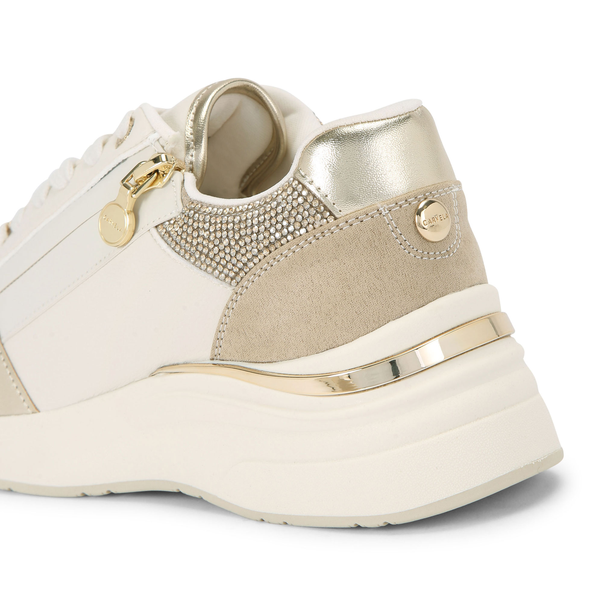 - Lace-up fastening, low-top profile, statement zip with engraved zip pull, patent heel tab, metallic heel accent, gemstone-embellished panel, Icon C stud, wedge sole