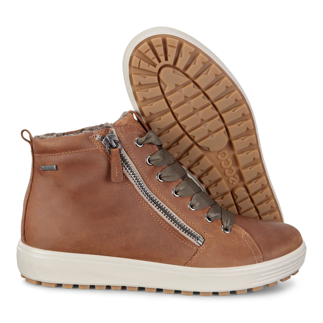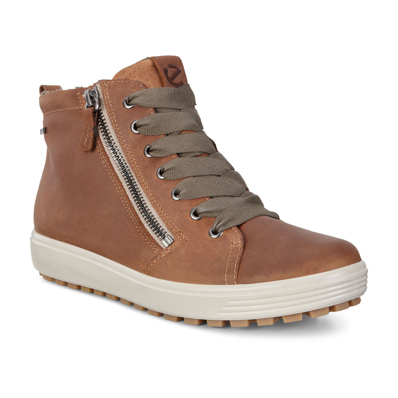 - Made from high quality ECCO leather and punctuated with modern asymmetric zips this lace up SOFT 7 TRED sneaker is a contemporary twist on pared back Scandinavian style. Lined in a soft warm textile lining and set on a durable rubber sole for exceptional grip this high top sneaker is designed to be worn year round. Waterproof Gore Tex technology ensures feet stay dry breathing and comfortable whatever the weather.