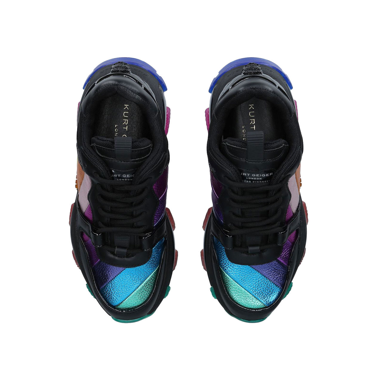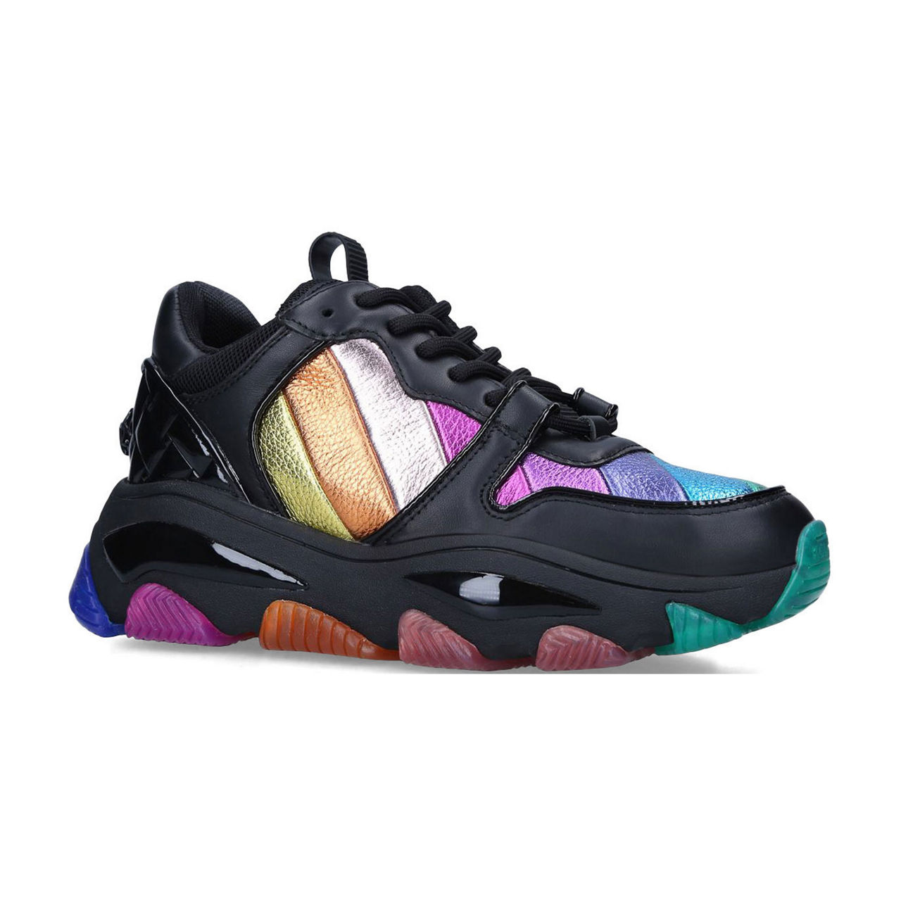 - Round toe, low tops, rainbow metallic stripe panels, lace-up fastening, branded, platform sole, chunky silhouette, eagle head detail at heel