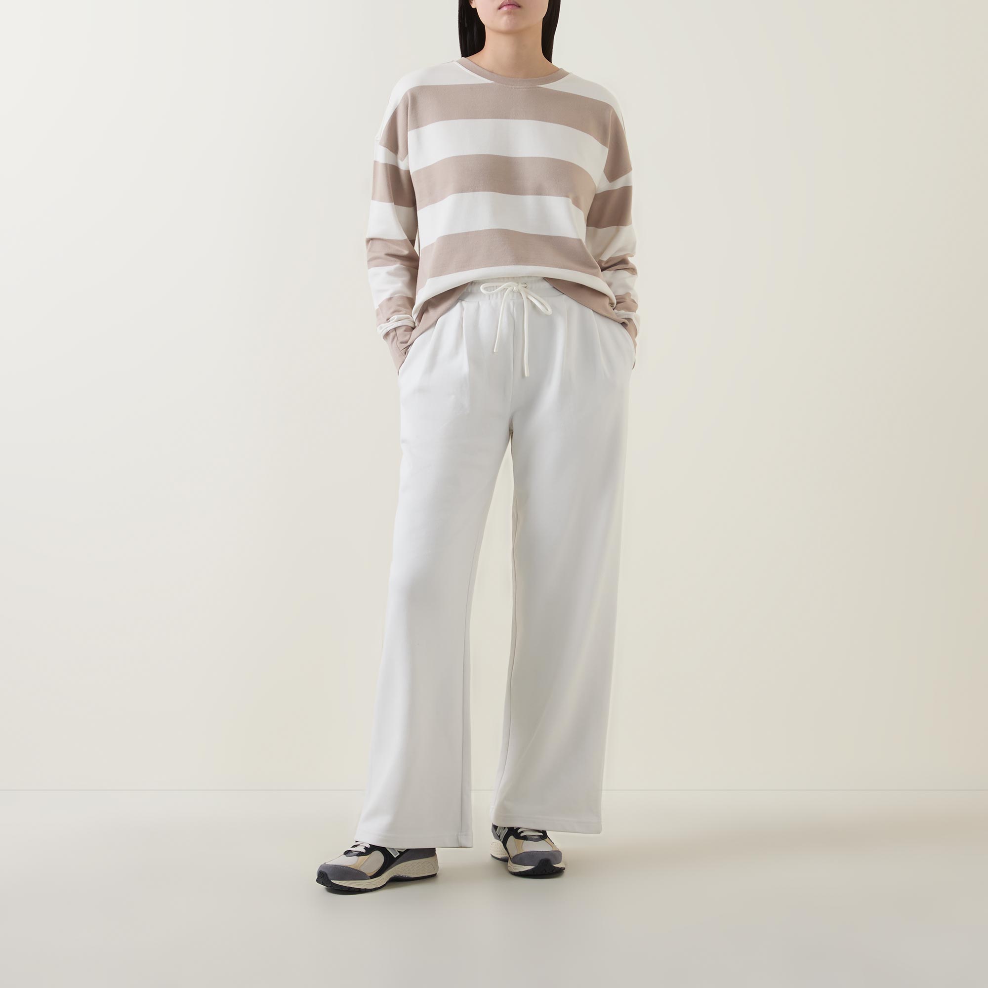 - Features:Wide leg silhouette with elasticated waistband and deep pleat detail, two side slip pockets and one patch pocket on the back
