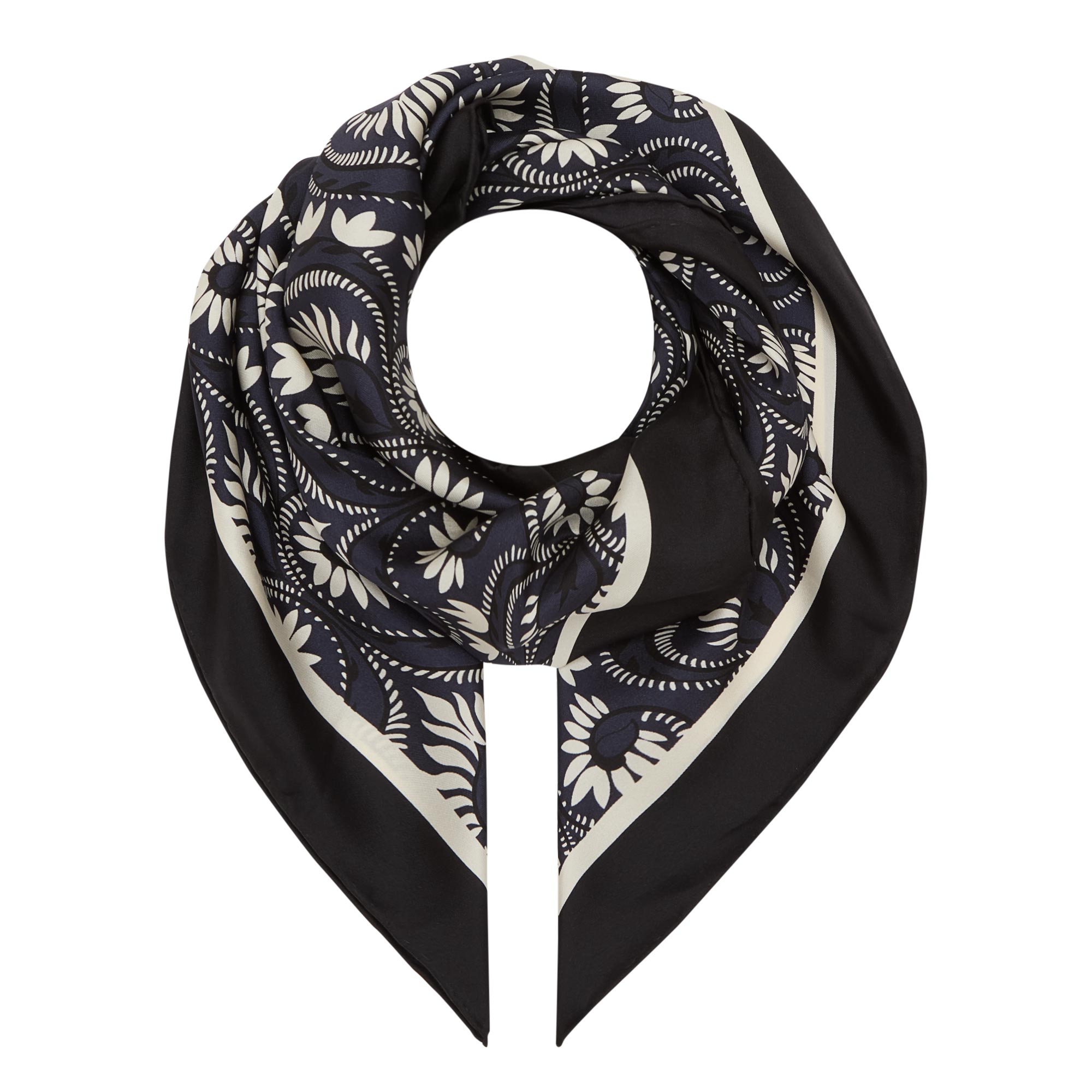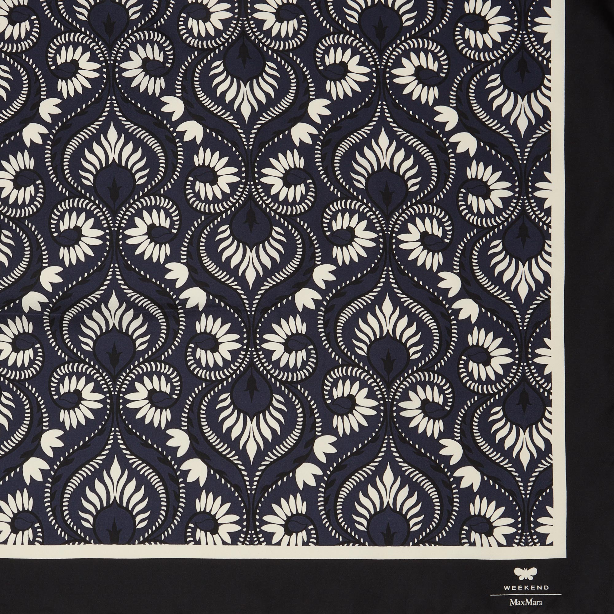 - Square shape, abstract print, border detailing, logo branding, smooth silk finish