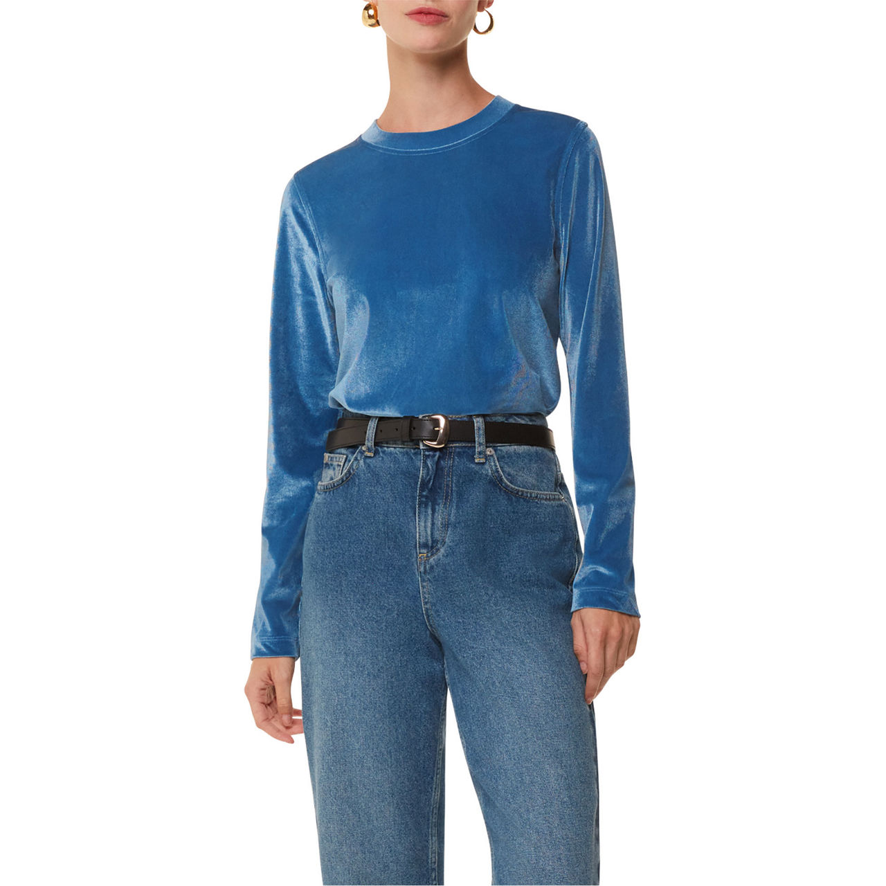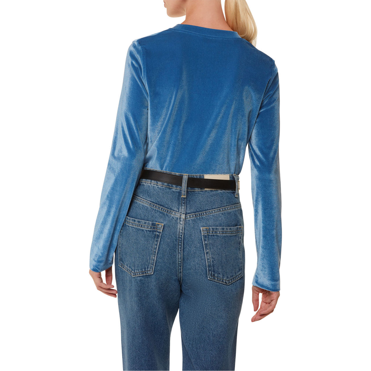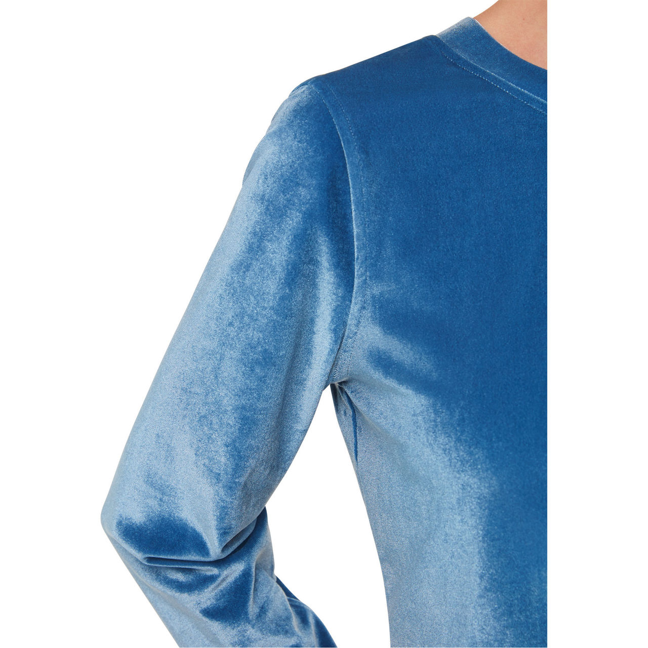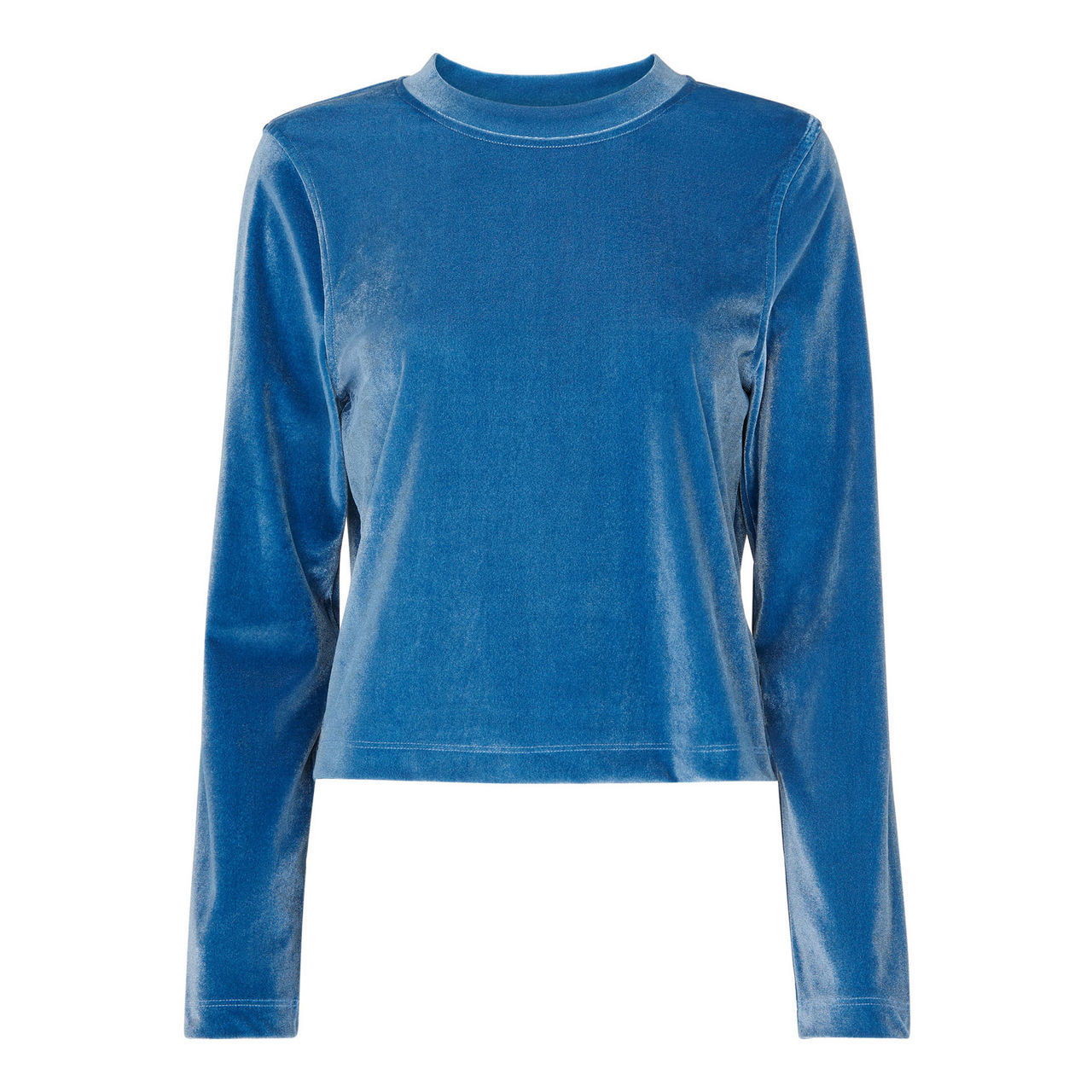 - Crew neckline, long sleeves, tonal stitching, straight hemline, smooth velvet finish