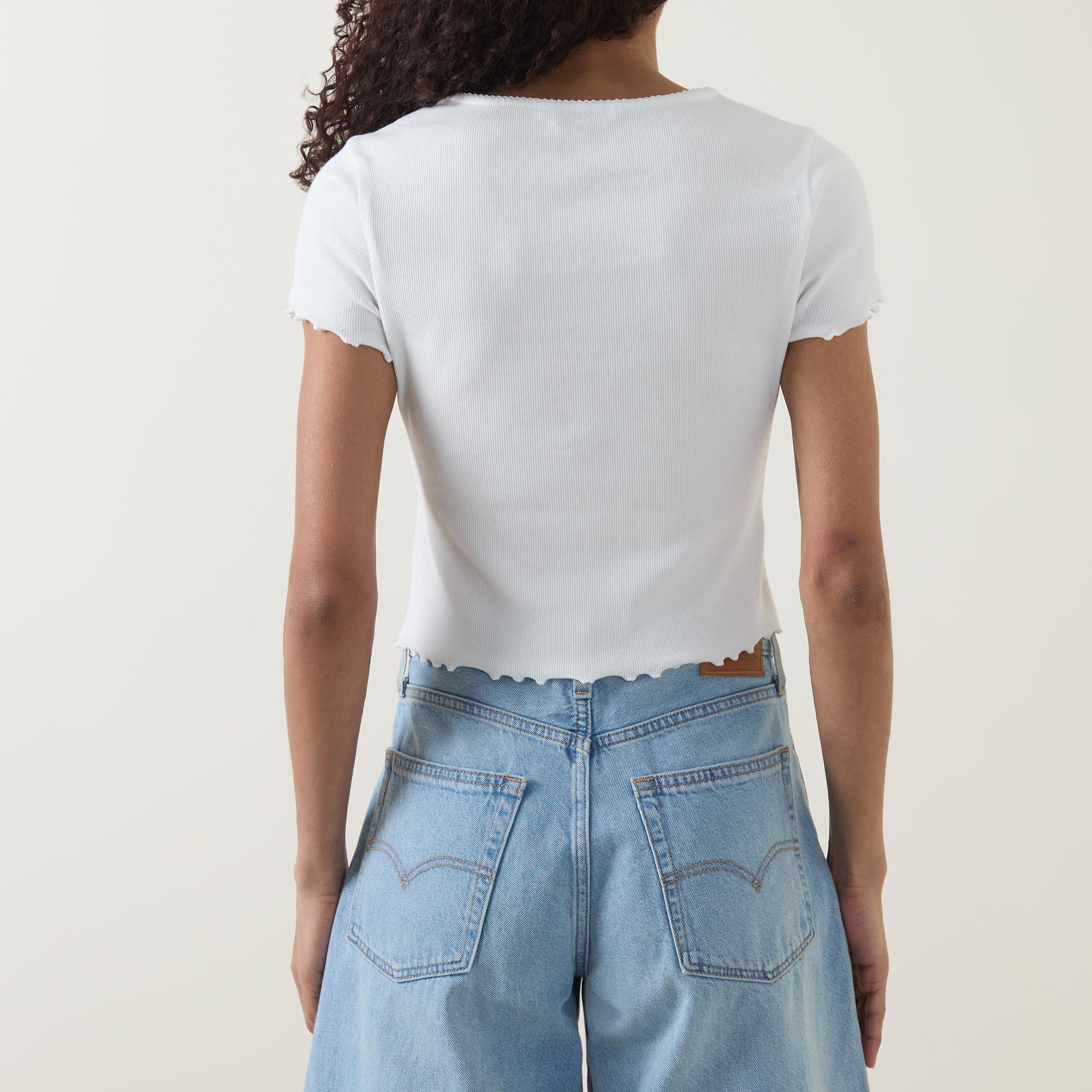 - Round neckline, button fastening, short sleeves, ribbed structure, lettuced trims, embroidered flag logo