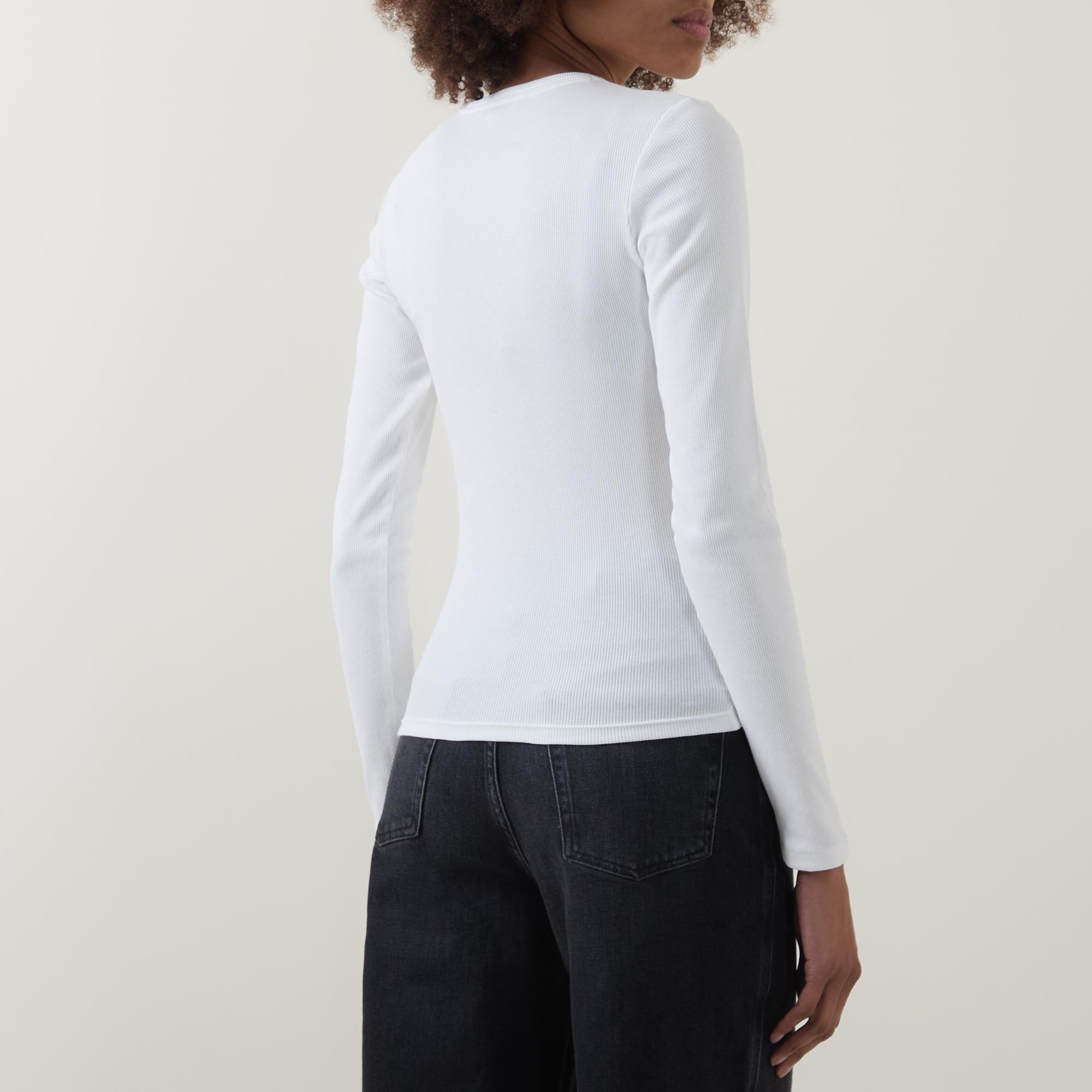 - Round neckline, long sleeves, front logo badge, tonal stitching, straight hemline, smooth fabric