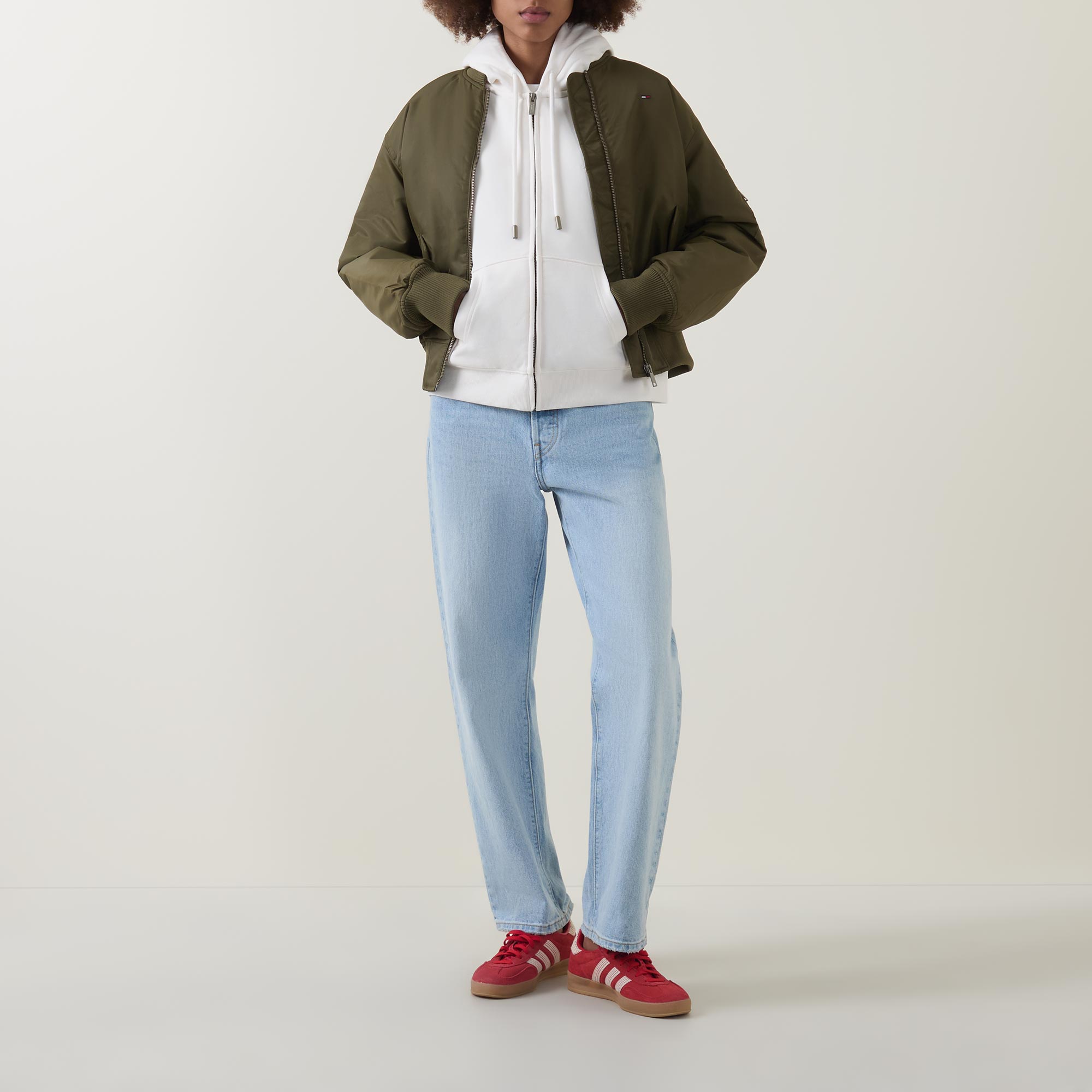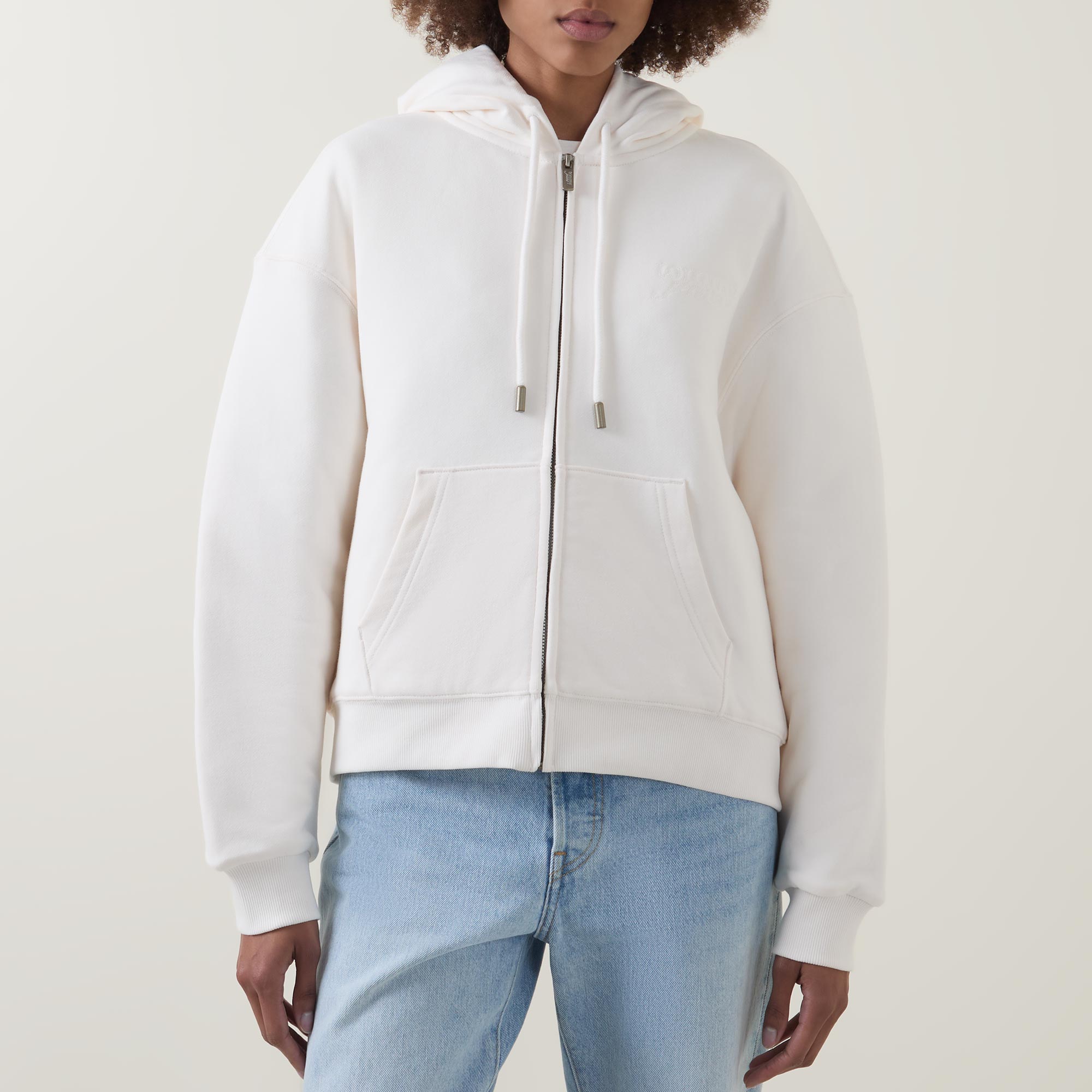 • Adjustable drawstring hood, long sleeves, dropped shoulders, full zip-through fastening, logo script branding, two side pockets, elasticated hemline, stretch cuffs, smooth fabric